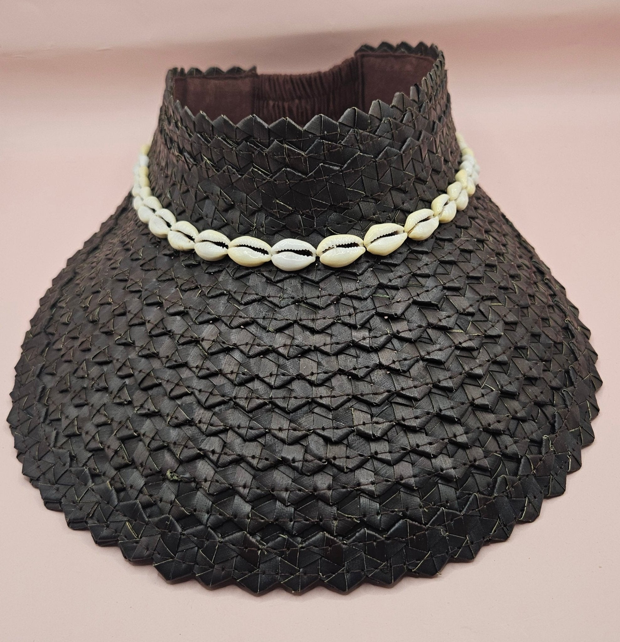 Cowrie Shell Woven Palm Leaf Visor – Handmade Straw Sun Hat with Elastic Band | Black, Blue, Green, or Yellow
