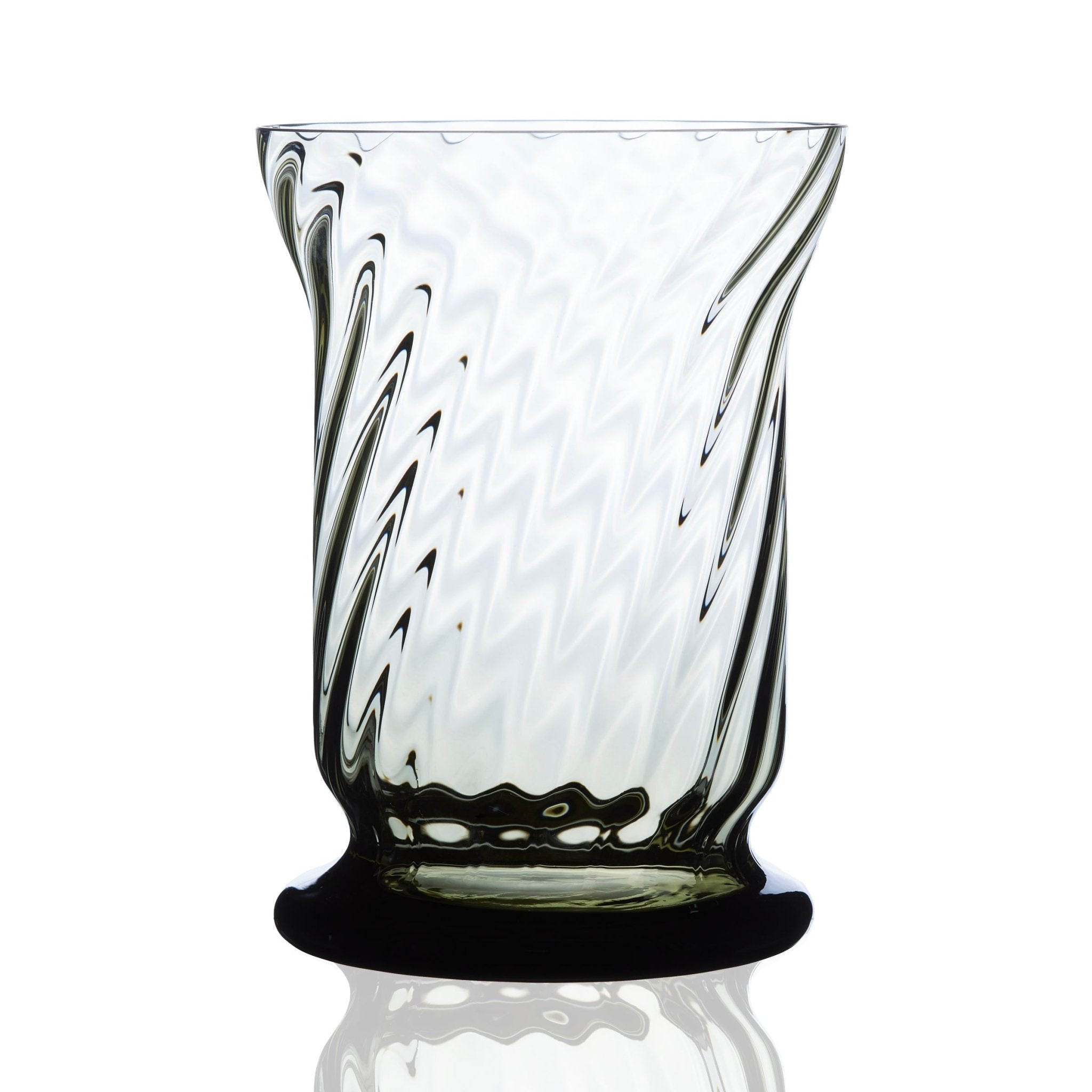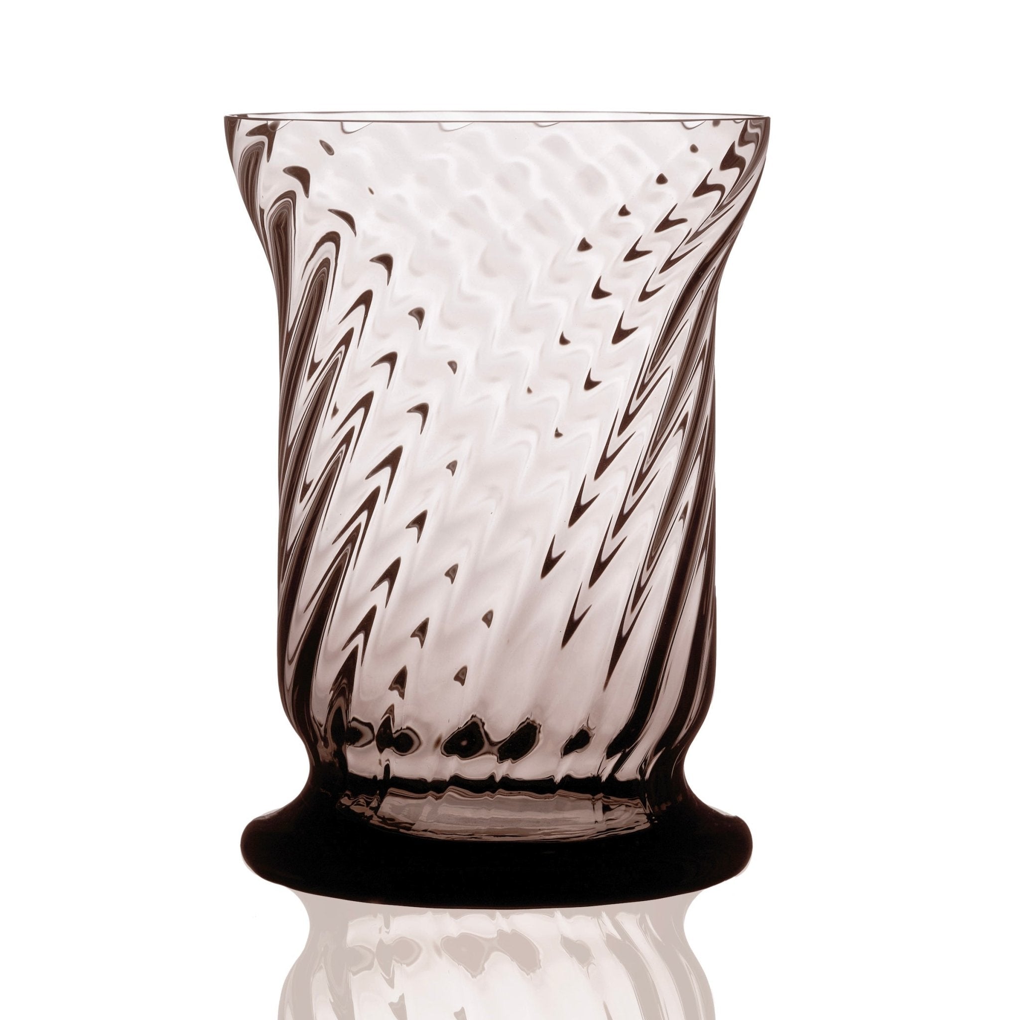 Illuminate your home with the majestic Quinn Boothbay Hurricane. Standing at 9 inches tall with a generous 7-inch width, this mouth-blown crystal vessel makes a commanding centerpiece. Featuring a footed base and a mesmerizing optic swirl texture, it is designed to shelter large pillar candles or display lush floral arrangements, casting a warm, sophisticated glow in any setting.