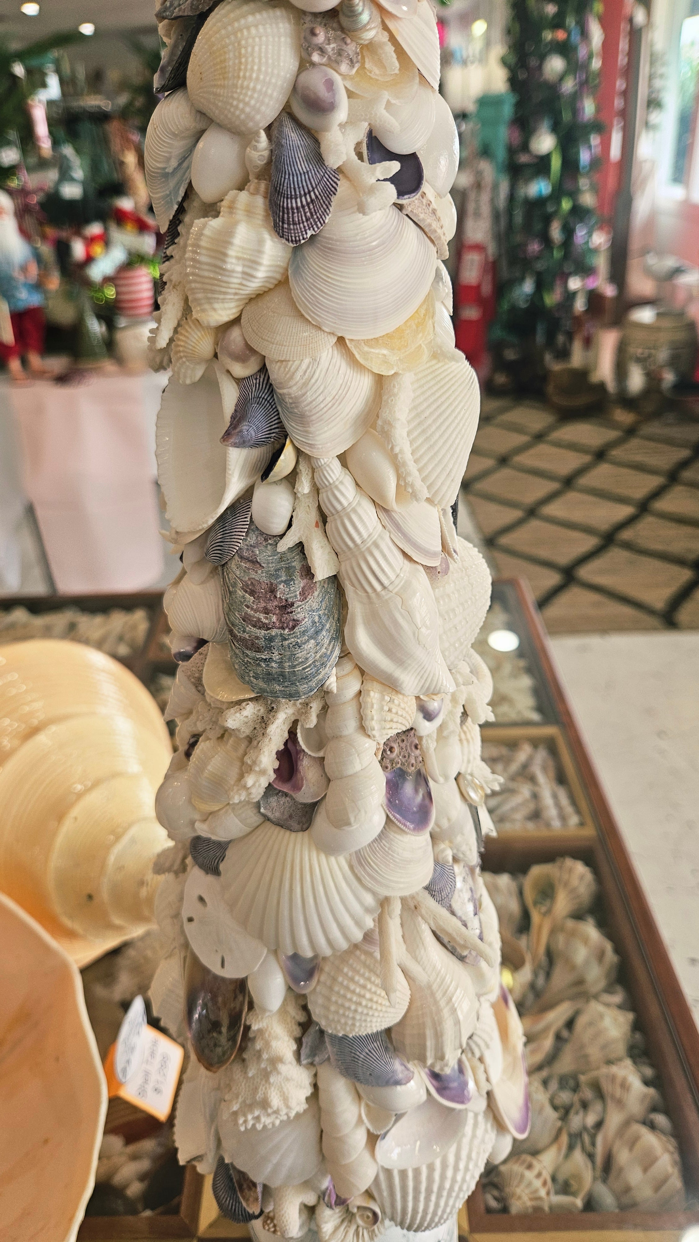 This beautiful, handcrafted Seashell Christmas Tree brings coastal elegance and holiday charm to any room, standing 27.5 inches tall on a painted white pedestal base. Adorned with hundreds of natural white and lavender seashells and topped with a natural starfish, it offers a unique, timeless accent for your beach-themed décor.