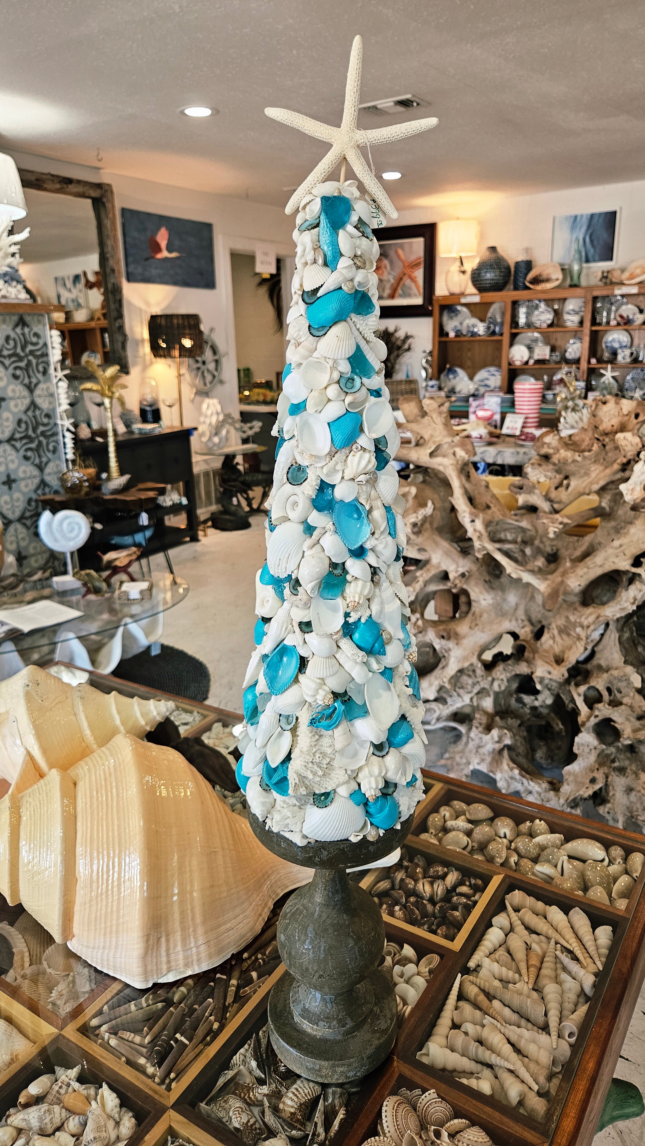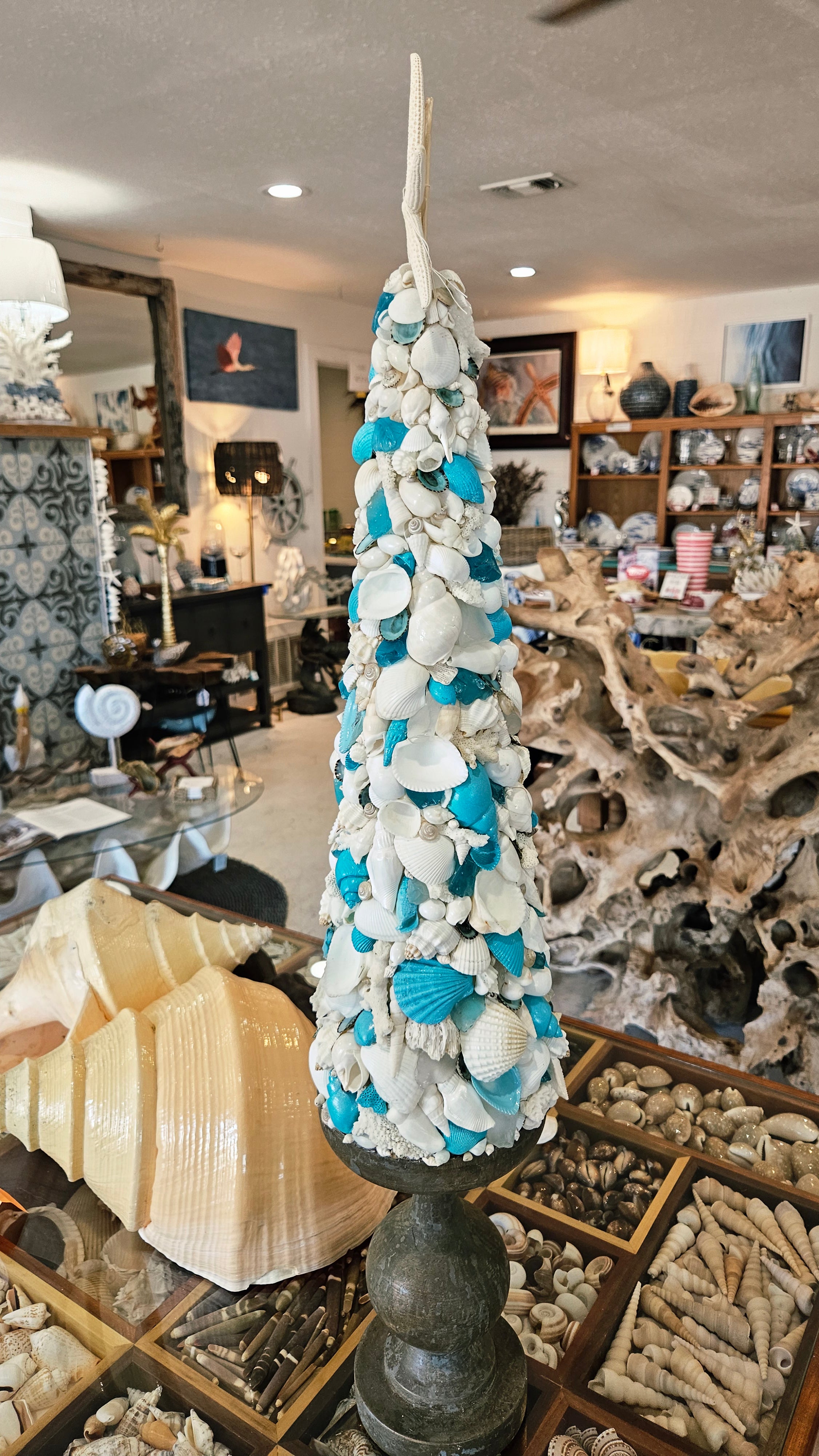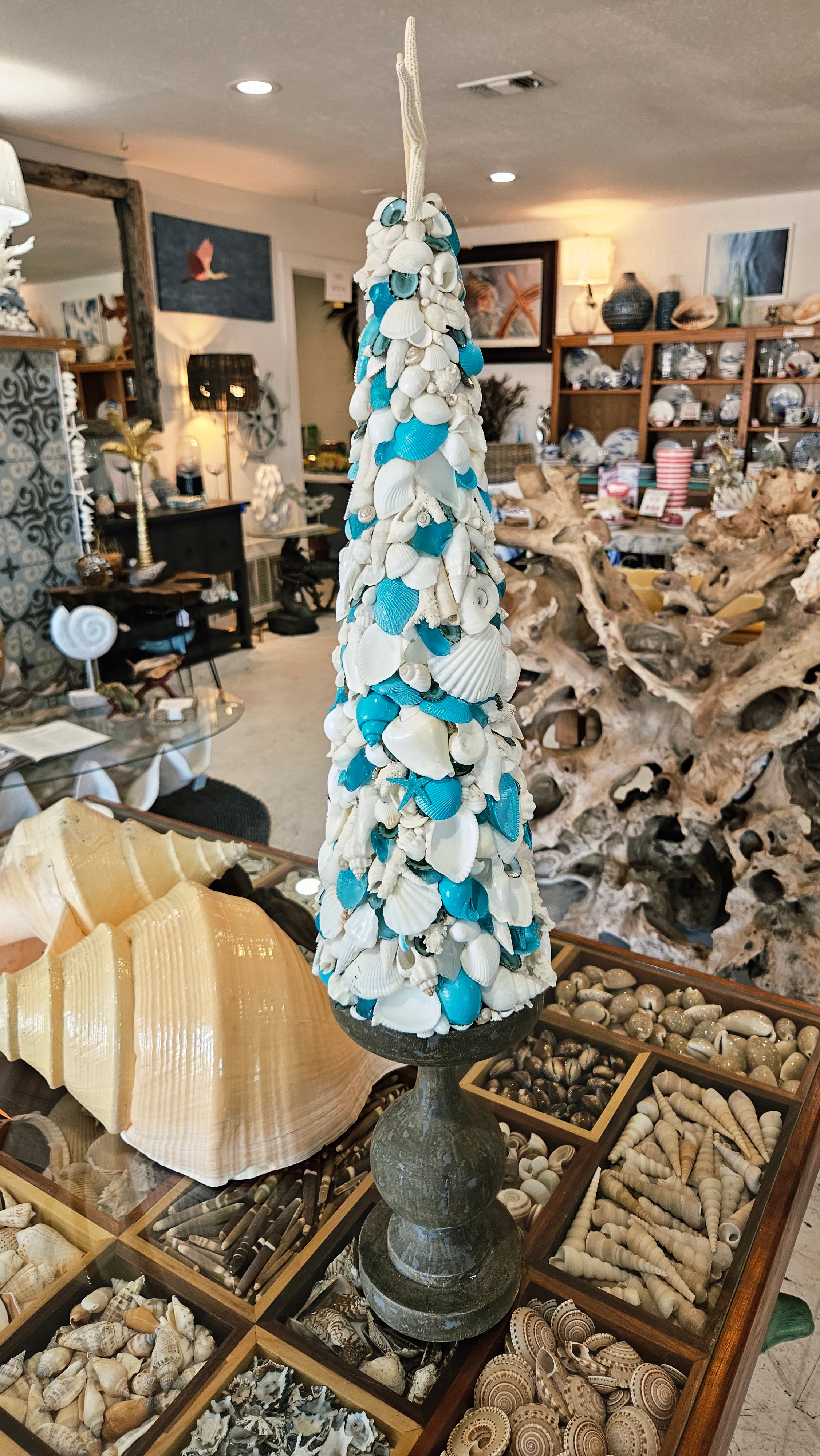 This gorgeous, handcrafted Seashell Tree offers a bold pop of turquoise and white, standing $31.75$ inches tall on a striking antique-finished pedestal base. Adorned with natural white and vibrant blue shells and topped with a delicate starfish, it’s a perfect, eye-catching accent for luxury coastal décor.