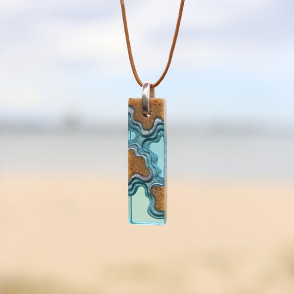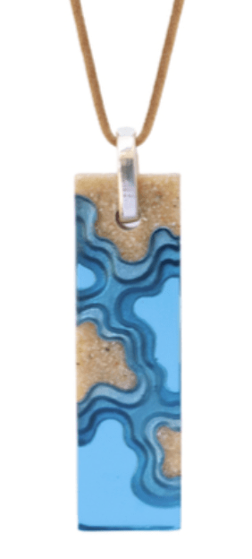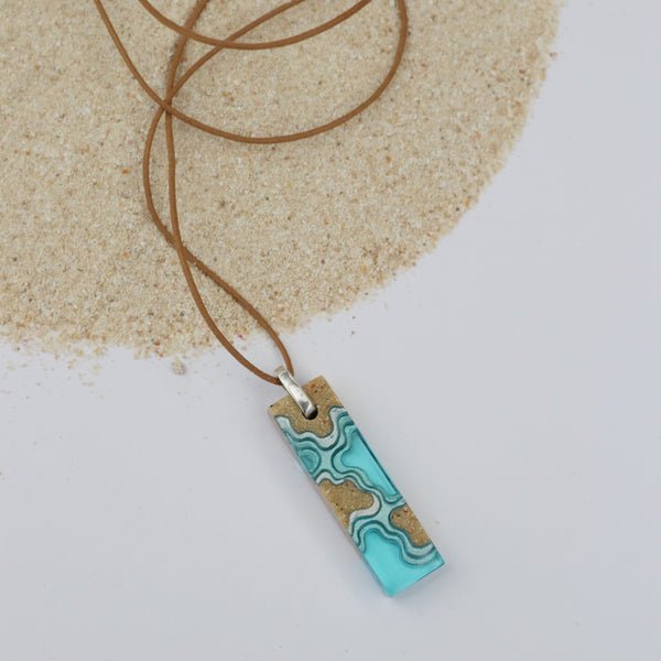 The Islands Necklace captures the tranquil beauty of coastal landscapes, where sand and sea meet in layered harmony. Each handcrafted pendant features bonded beach sand and richly pigmented resin in Aqua or Ultramarine, forming elegant patterns reminiscent of islands rising from the ocean.