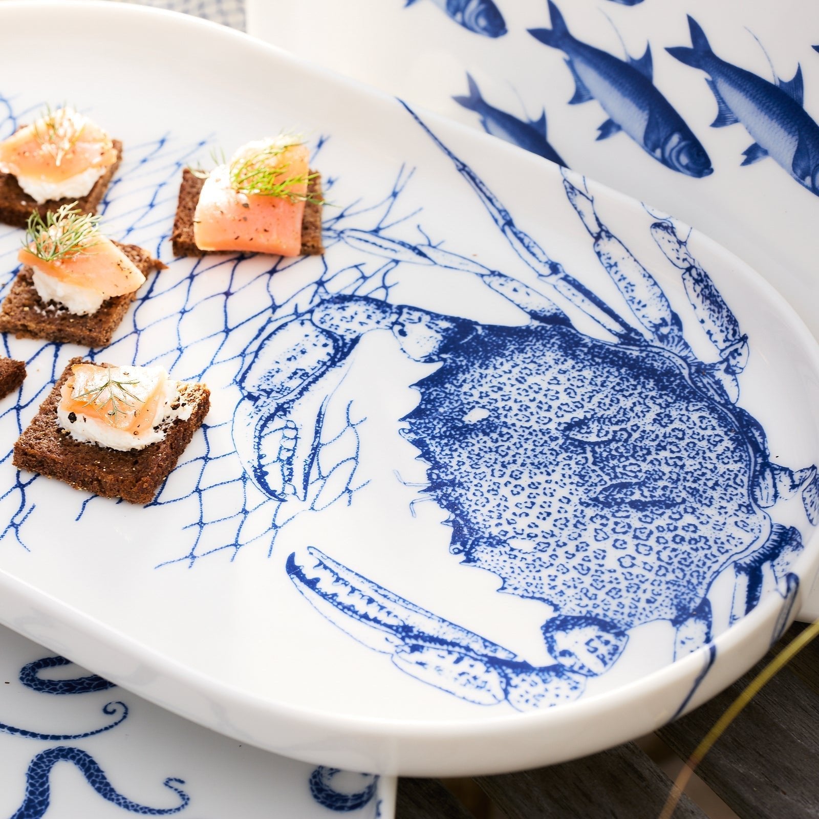 Elevate your table setting with this stunning Blue Crab Large Coupe Oval Platter, featuring a classic navy blue crustacean and fishing net design. Crafted from durable, high-fired porcelain, this coastal serving dish is perfect for seafood feasts and adds a touch of nautical elegance to any dining experience.