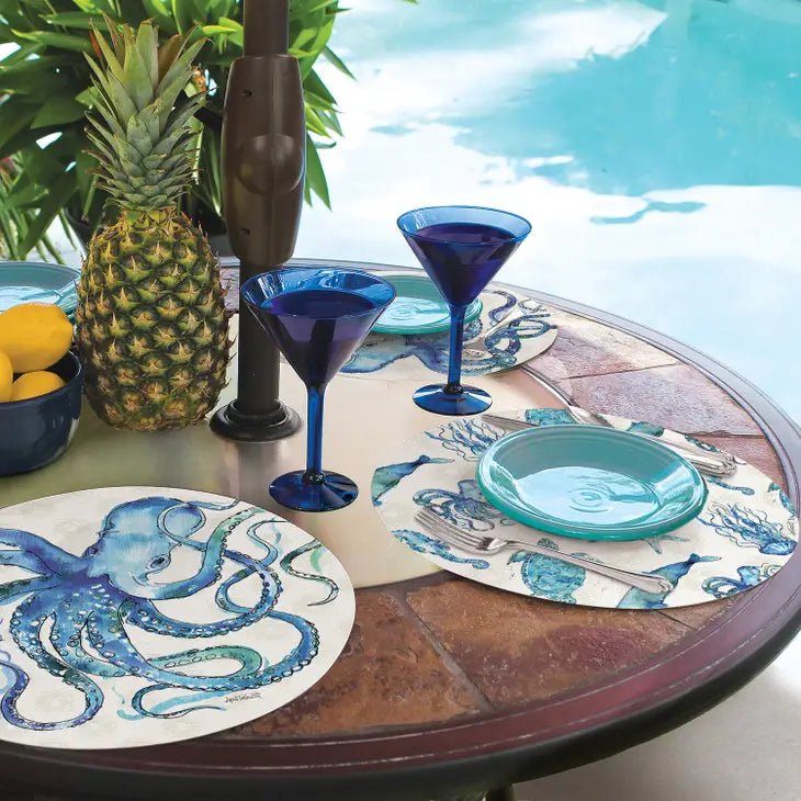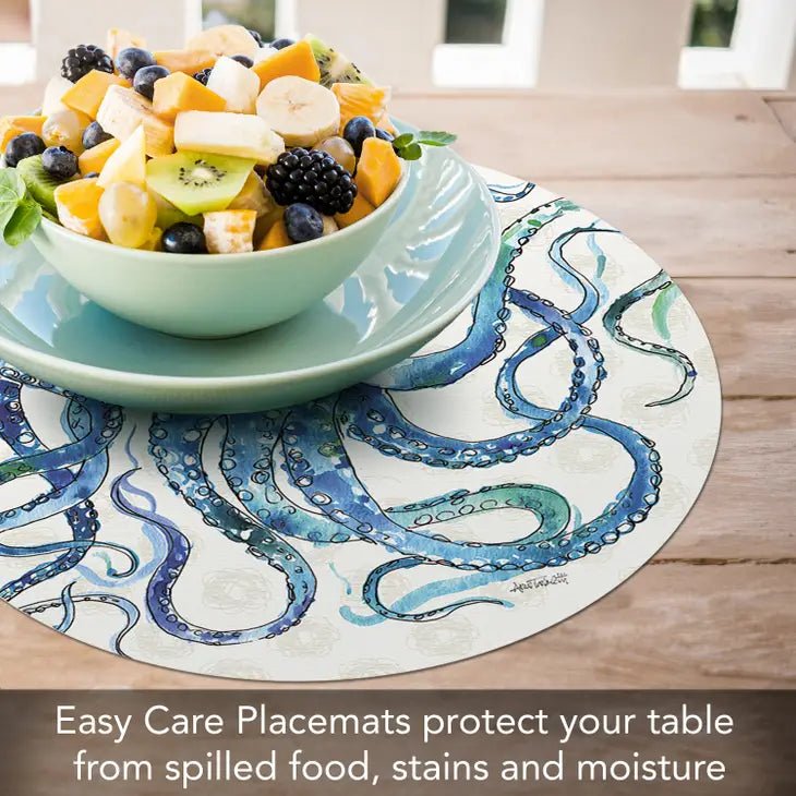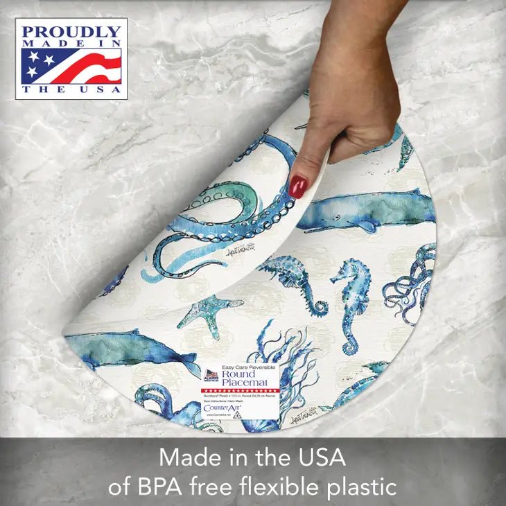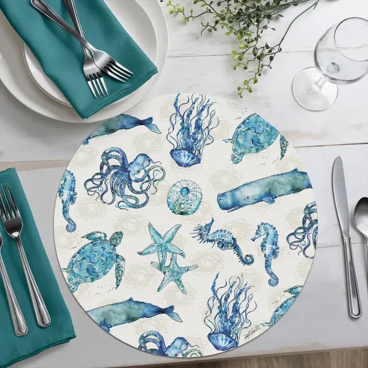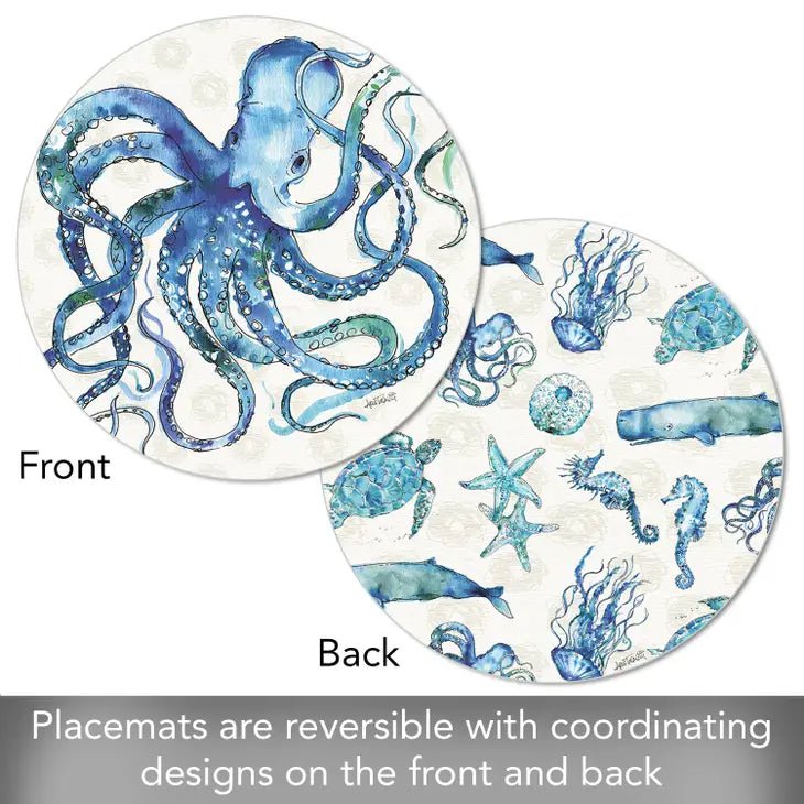 Bring coastal cool to your table with the Deep Sea Reversible Placemat. One side features a striking blue octopus, while the reverse showcases an array of sea life — turtles, starfish, seahorses, and coral — all in soothing ocean hues.