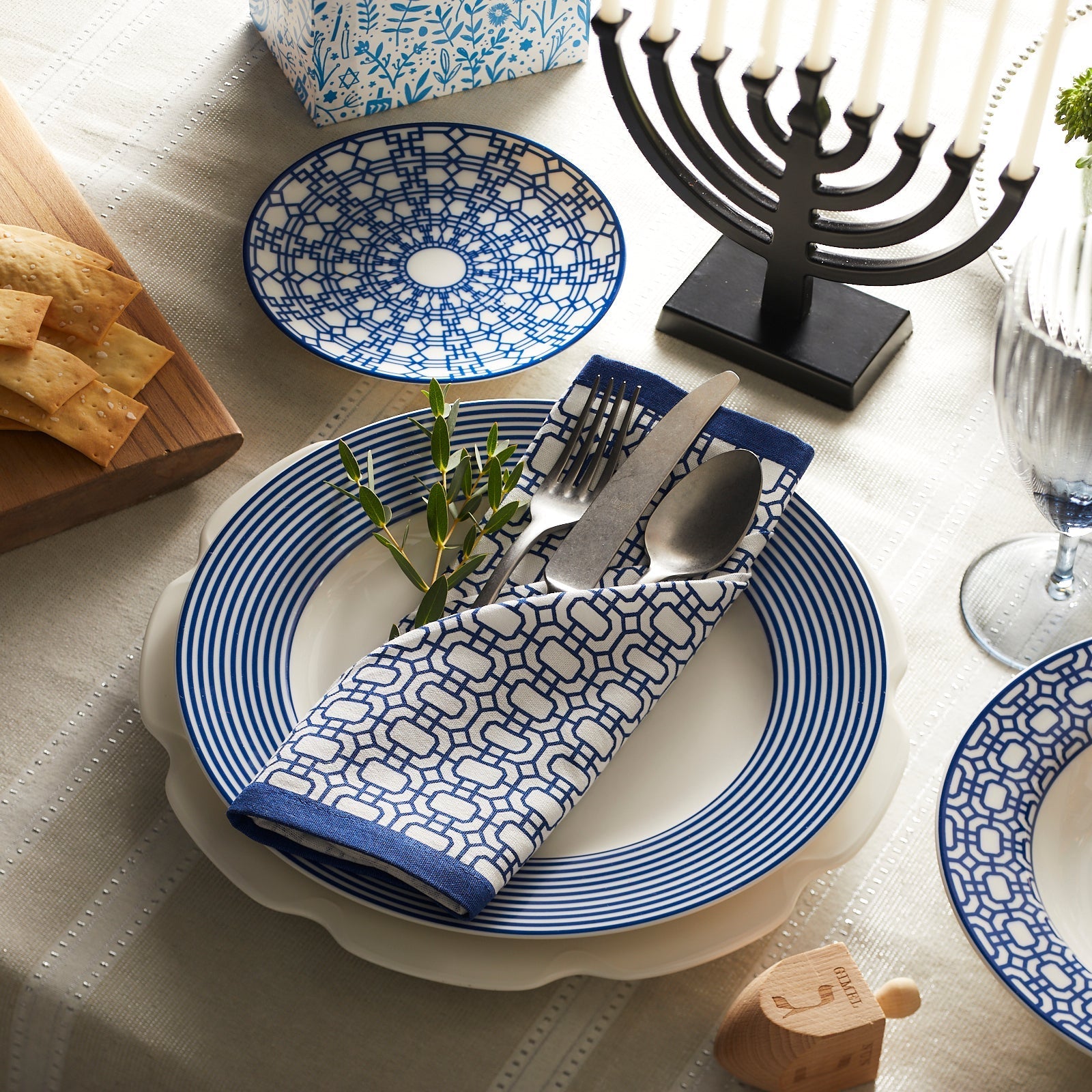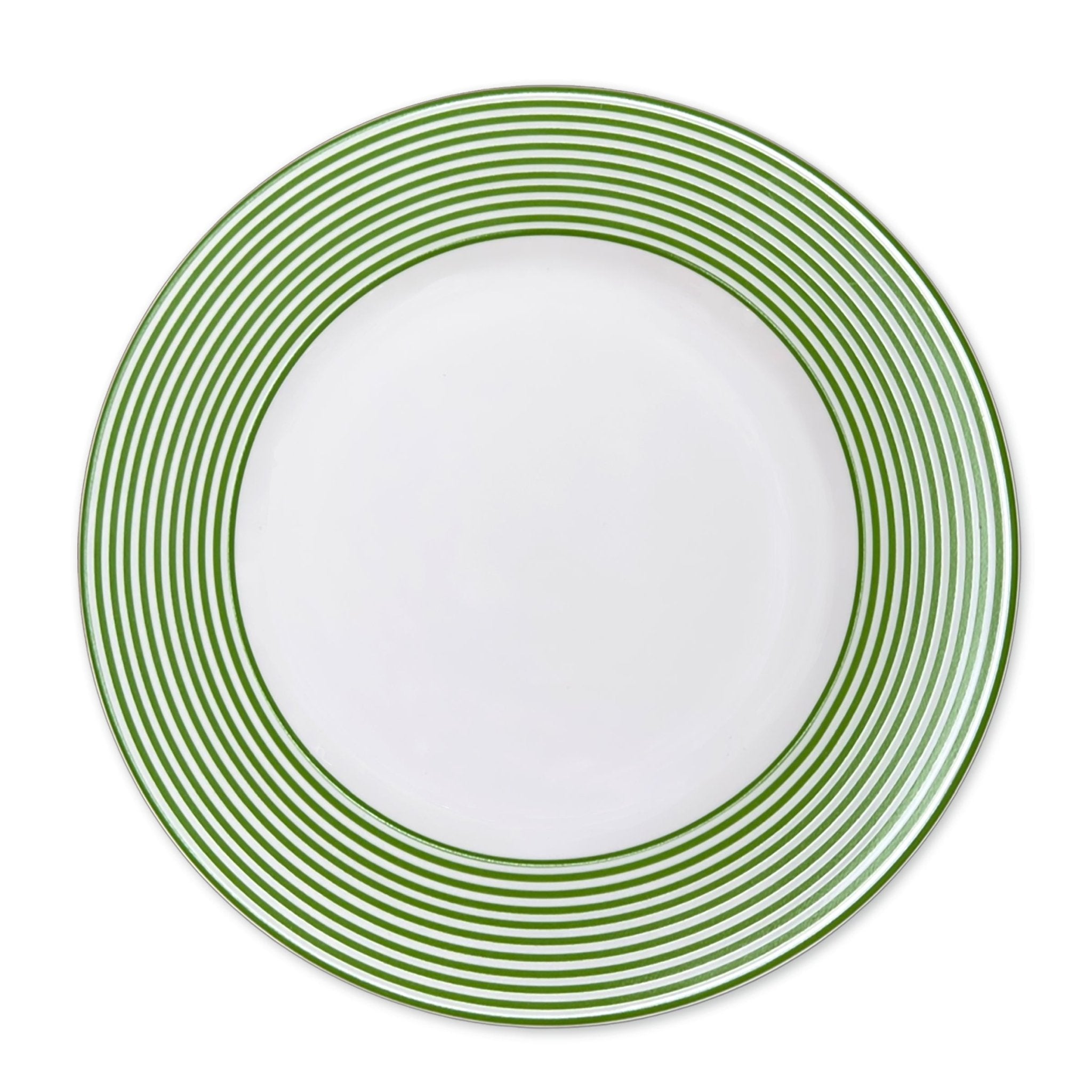 Set a crisp, classic table with the Newport Stripe Rimmed Dinner Plate. Featuring a bold concentric ring pattern along the rim, this 10.75" porcelain plate brings a timeless bistro or coastal feel to your dining room. Available in three versatile colors—Blue, Red, and Green—these plates are designed to mix and match beautifully with our "Garden Gate" geometric collections for a curated, preppy aesthetic.