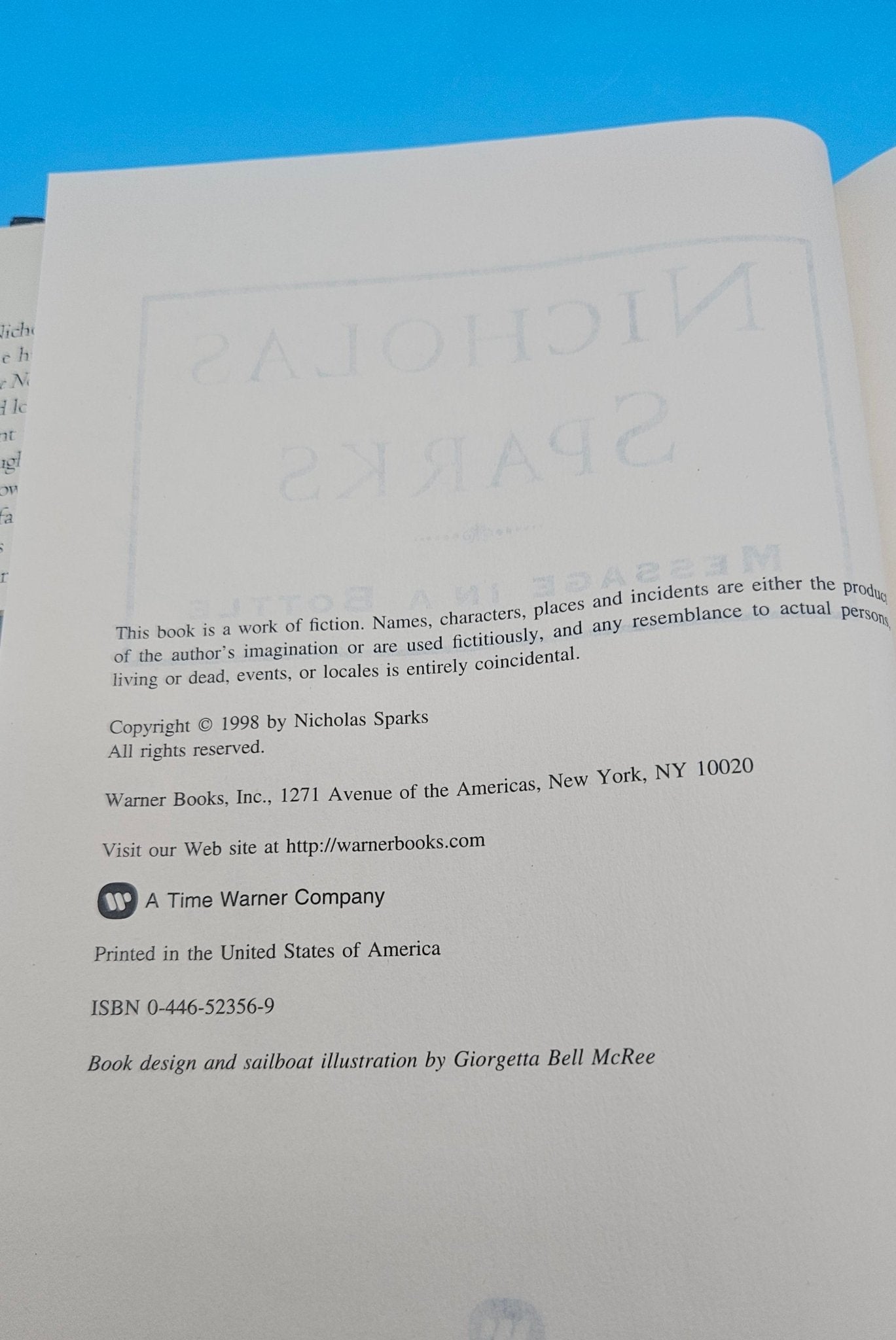 From the New York Times bestselling author of The Notebook, Message in a Bottle is a moving novel of love, loss, and fate. This 1998 hardcover first edition from Warner Books features the iconic cover art of a sailboat cutting through ocean waves, illustrated by Giorgetta Bell McRee. A perfect addition for Nicholas Sparks fans, romance readers, or collectors of modern popular fiction.