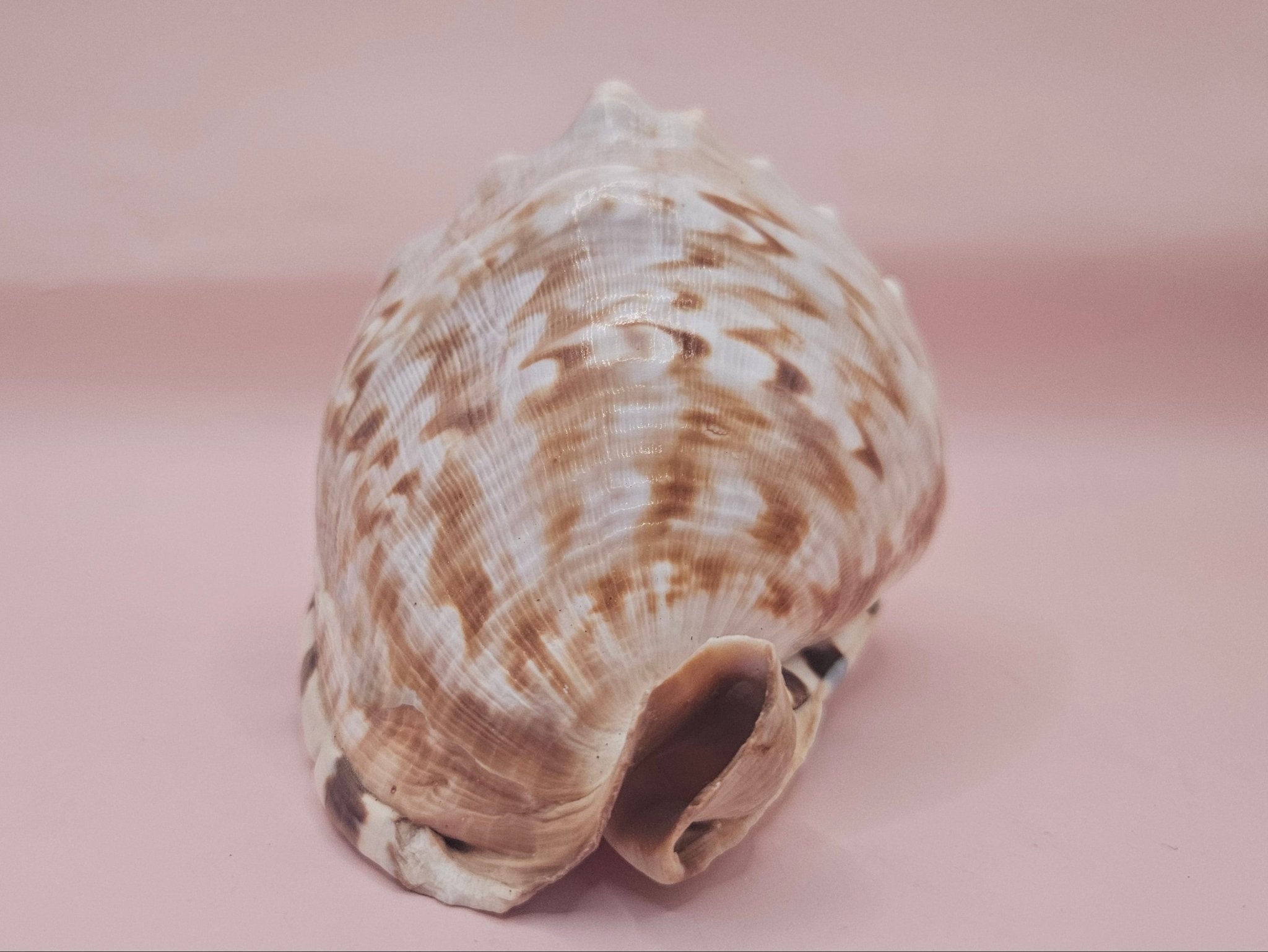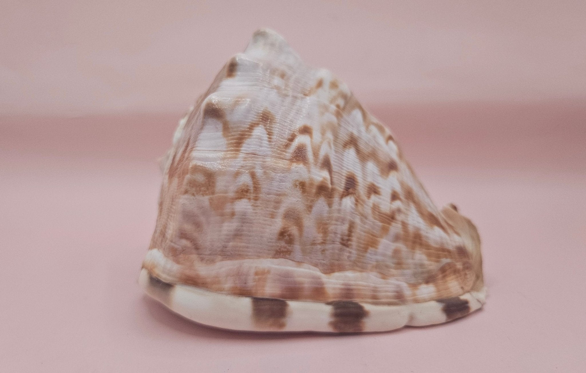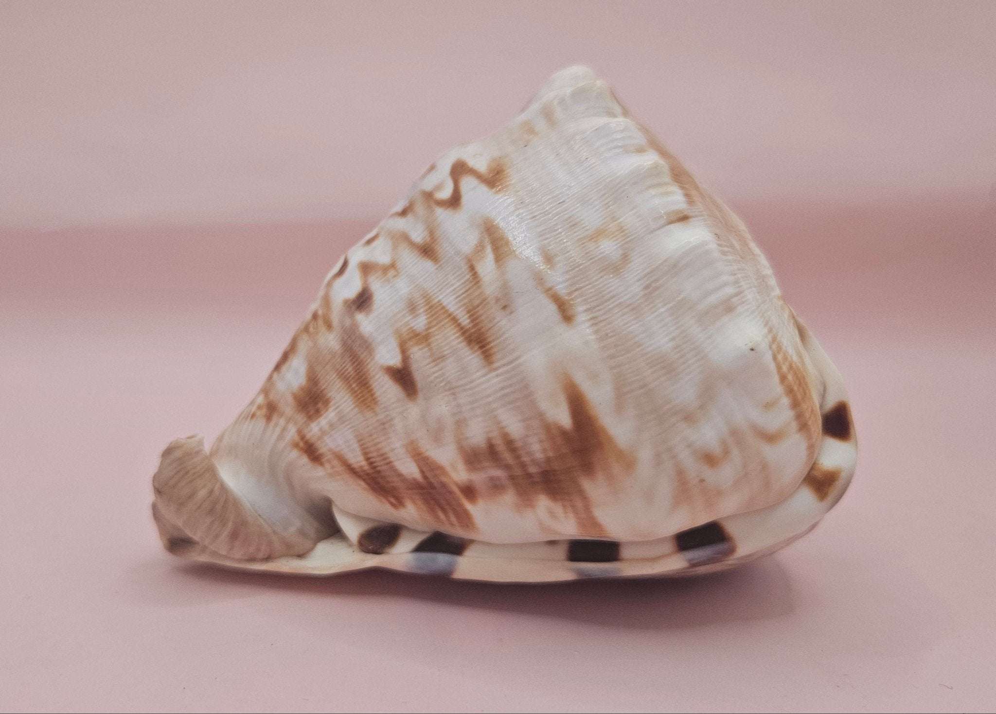 This large King Helmet Cassis flammea Shell is a bold, eye-catching perfect piece for bringing coastal energy into your home decor. With its distinctive shape and eye catching color, it adds a sculptural, ocean-inspired touch to shelves, entry tables, or styled vignettes.