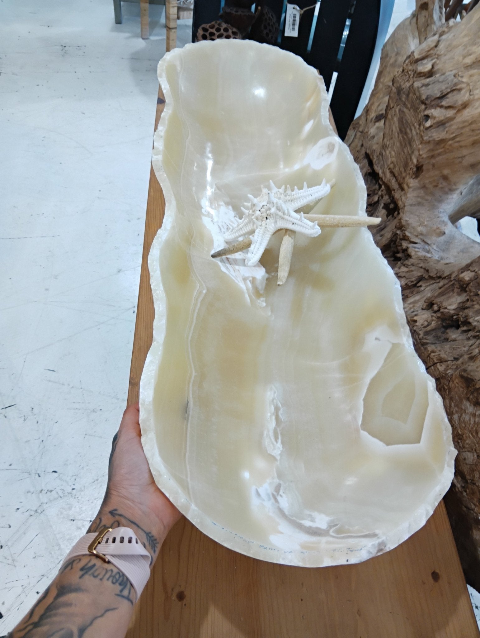 Elevate your interior décor with this exquisite hand-carved Honey Onyx Bowl, a statement piece that radiates natural luxury and timeless elegance. Measuring an impressive 34" in length, this one-of-a-kind onyx vessel showcases soft amber tones and translucent veining unique to this prized stone. Perfect as a dramatic table centerpiece, a coastal-inspired catchall, or a sculptural accent in any refined setting, this substantial piece invites both visual and tactile admiration.