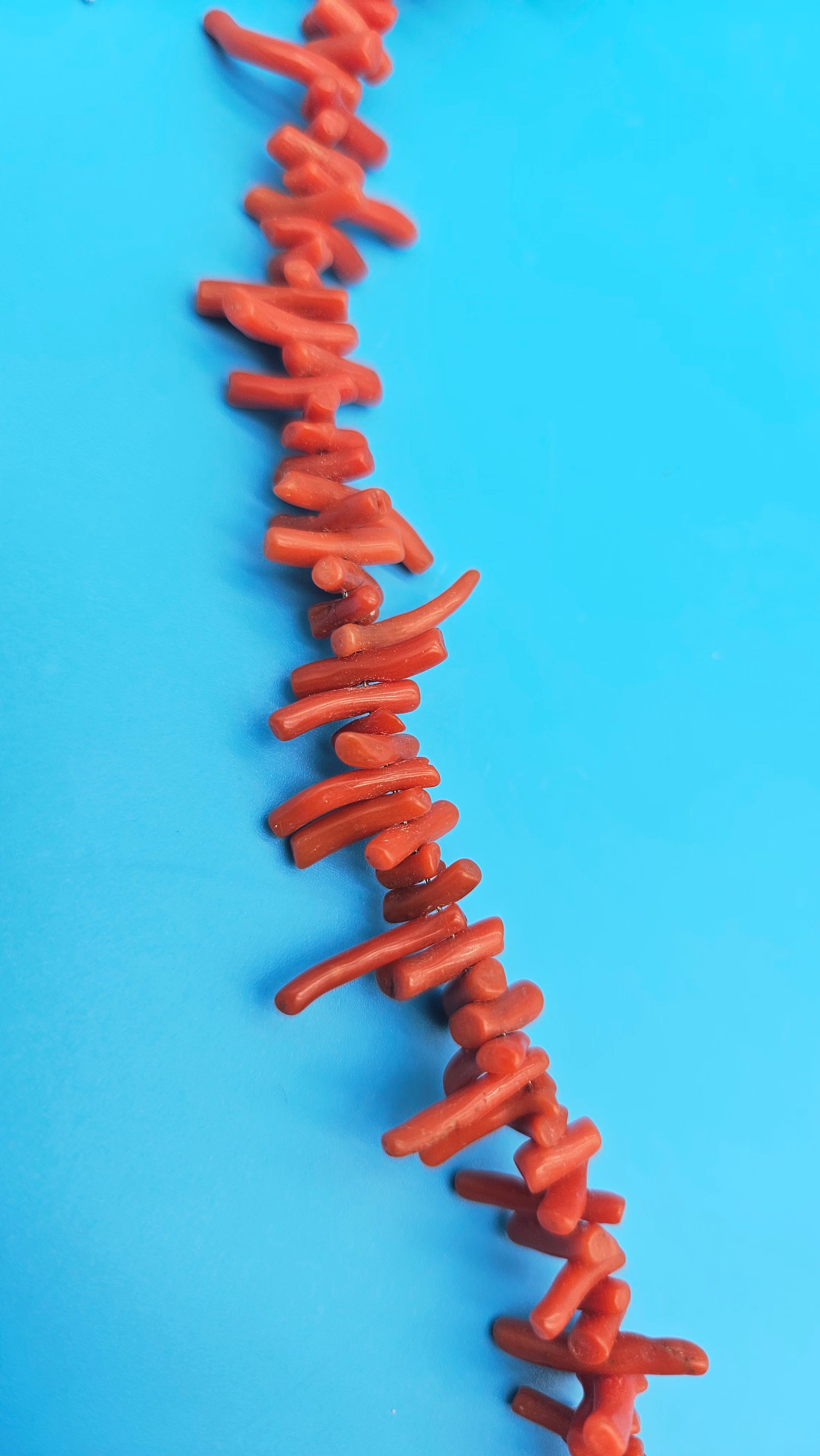 These Mediterranean Red Coral stick beads are premium material for jewelry making, valued for their natural, rustic beauty and vibrant color. This generous 35g strand offers excellent value for designers.