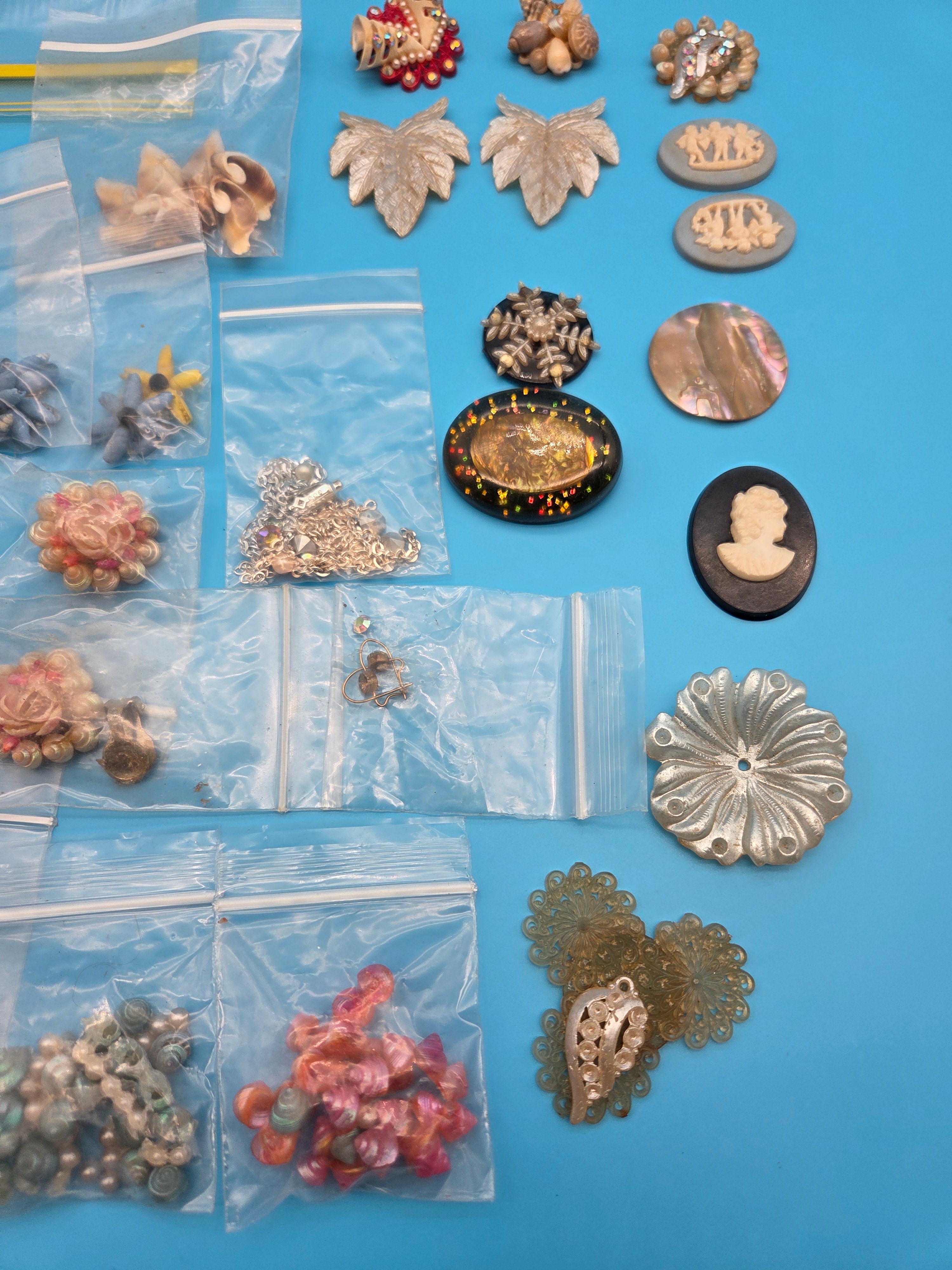 As shown, multiple crafters pieces from an estate buy out, estimated age 1960-70's. Fun for jewelry or collage projects. Some pieces are in need of repair or cleaning.