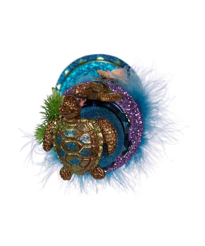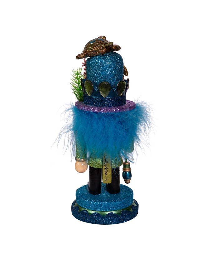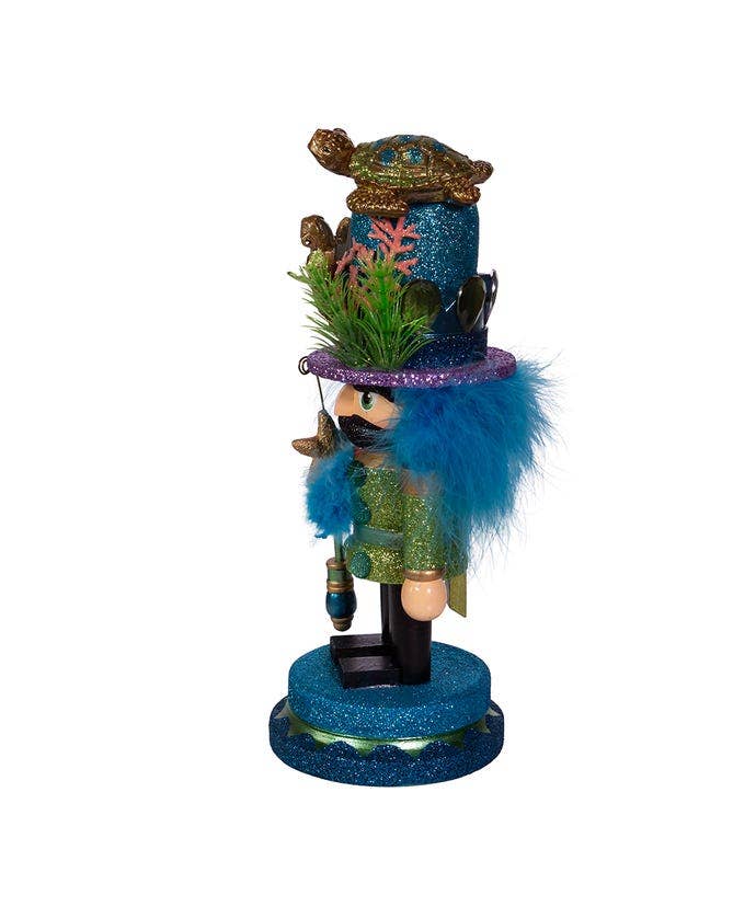 Bring the magic of the seaside to your holiday celebrations with our 11" Hollywood Nutcracker with Sea Turtle Hat by Kurt S. Adler. This whimsical piece combines classic Christmas charm with a splash of coastal flair. Featuring glittering turquoise hues, feathered accents, and sea turtle embellishments atop a coral-trimmed hat, this nutcracker is the perfect fusion of festive and beachy.