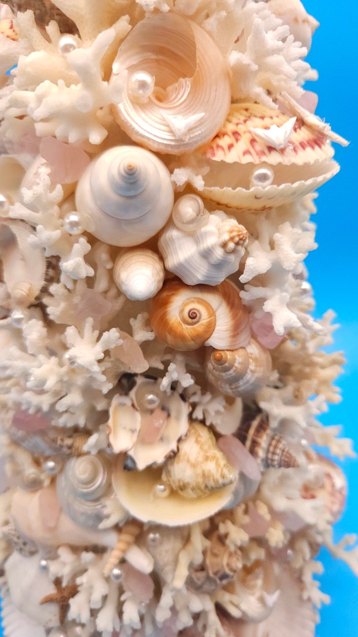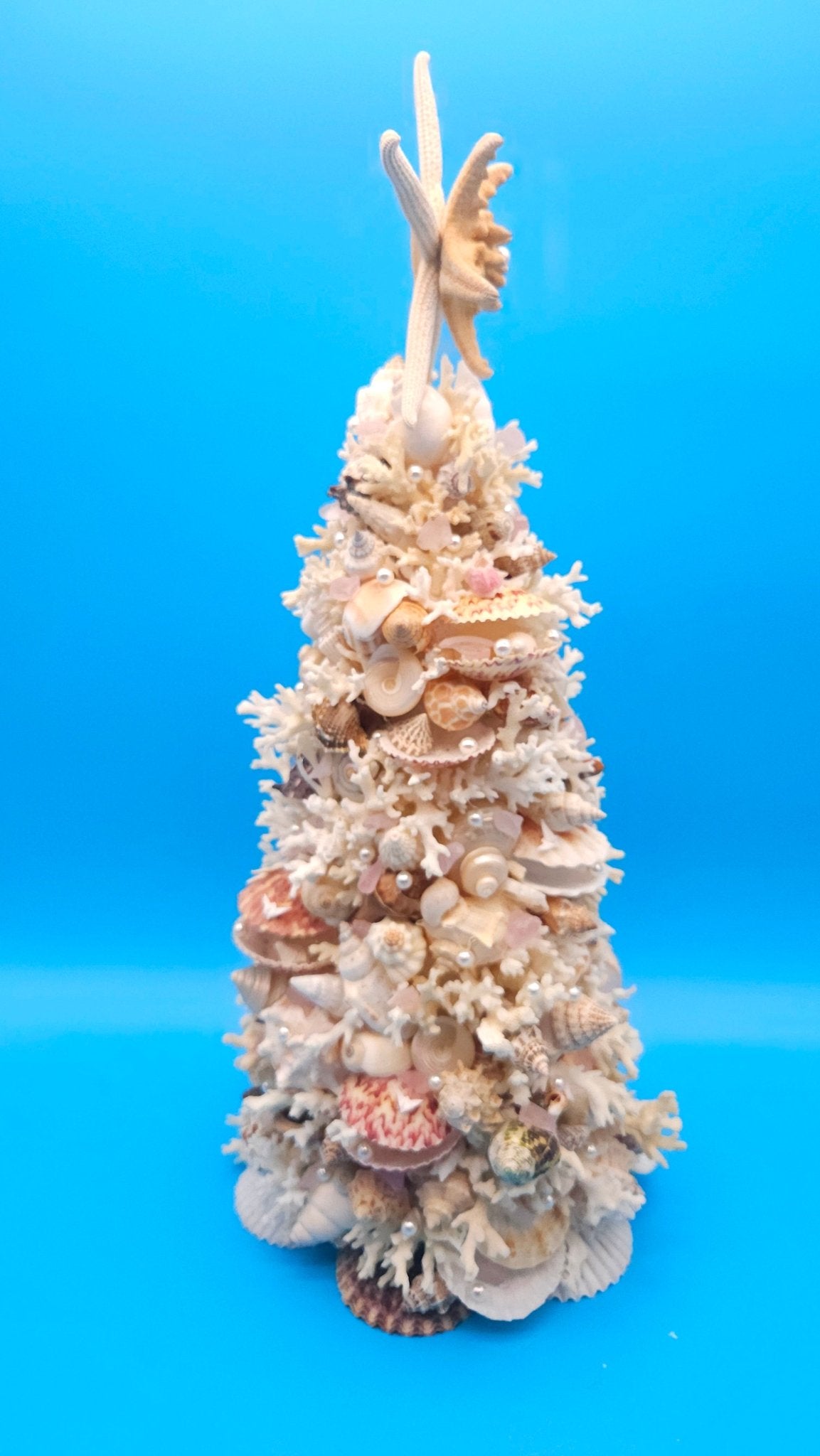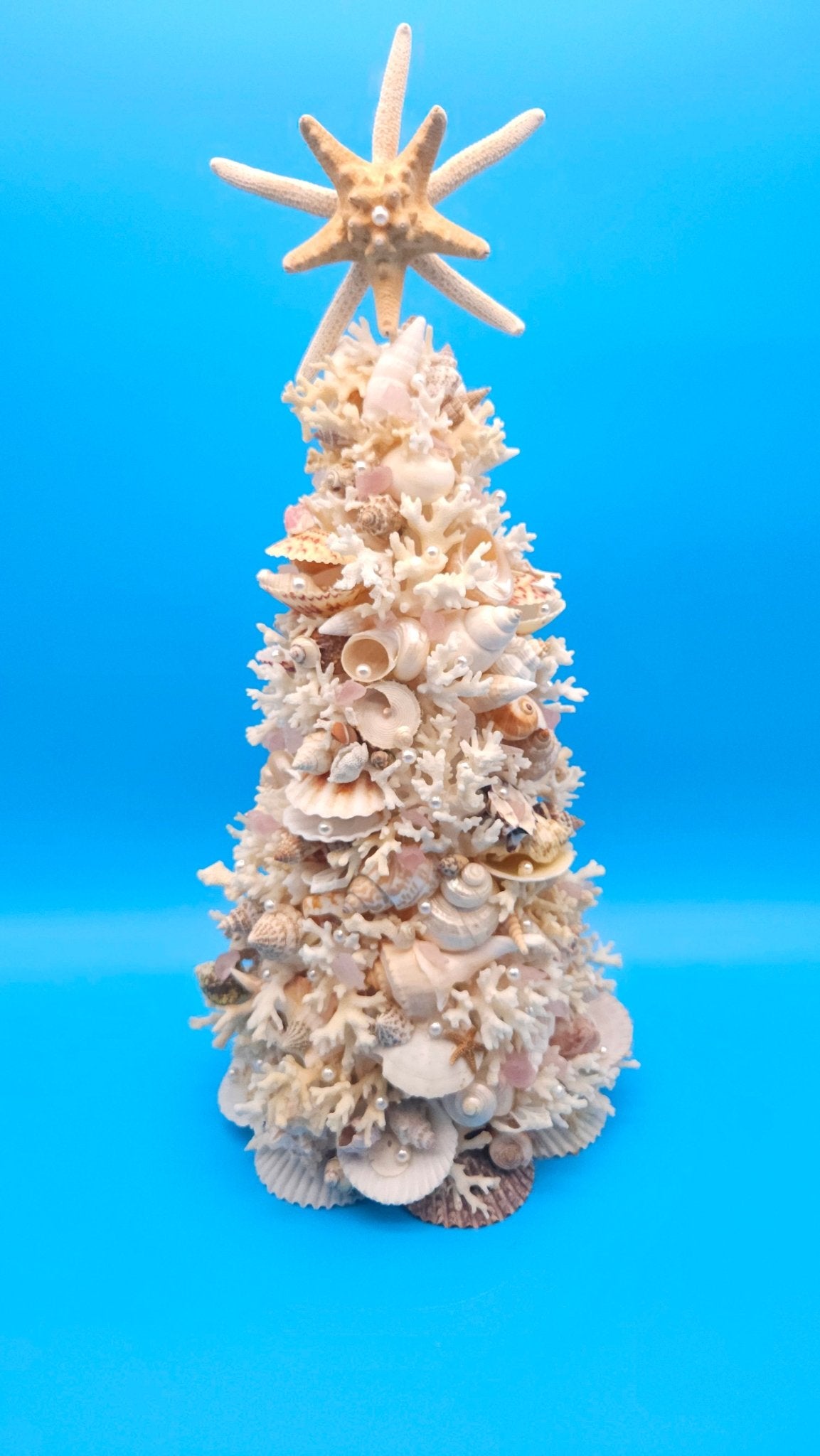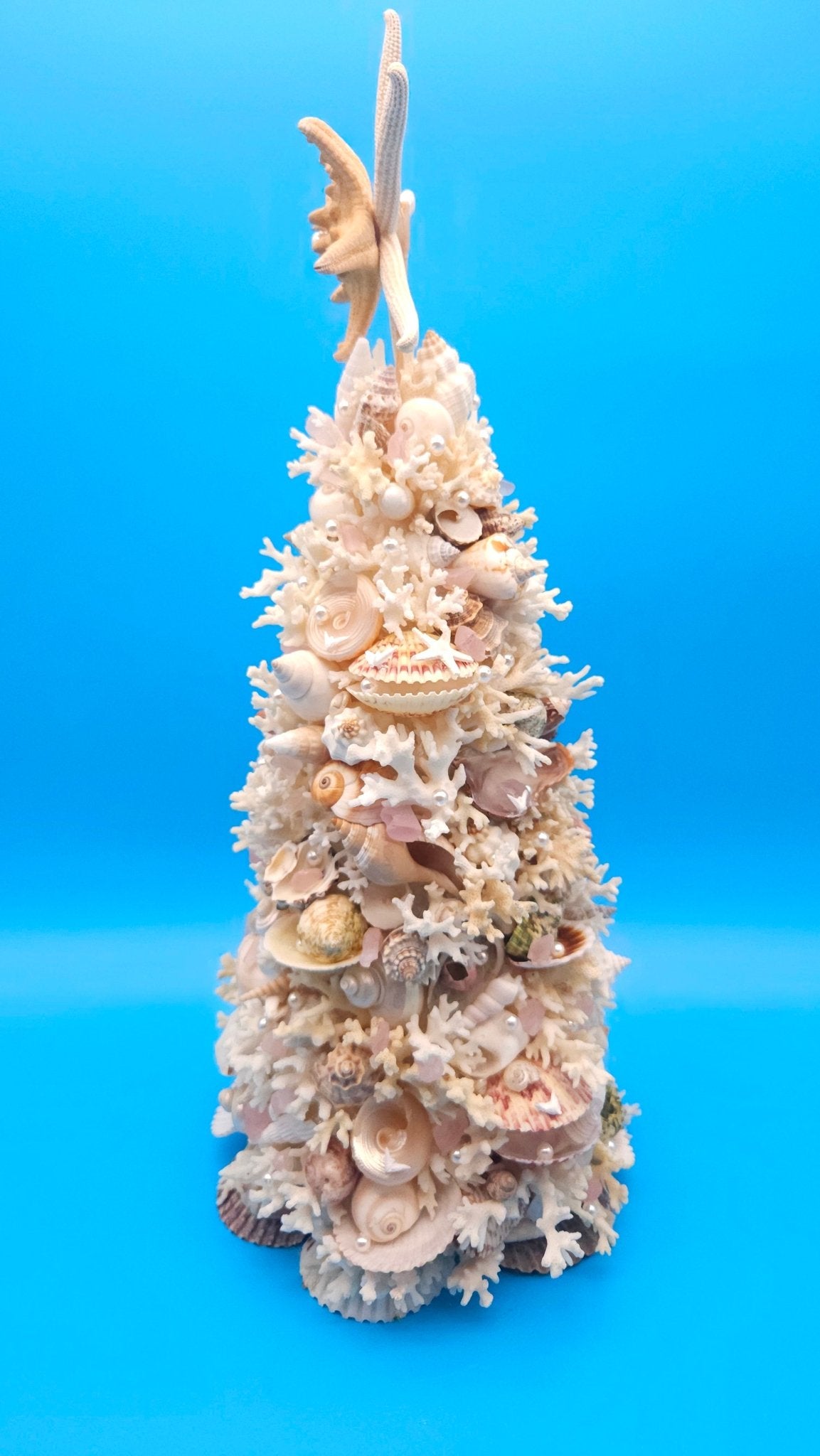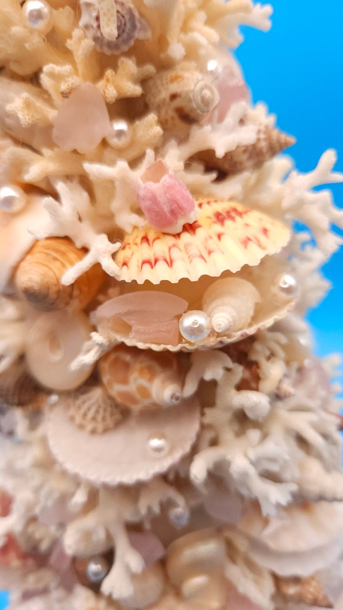 Bring the elegance of the sea indoors with this magnificent, handcrafted Coral and Shell Tree. Standing as a stunning centerpiece, this piece is densely adorned with natural white coral, assorted seashells, genuine sea glass accents, and charming sand dollar doves. It is finished with small pearl beads and topped with a beautiful natural starfish. It’s the perfect addition to coastal decor and a sophisticated take on holiday or year-round nautical style.