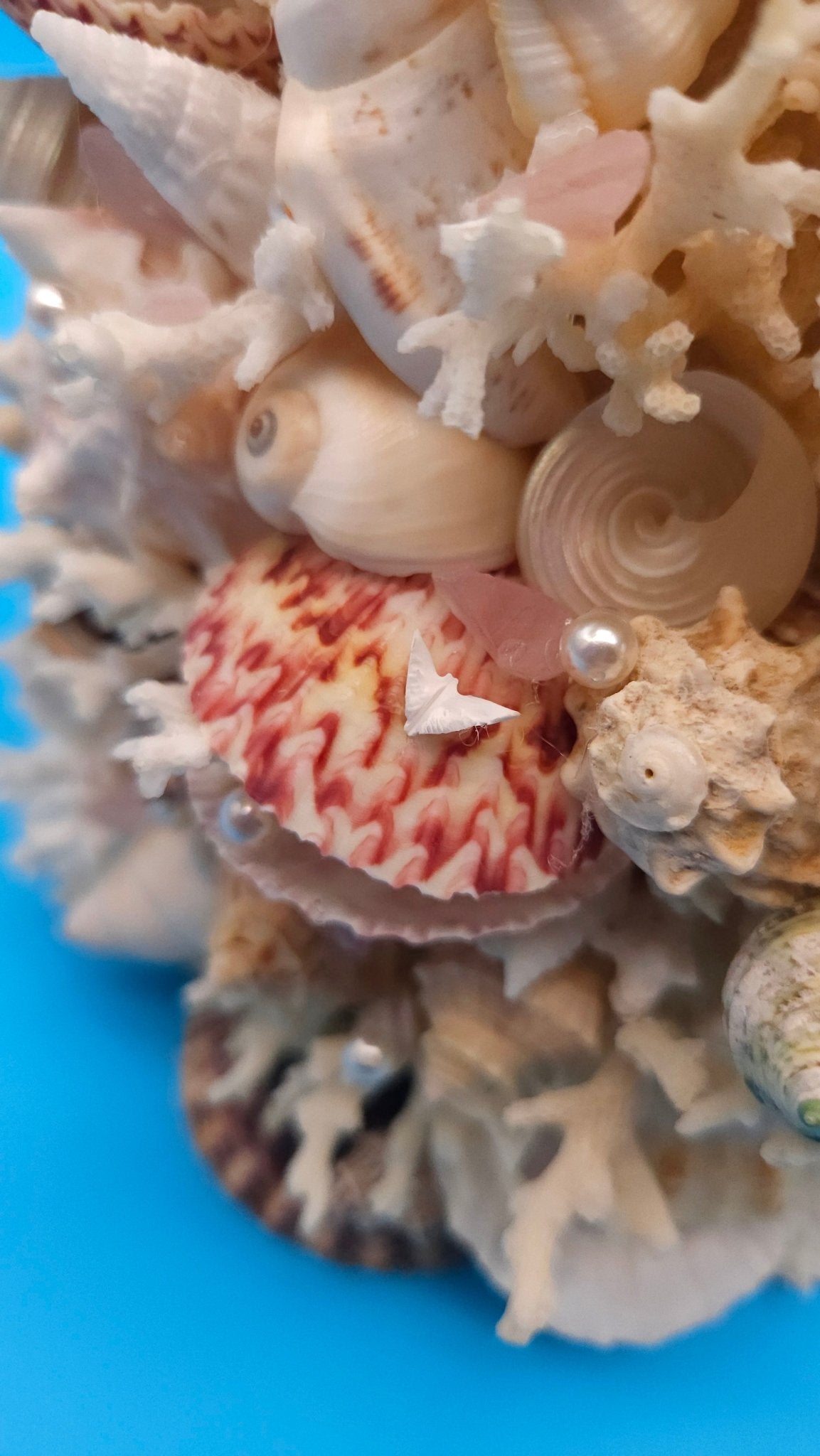 • Hand-assembled using a variety of natural white coral and assorted seashells (including scallop, conch, and spiral varieties).