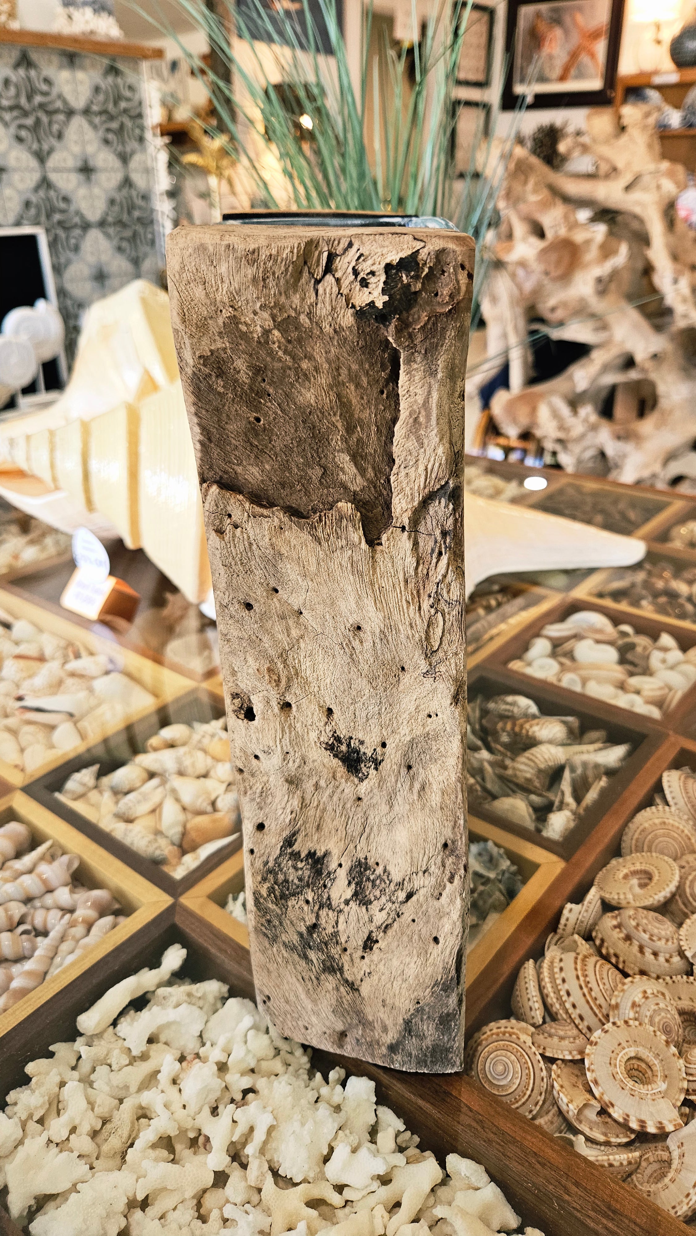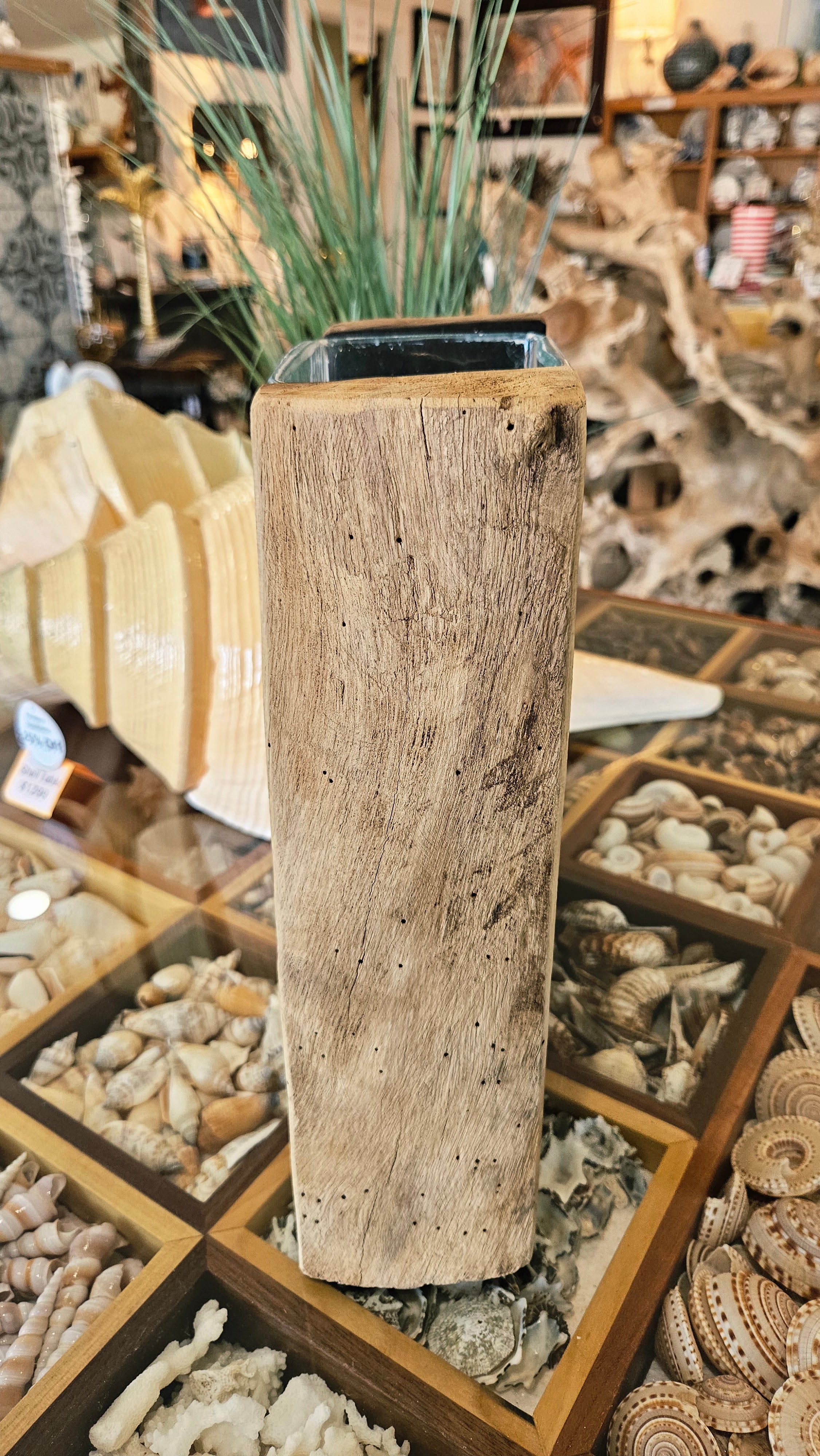 Please note that the photos represent our stock, and you will not receive the exact piece shown. Variations in wood shape, grain, and molten glass formation ensure that each vase is truly unique.