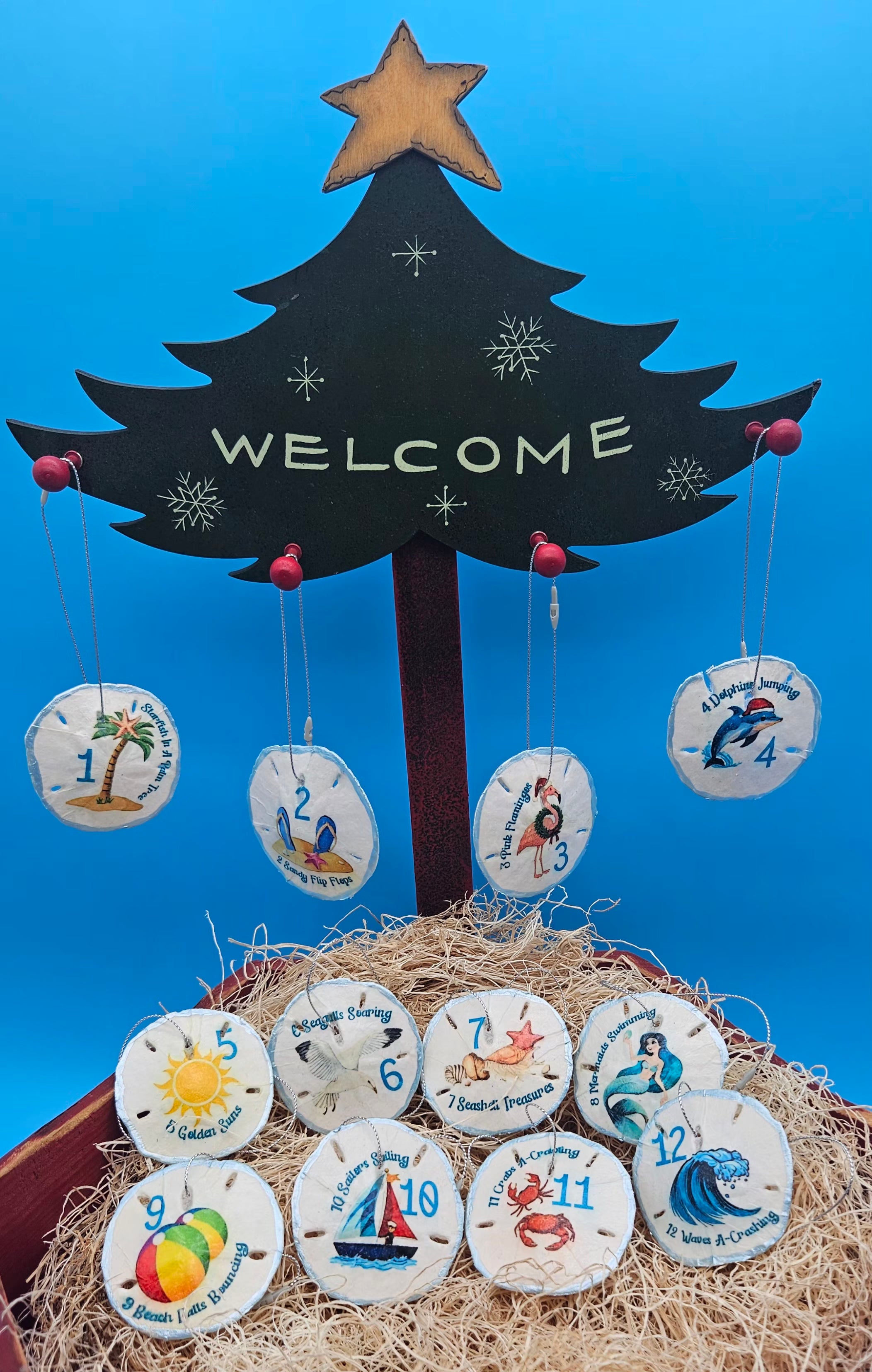 Celebrate the season with our handmade Sand Dollar 12 Days of Christmas Ornament Set. Each real sand dollar is hand-decorated in-house, creating a one-of-a-kind holiday treasure. Choose from Traditional or Coastal styles — every 12-piece set is naturally unique and full of festive charm.