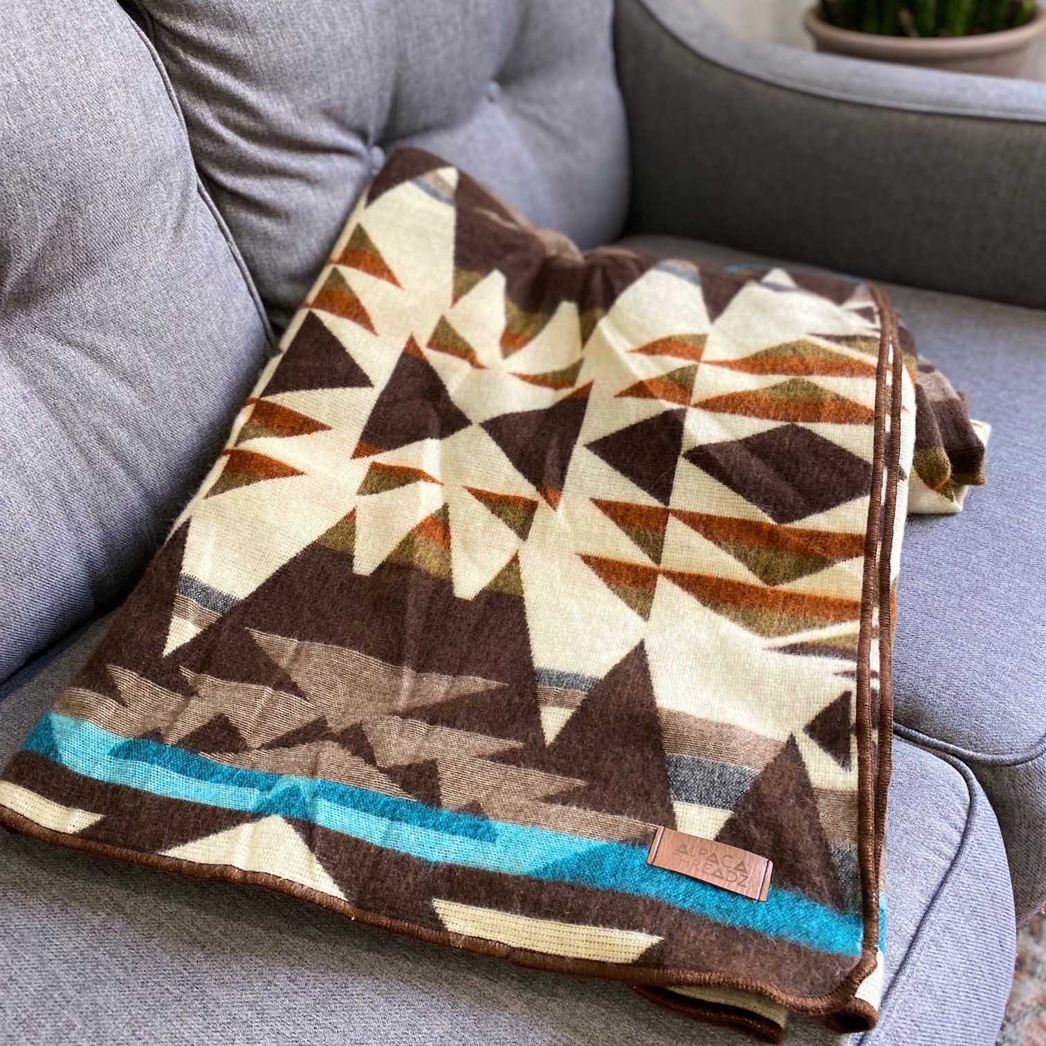 Bring the rugged elegance of the West into your home with the Andean Alpaca Wool Blanket - Cowboy, a Queen-sized, reversible masterpiece hand-woven by Andean artisans. Featuring a striking geometric pattern in earthy brown, deep charcoal, white, and a pop of turquoise, this hypoallergenic blanket delivers lightweight warmth and two distinct, durable designs perfect for any cozy space.