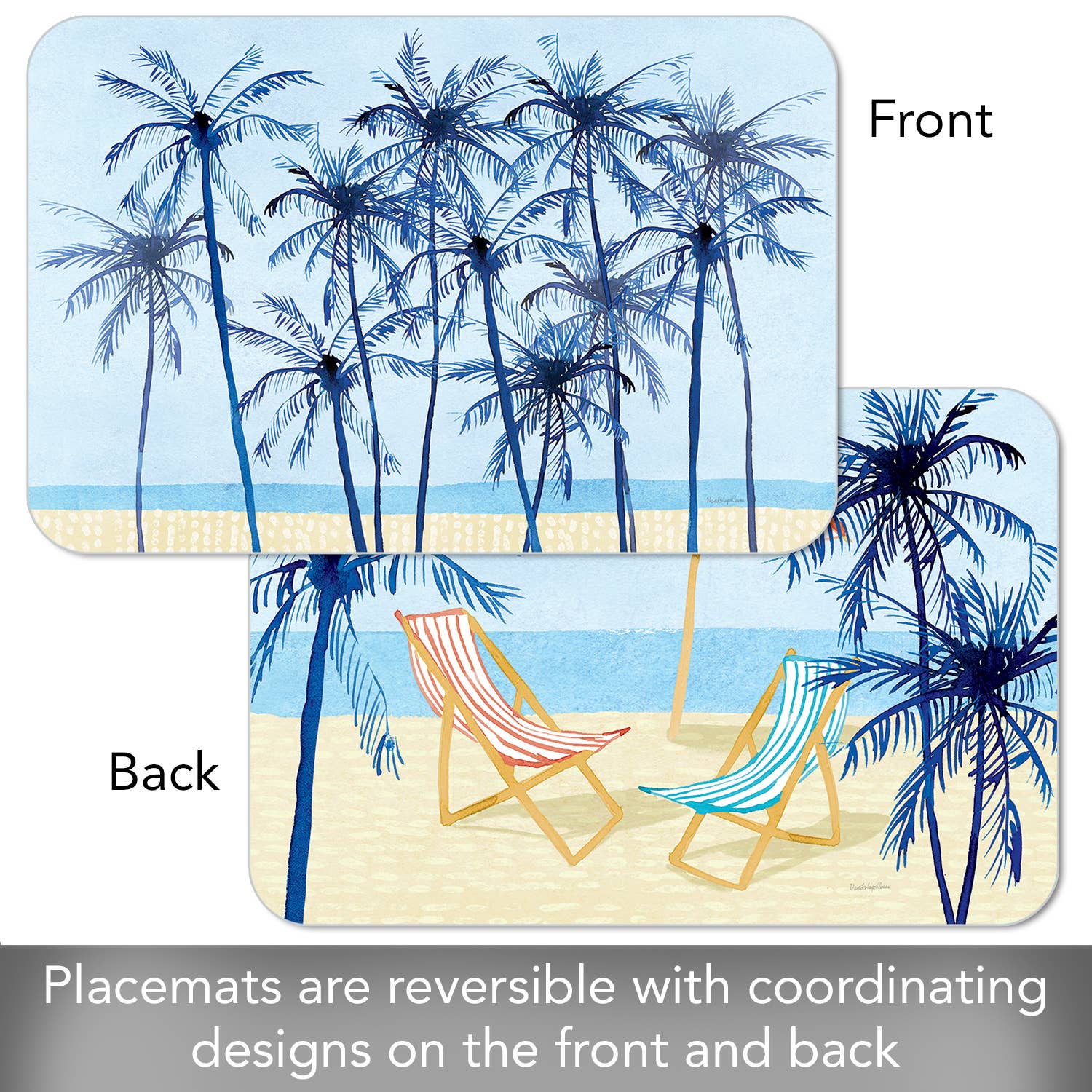 Add a tropical touch to your dining space with the Laguna Palms Reversible Placemat. One side features tall, breezy palms, while the other showcases colorful beach chairs beneath swaying trees — perfect for creating a relaxed coastal vibe.