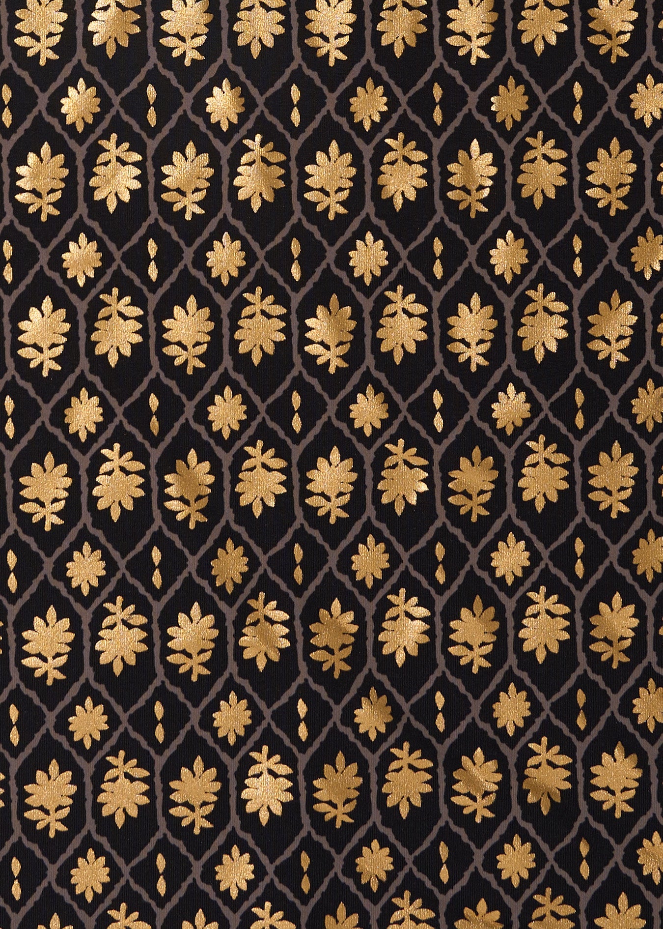 Shine this holiday season with our Black Metallic Tunic Dress. A twist on the classic little black dress, this sun safe style features a conservative length and a gold tile pattern. The UPF 50+ dress has a charcoal and gold emblem tile pattern with black contrast 3/4 sleeve cuffs and neckline. Plus, the collar has intricate gold embroidery details.