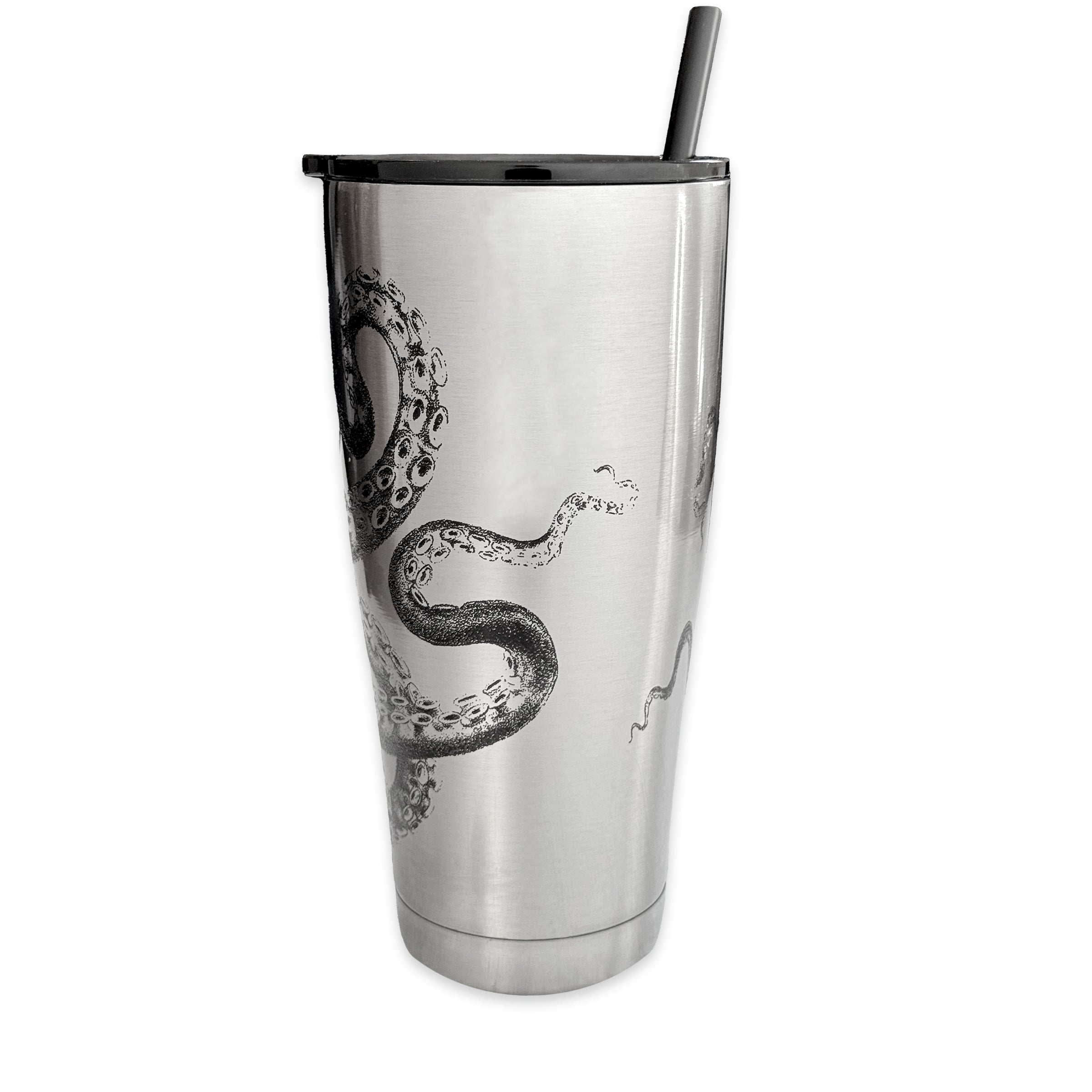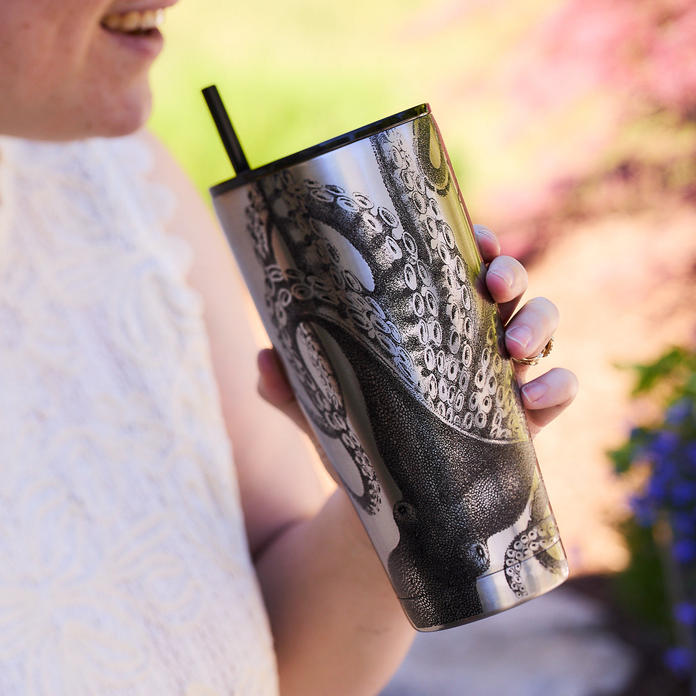 Stay hydrated in style with the Lucy Chrome Stainless Steel Tumbler. This sleek, double-walled travel cup features a striking octopus illustration etched against a polished chrome finish. Designed for life on the go, it keeps your beverages at the perfect temperature for hours and fits effortlessly into standard car cup holders.