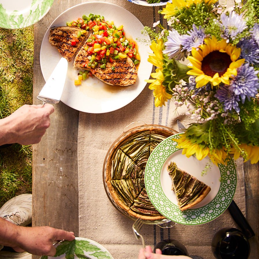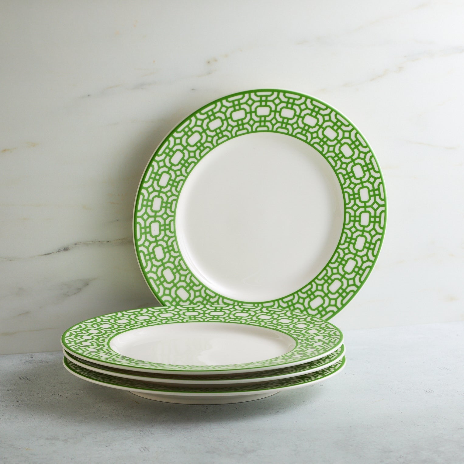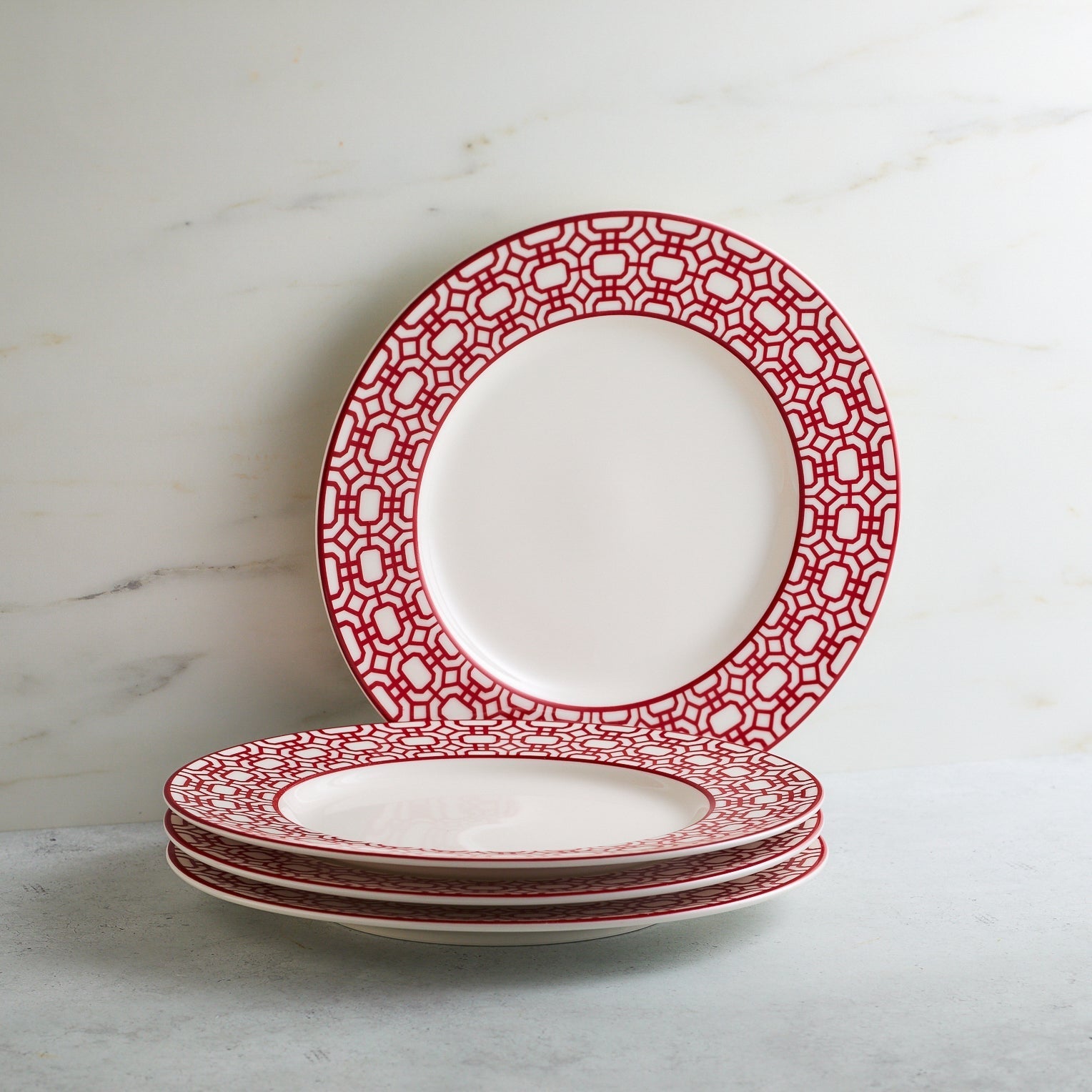 Frame your salads, desserts, or appetizers with the crisp geometry of the Newport Garden Gate Rimmed Salad Plate. Measuring 8.5 inches, this porcelain plate features a classic interlocking lattice rim design. Available in three preppy colorways—Red, Green, or Blue—it is designed to mix and match seamlessly with floral patterns or stand alone for a clean, tailored table setting.