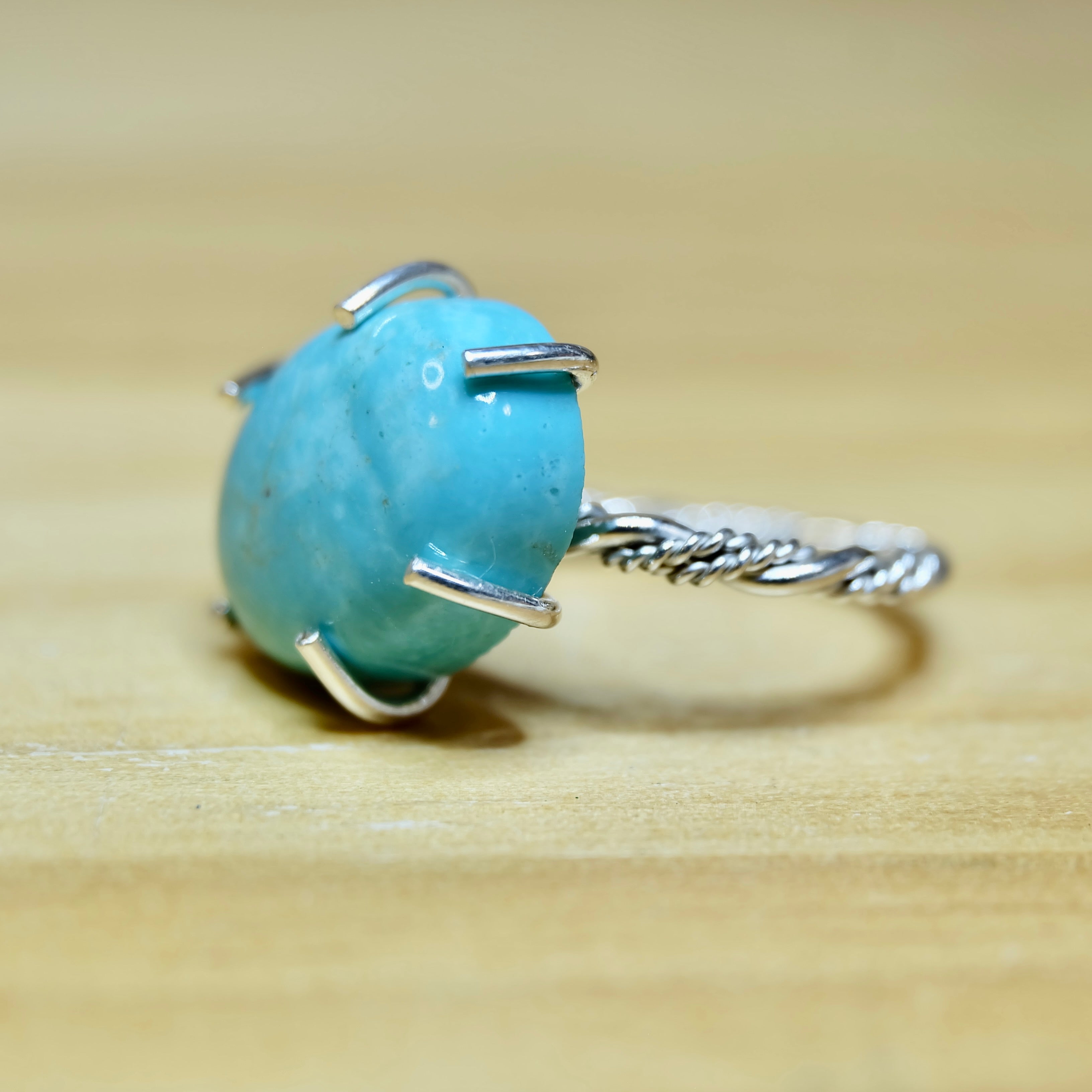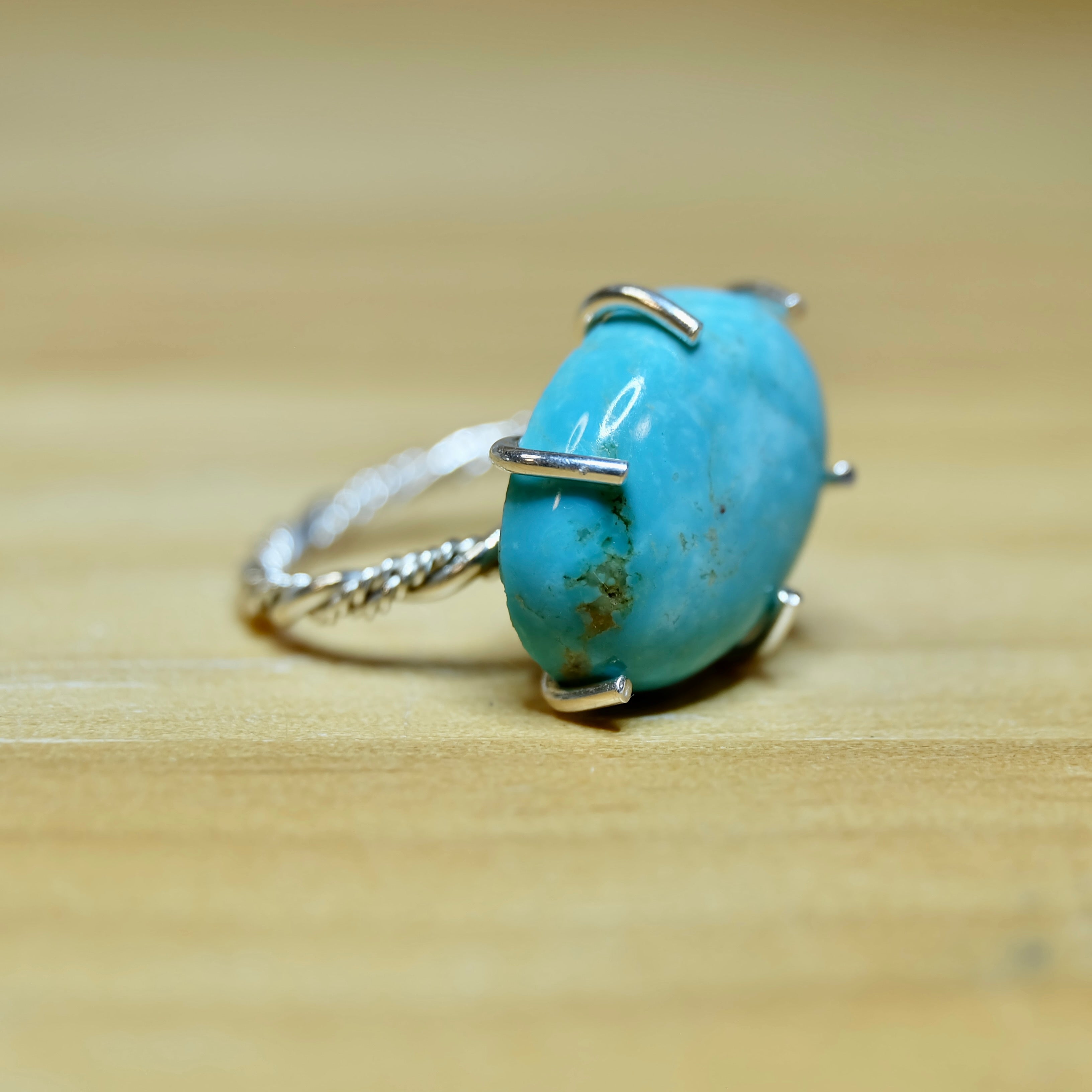 Shop our beautiful sterling silver turquoise ring. This piece features a natural Kingman turquoise gemstone. This stone is highly valued in turquoise jewelry. It sits in an open prong setting. The gemstone is framed by a hand-braided sterling silver band. Clean but bold. Timeless but unlike anything else in your collection. Our of a kind piece is ready to ship today.
