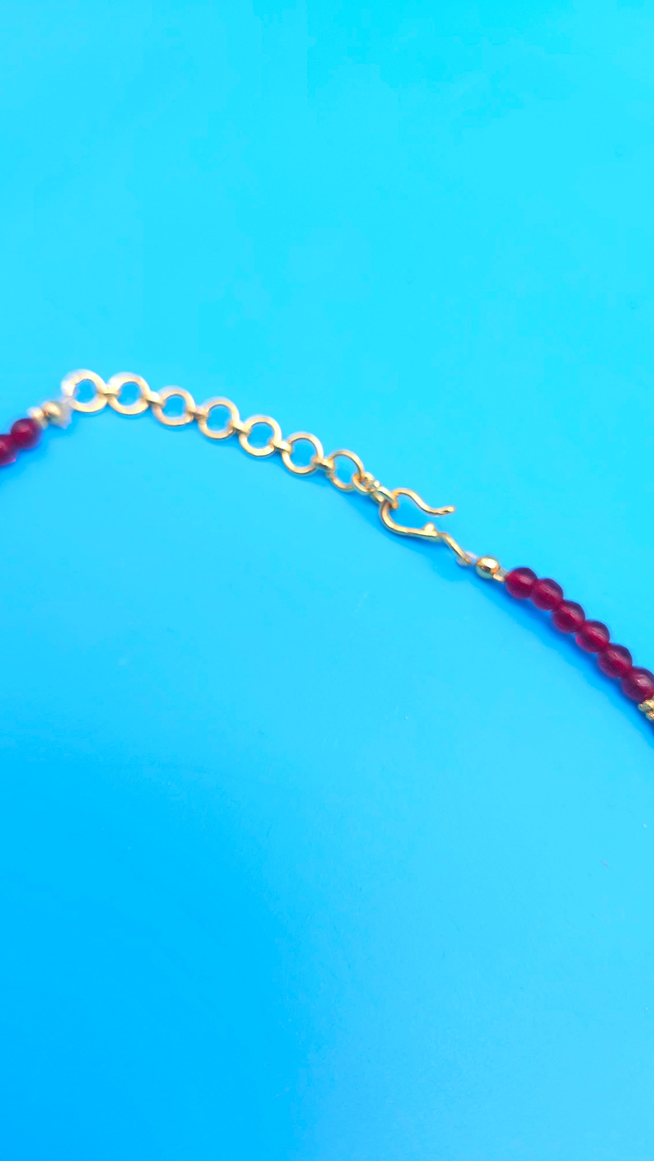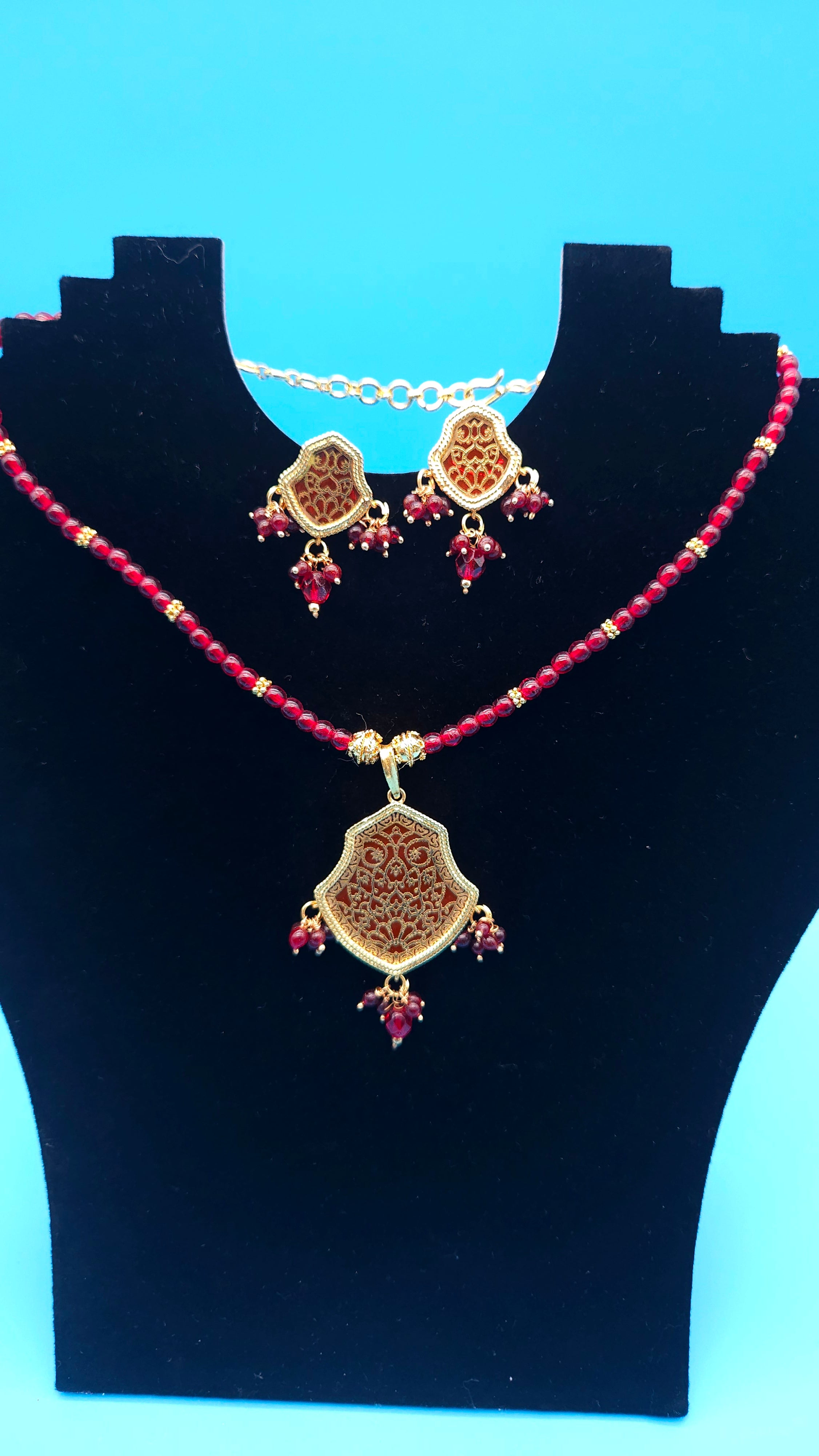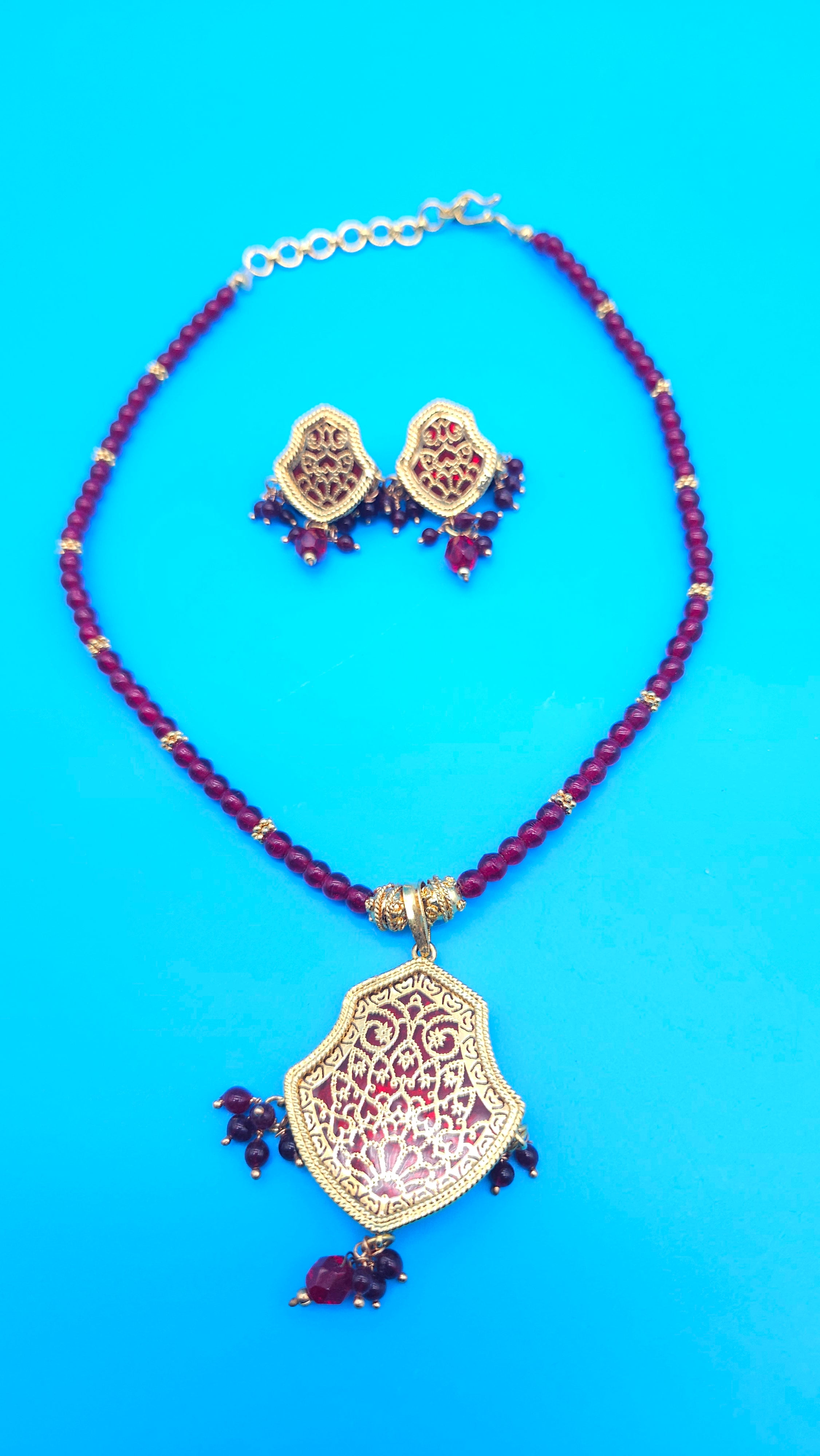 Elevate your ethnic style with this elegant antique gold-tone set. Featuring intricate filigree pendants and deep maroon faceted beads, this lightweight set creates a regal look perfect for weddings and festivals.