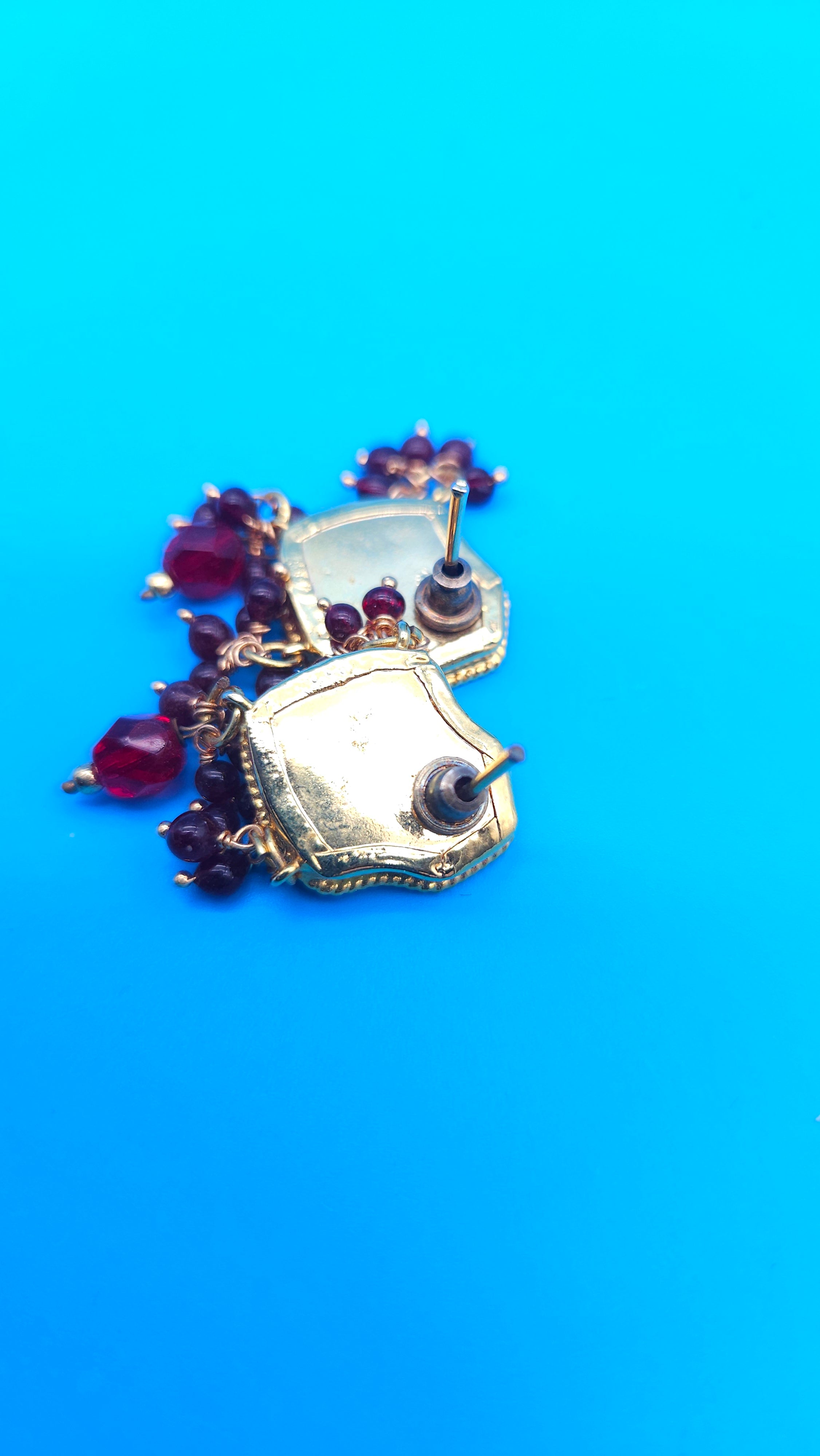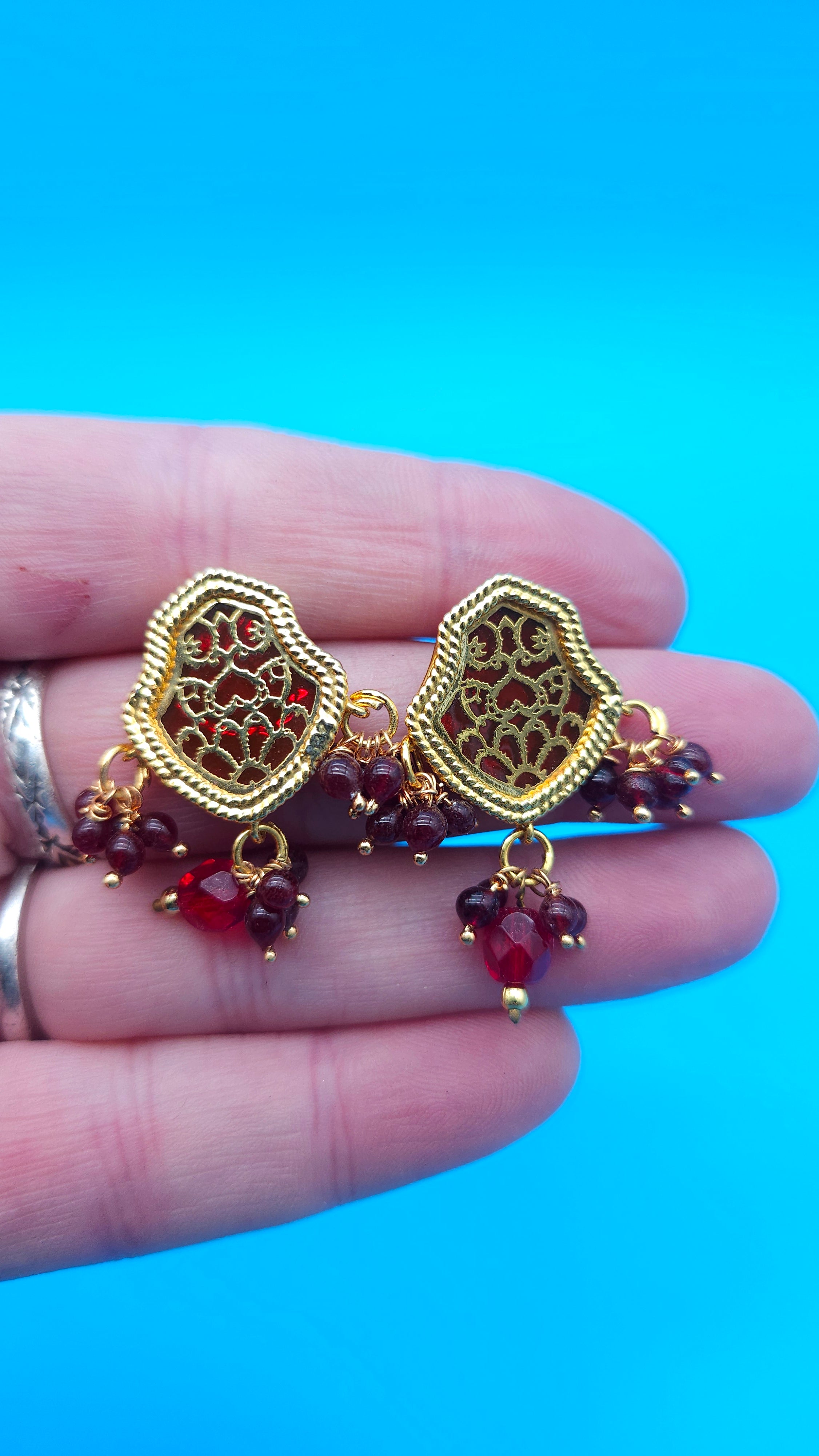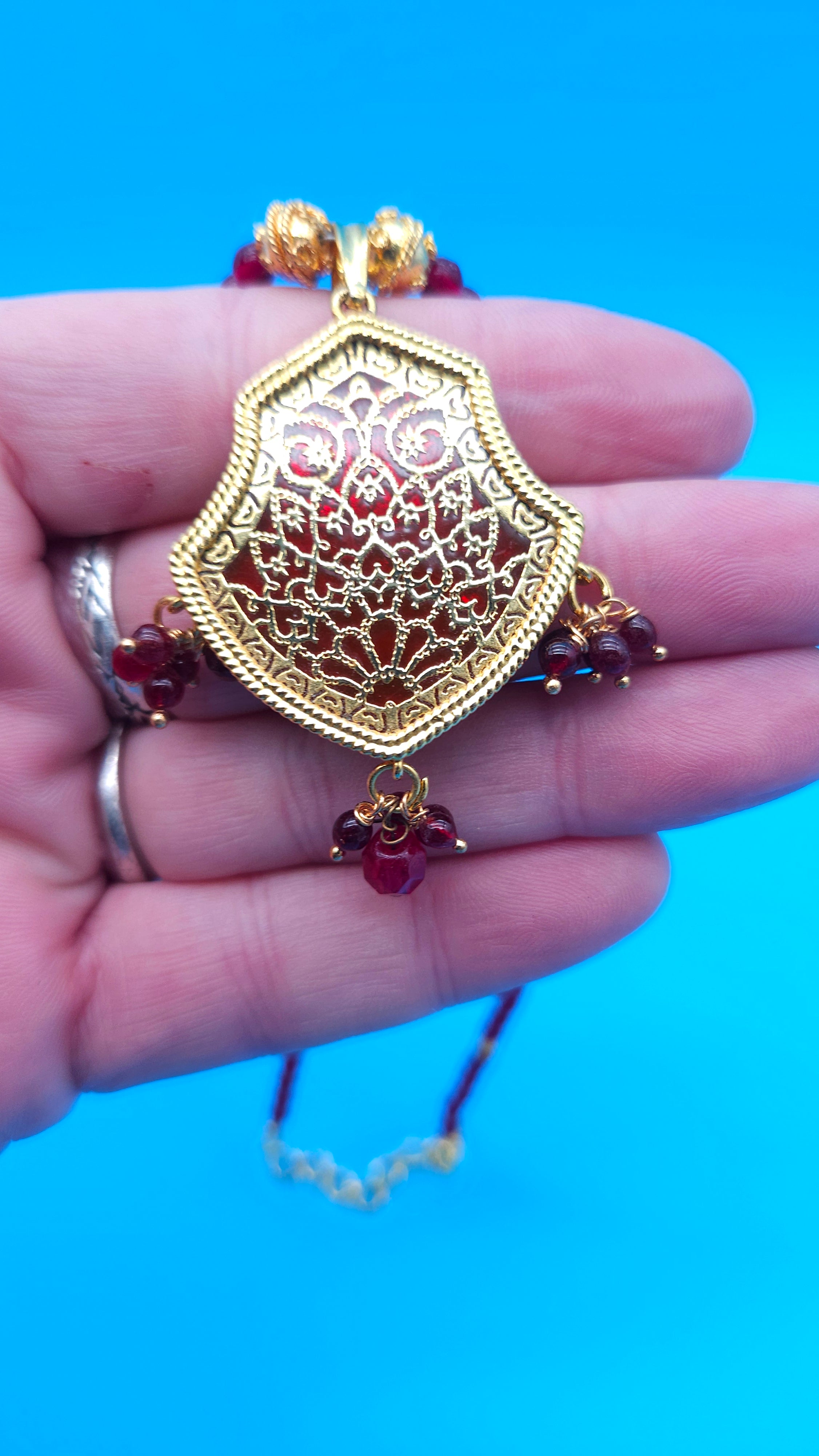 Elevate your ethnic style with this elegant antique gold-tone set. Featuring intricate filigree pendants and deep maroon faceted beads, this lightweight set creates a regal look perfect for weddings and festivals.