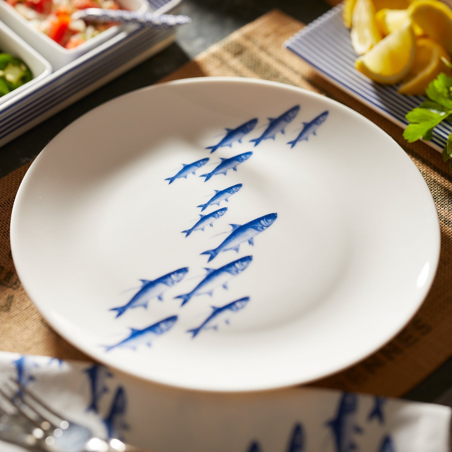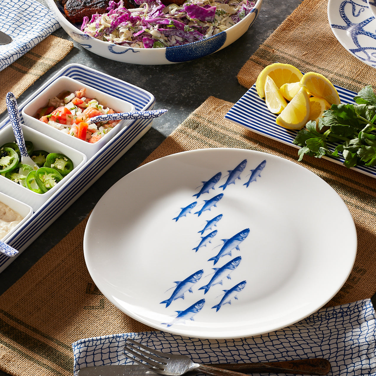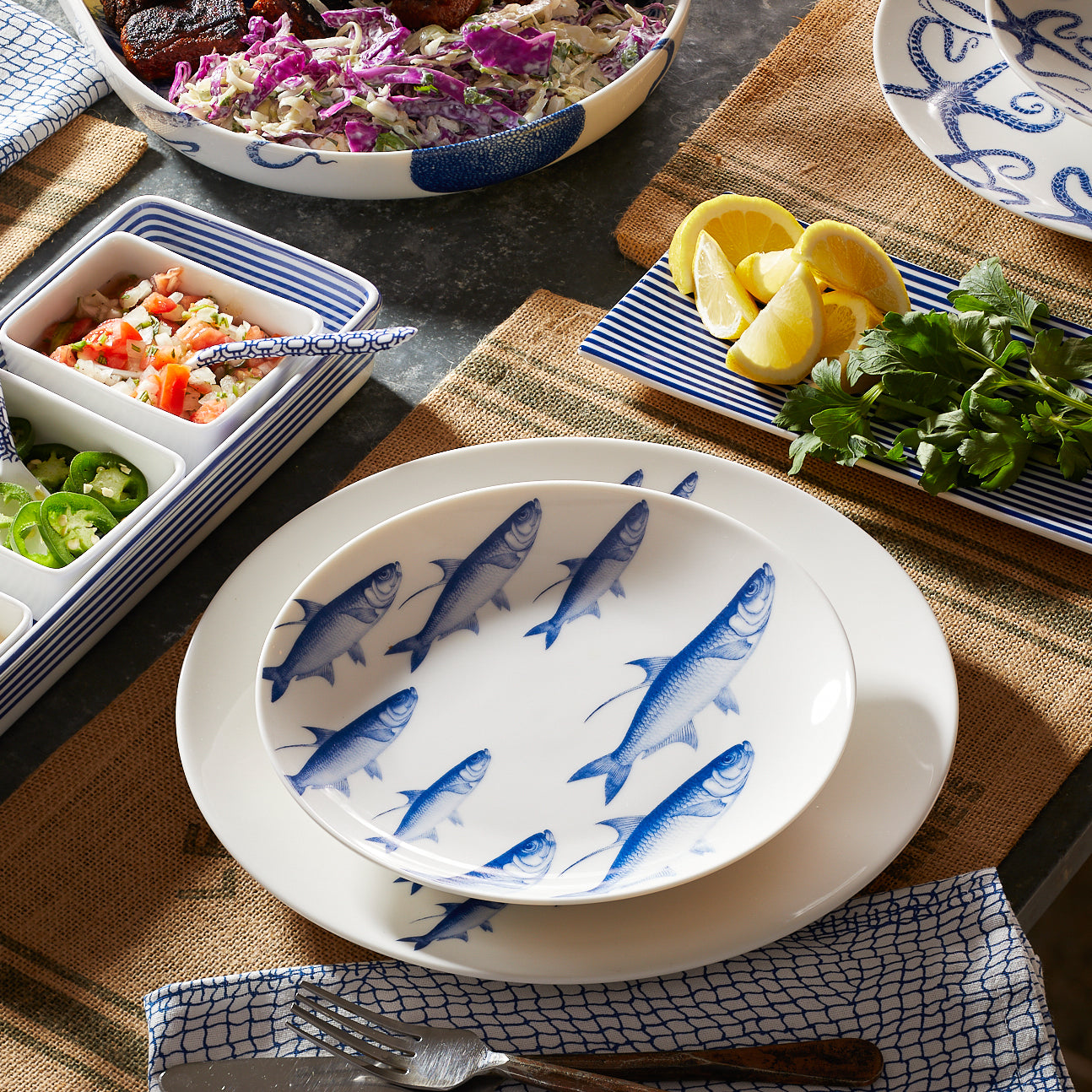 Bring the ocean to your table with this elegant School of Fish Coupe Dinner Plate, featuring a dynamic blue and white coastal design. Crafted for durability and style, this nautical dinnerware piece is ideal for everyday seafood dining or festive beach house entertaining.
