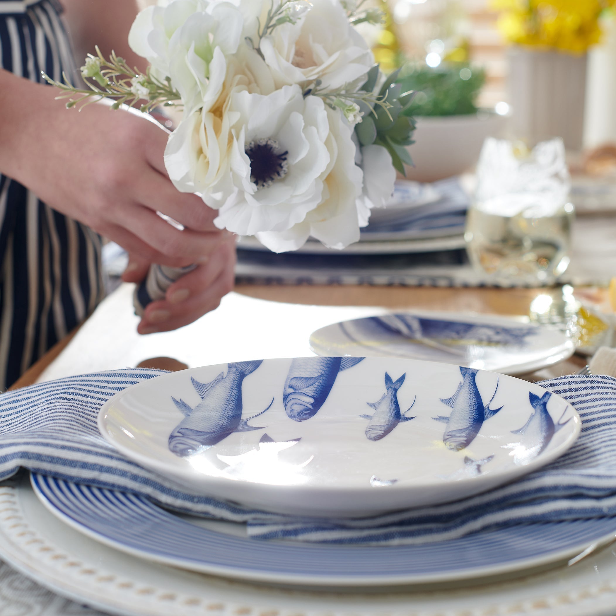 Bring the movement of the ocean to your table with this School of Fish coupe salad plate, featuring a classic blue and white coastal motif. Ideally sized for salads, desserts, or appetizers, this durable porcelain dinnerware adds a sophisticated nautical touch to any beach house or summer dining arrangement.