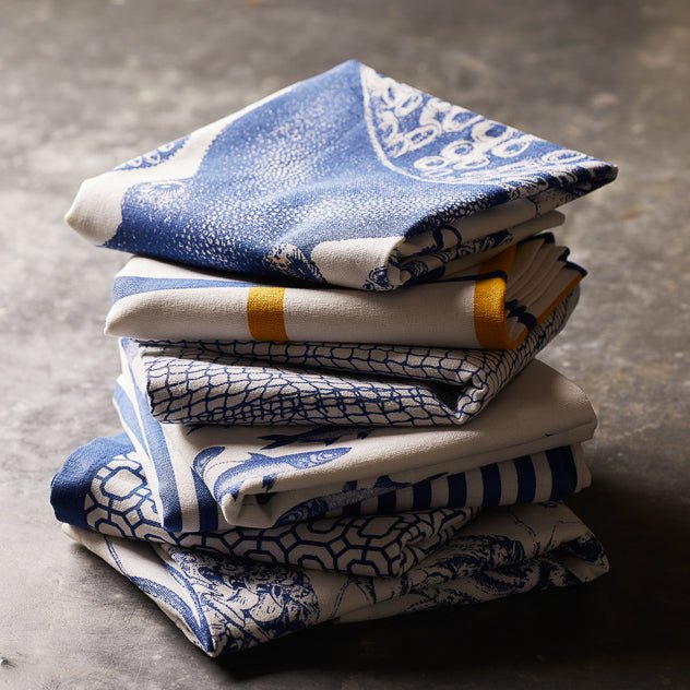 Bring the ocean to your dining table with this set of 4 School of Fish Dinner Napkins. Crafted from soft, 100% cotton, these generous 22-inch square napkins feature a playful blue schooling fish print on a crisp white background. Perfect for seafood feasts, beach house dining, or adding a nautical touch to your everyday meals, these durable napkins are machine washable and require no ironing for effortless maintenance.