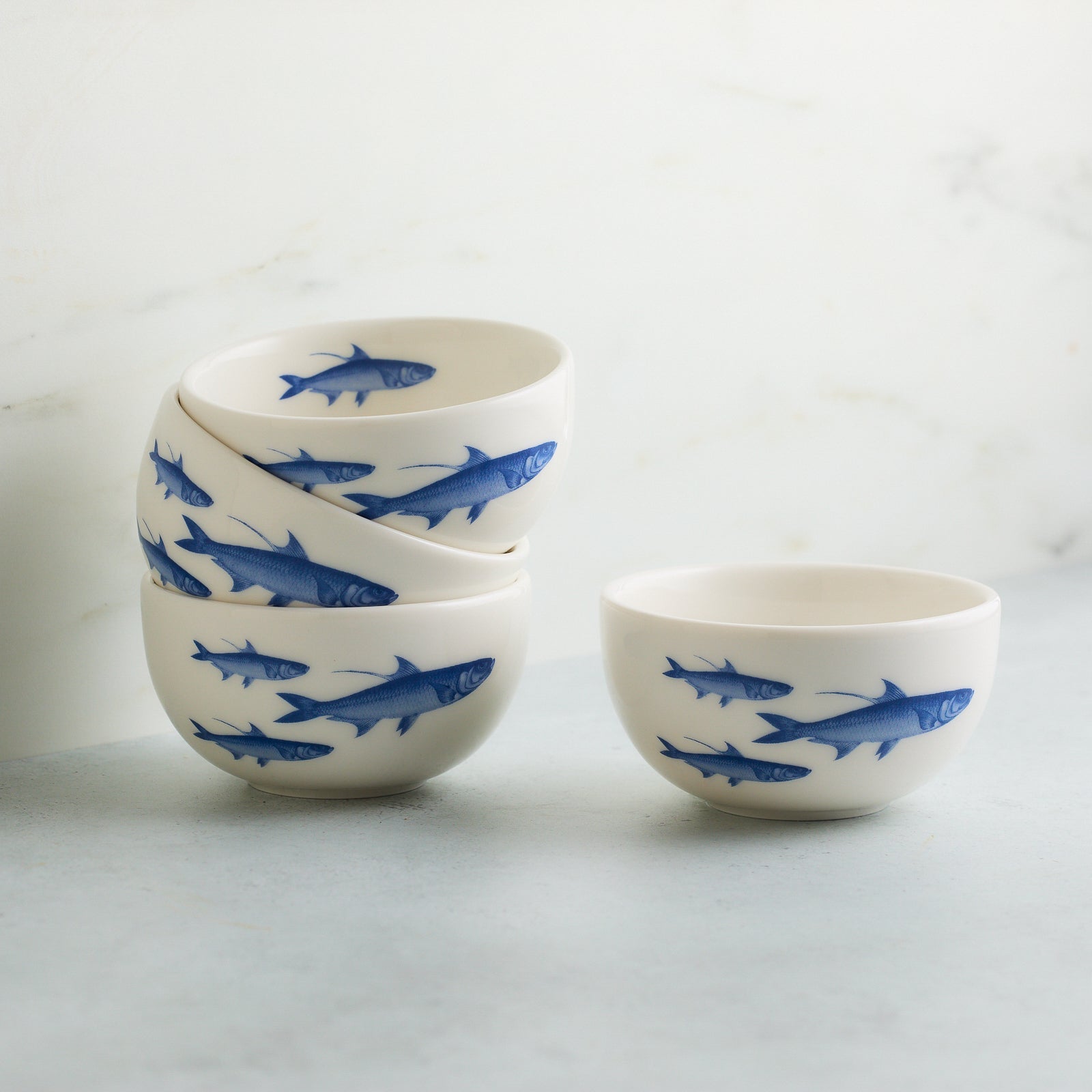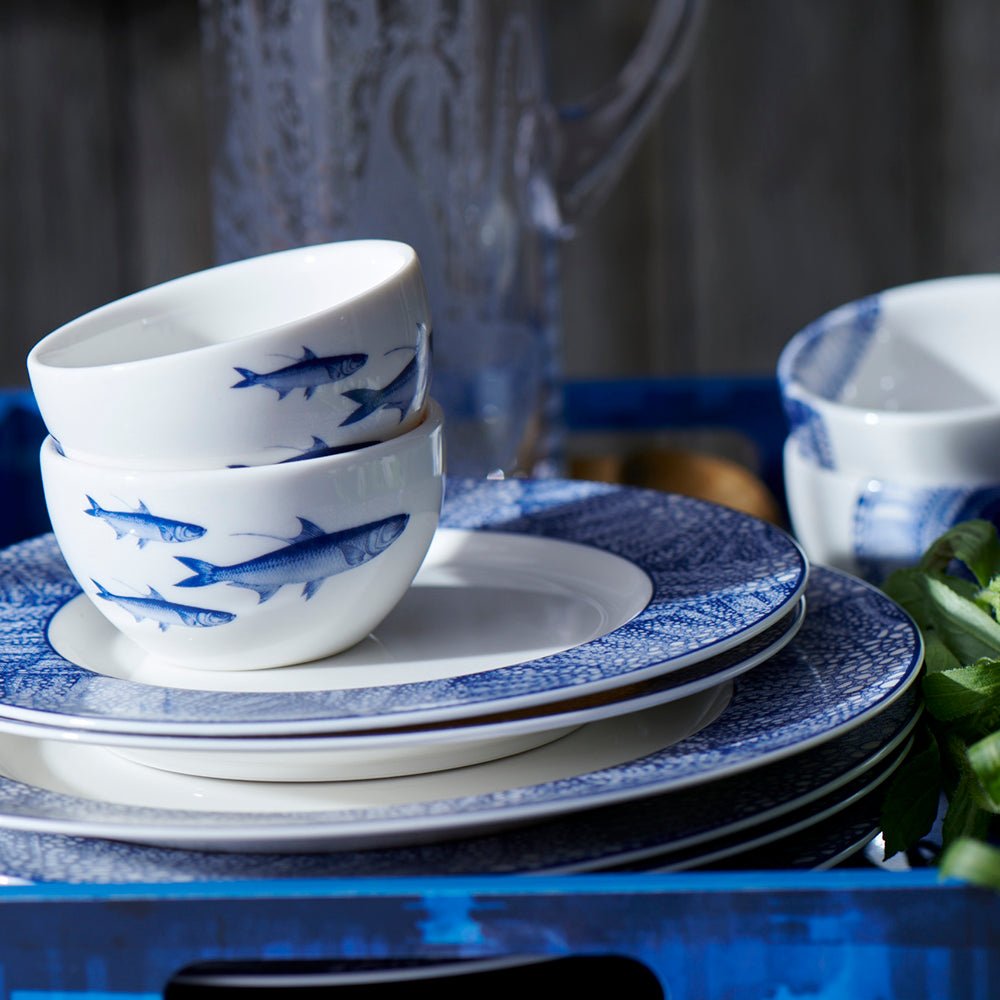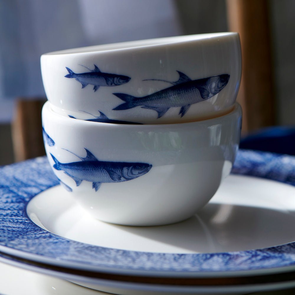 Add a charming nautical touch to your appetizers with this School of Fish Snack Bowl. Featuring the collection's signature blue and white coastal motif on both the exterior and interior, this versatile small vessel is perfect for serving dips, nuts, olives, or individual portions, making it an essential piece for any beach house entertaining set.