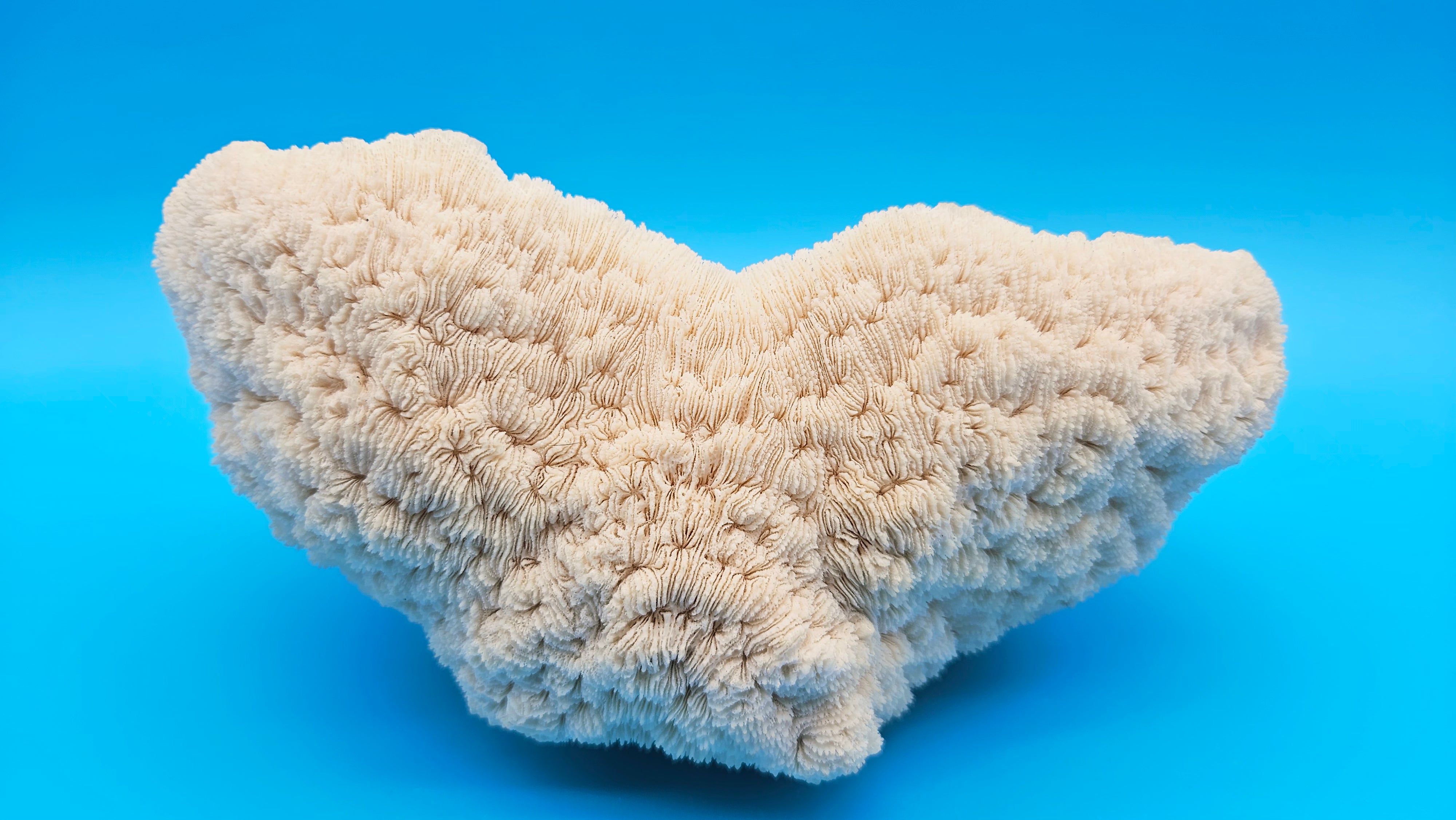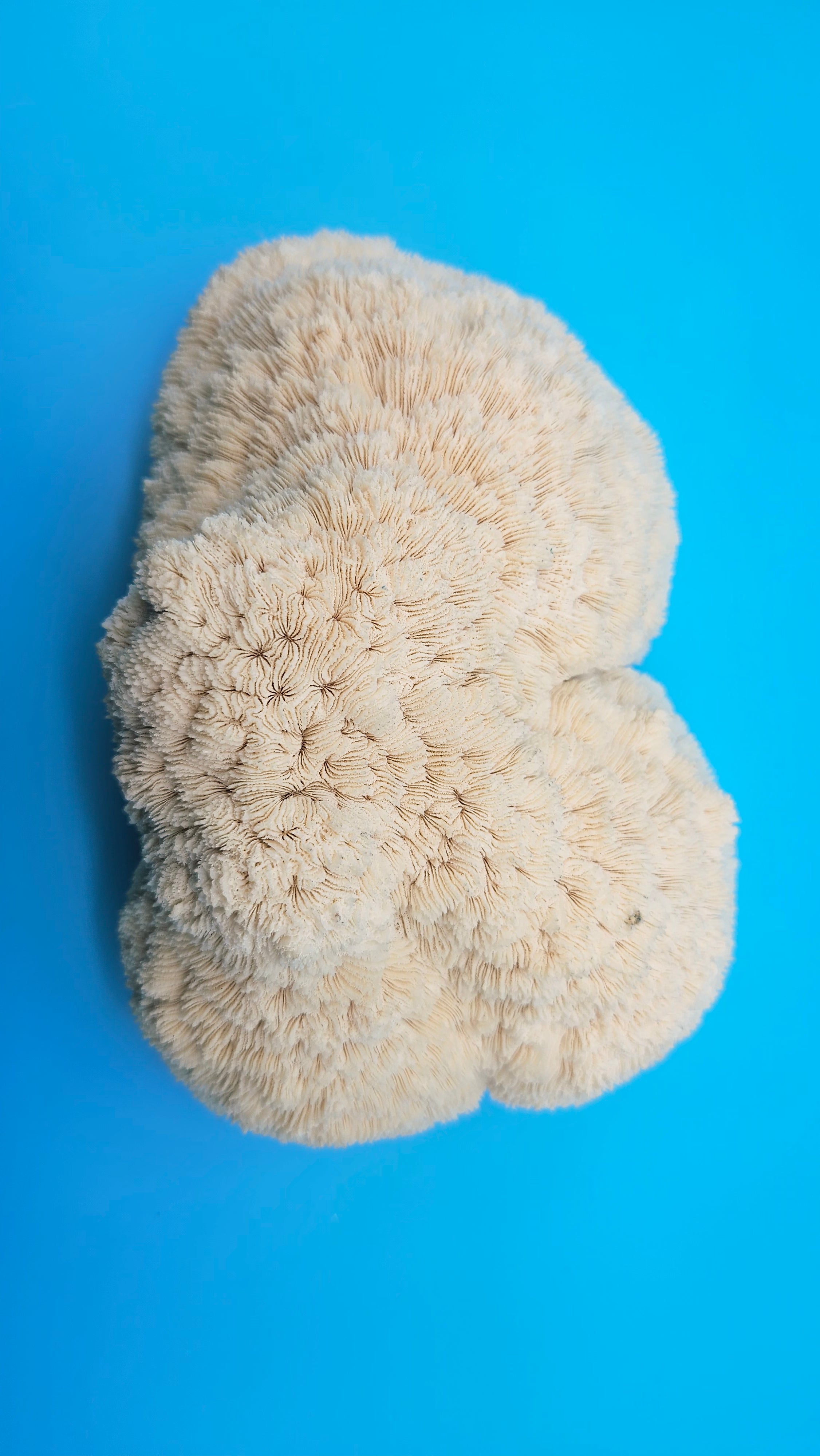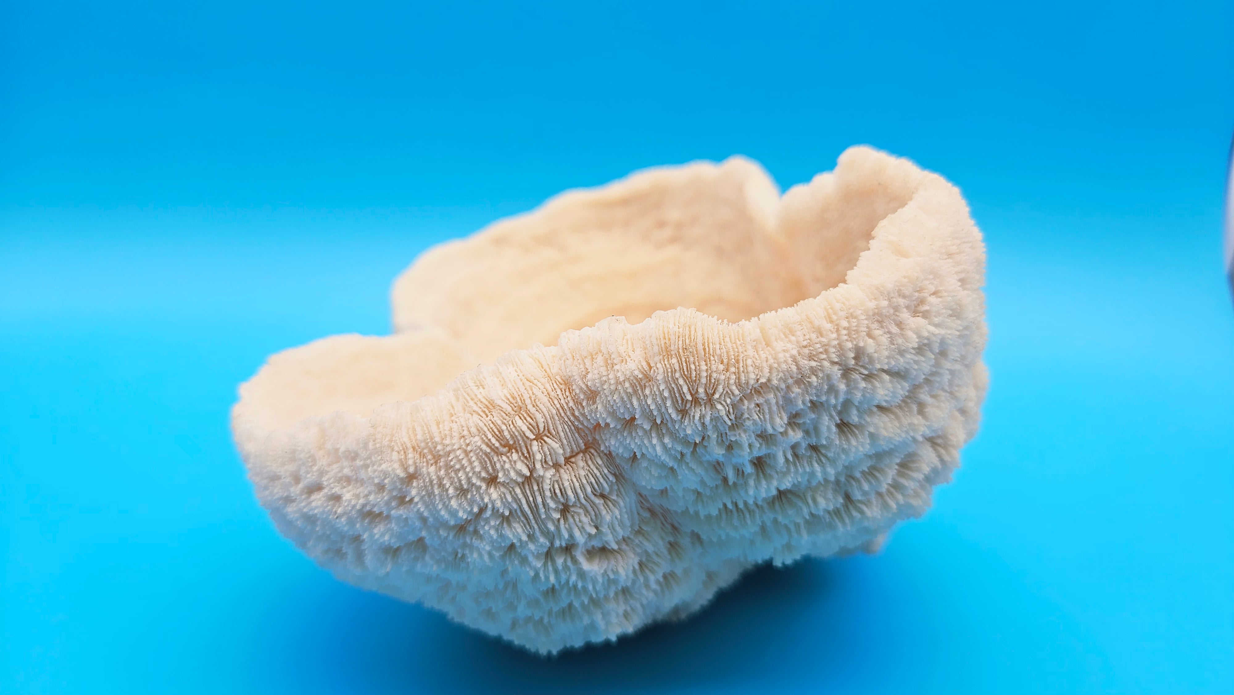 The White Bowl Coral (Halomitra pileus) is a striking natural specimen known for its distinctive concave shape and smooth, flowing lines. This 8.5-inch piece features a gentle, bowl-like curvature with fine, radiating ridges that create a soft, textured appearance. Its elegant form and creamy white hue make it a versatile decor element, perfect for holding small treasures or standing alone as a sculptural accent in coastal or minimalist settings.
