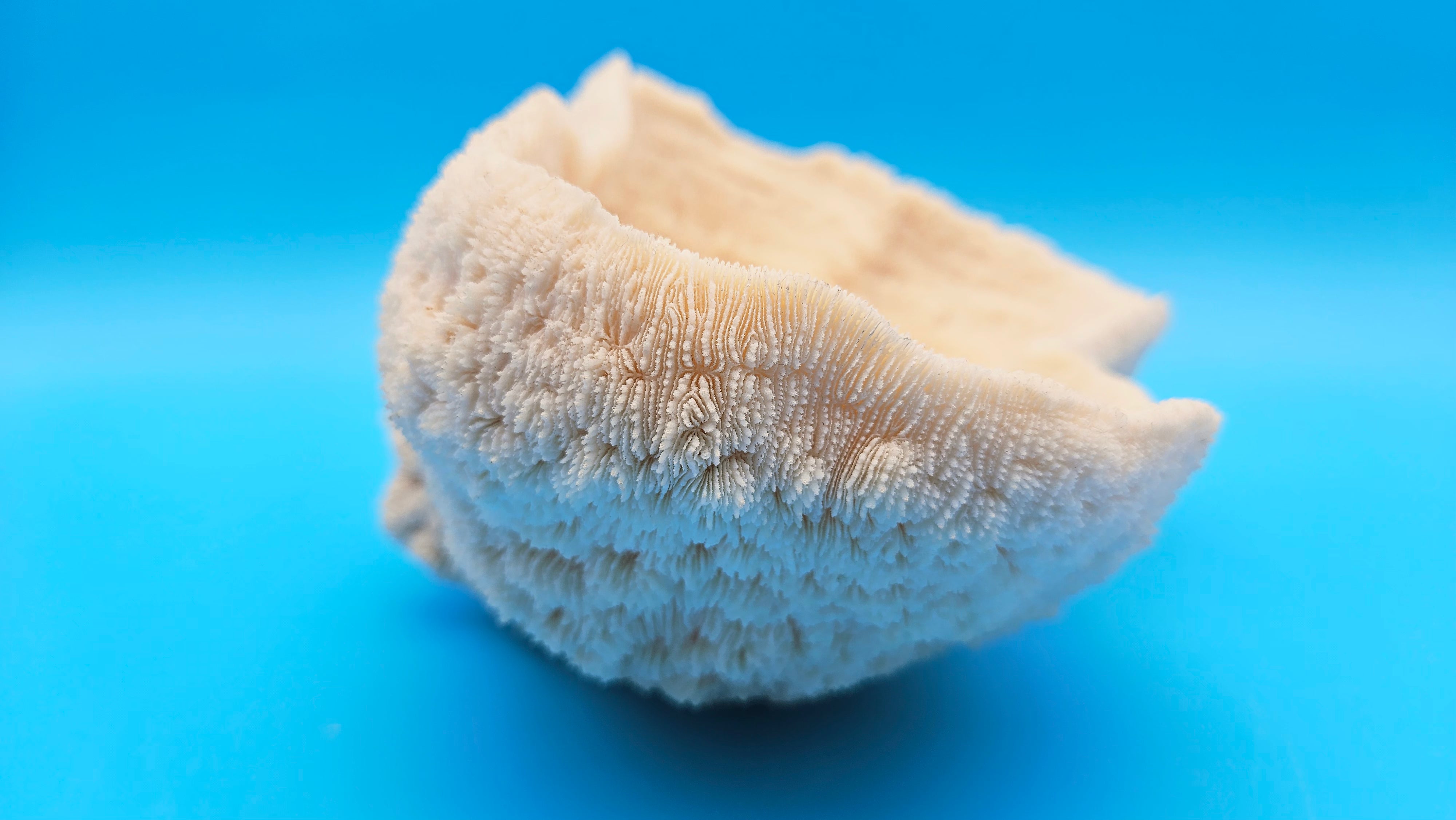 Detailed with fine, radiating septa ridges on the convex side and a smoother interior