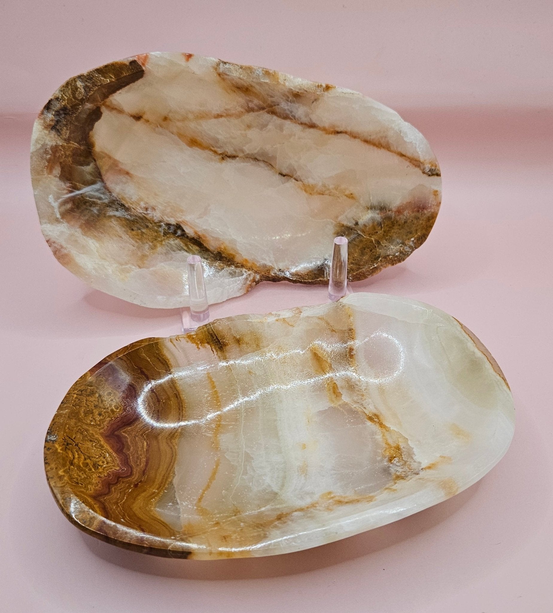 These warm-toned onyx dishes bring the natural charm of the earth straight into your space. With rich bands of amber, cream, and honey swirling across each polished surface, no two trays are alike—each one is a functional little piece of art.