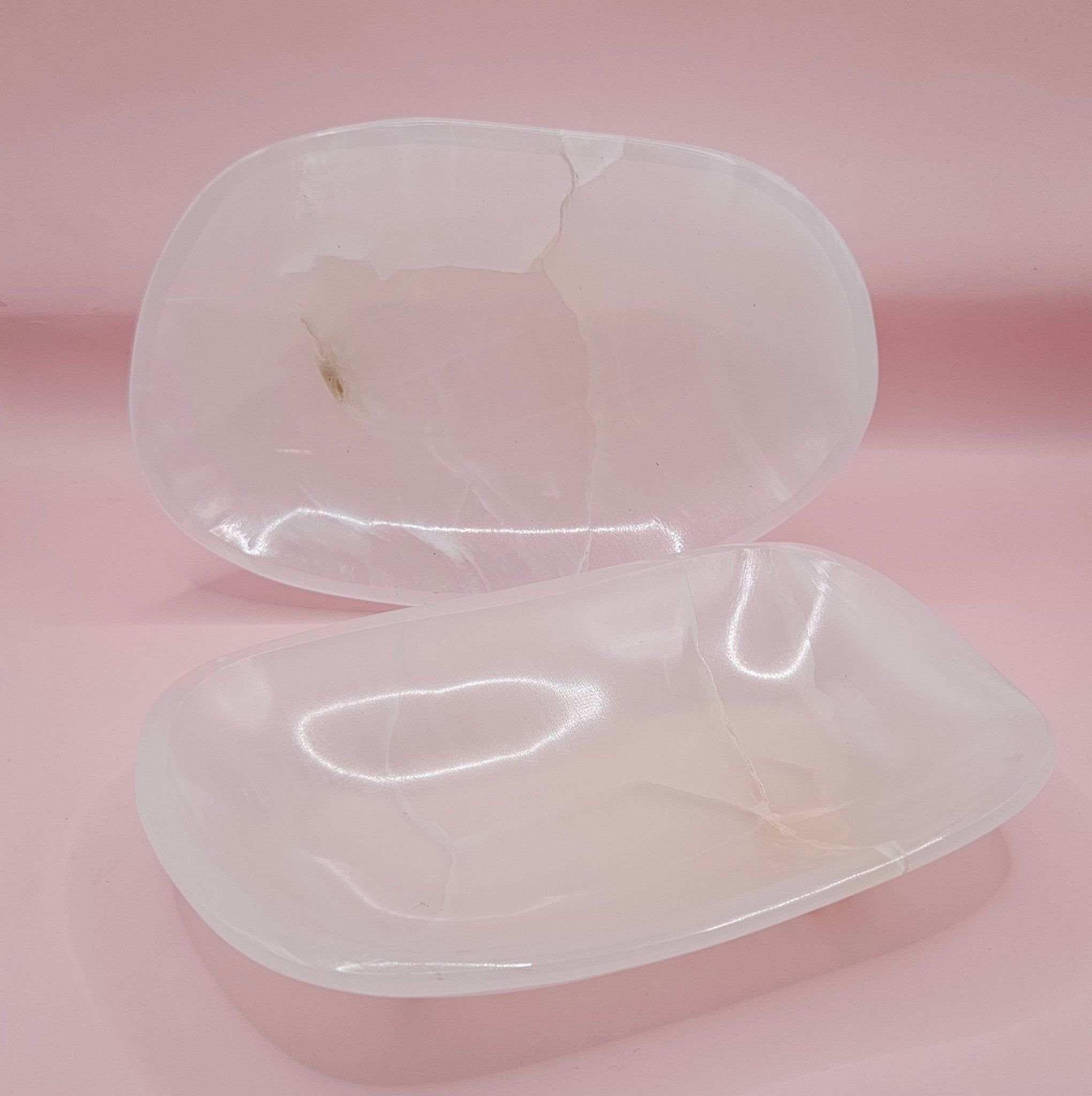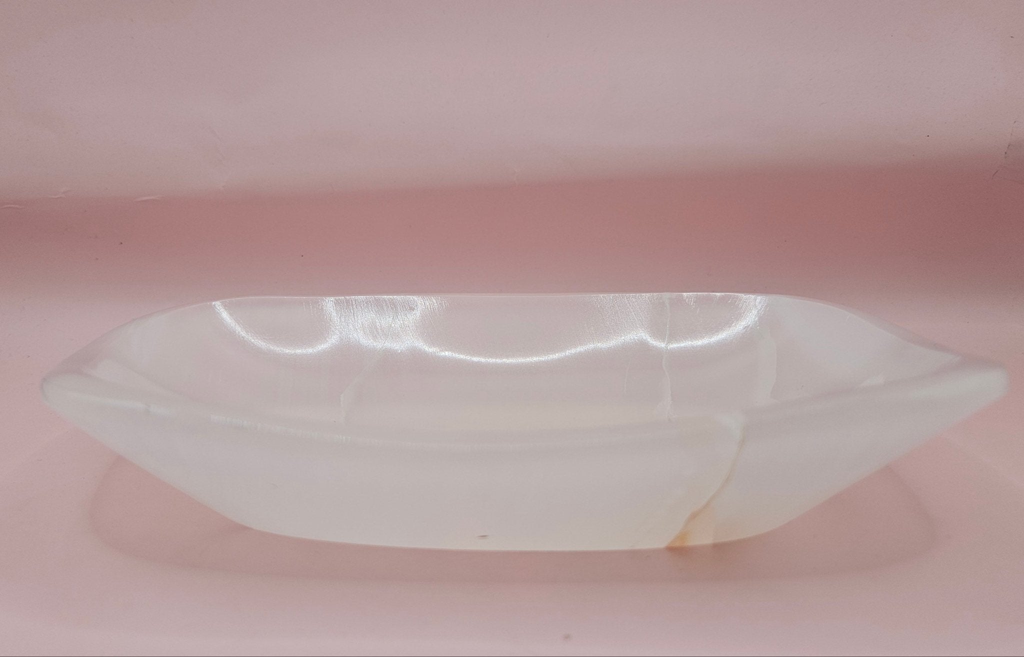 Understated and elegant, this approx. 7x4.5" polished onyx tray features soft white tones with wisps of translucent veining and gentle shape variations. Each piece is one-of-a-kind and sold individually—not part of a set—making it a unique addition to any curated space.