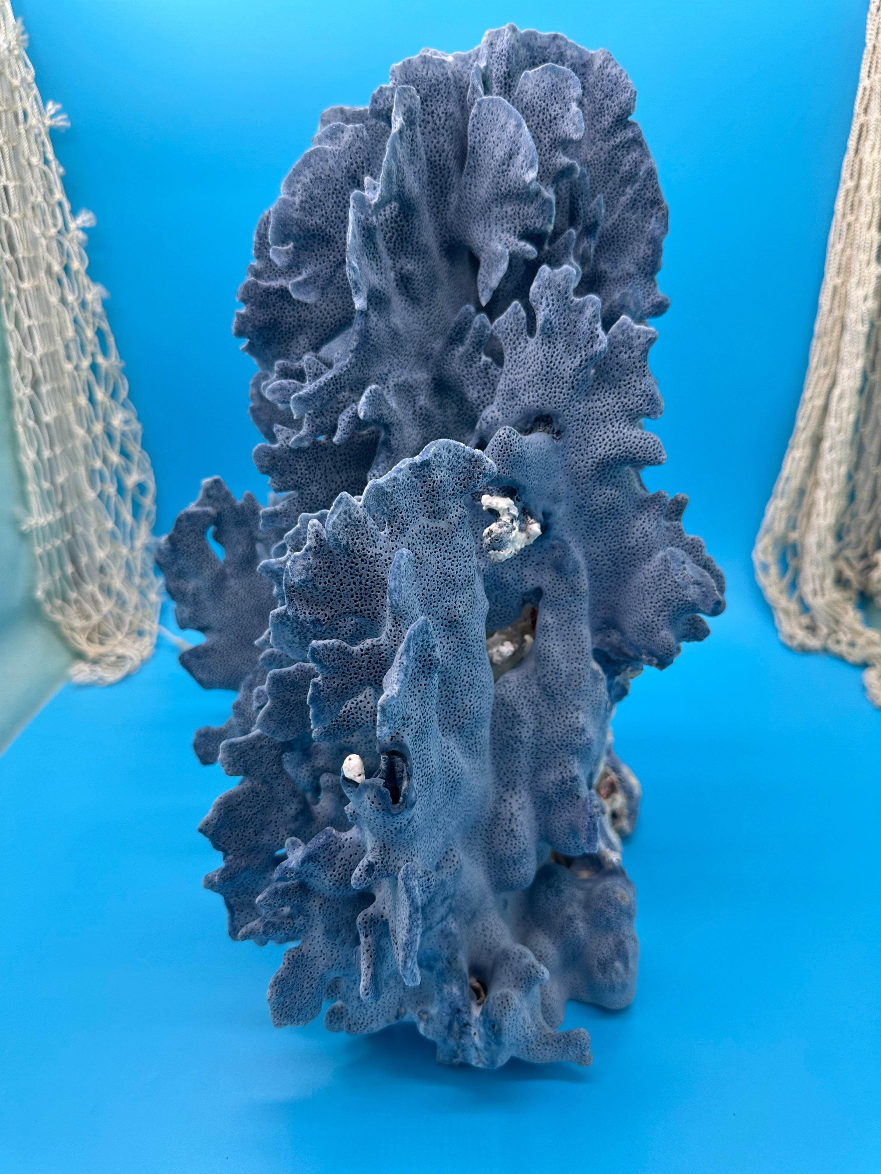 A commanding vintage Blue Ridge Coral specimen featuring a tall, dimensional structure with rich blue tones throughout. This substantial piece creates a dramatic coastal focal point with its layered, architectural form.