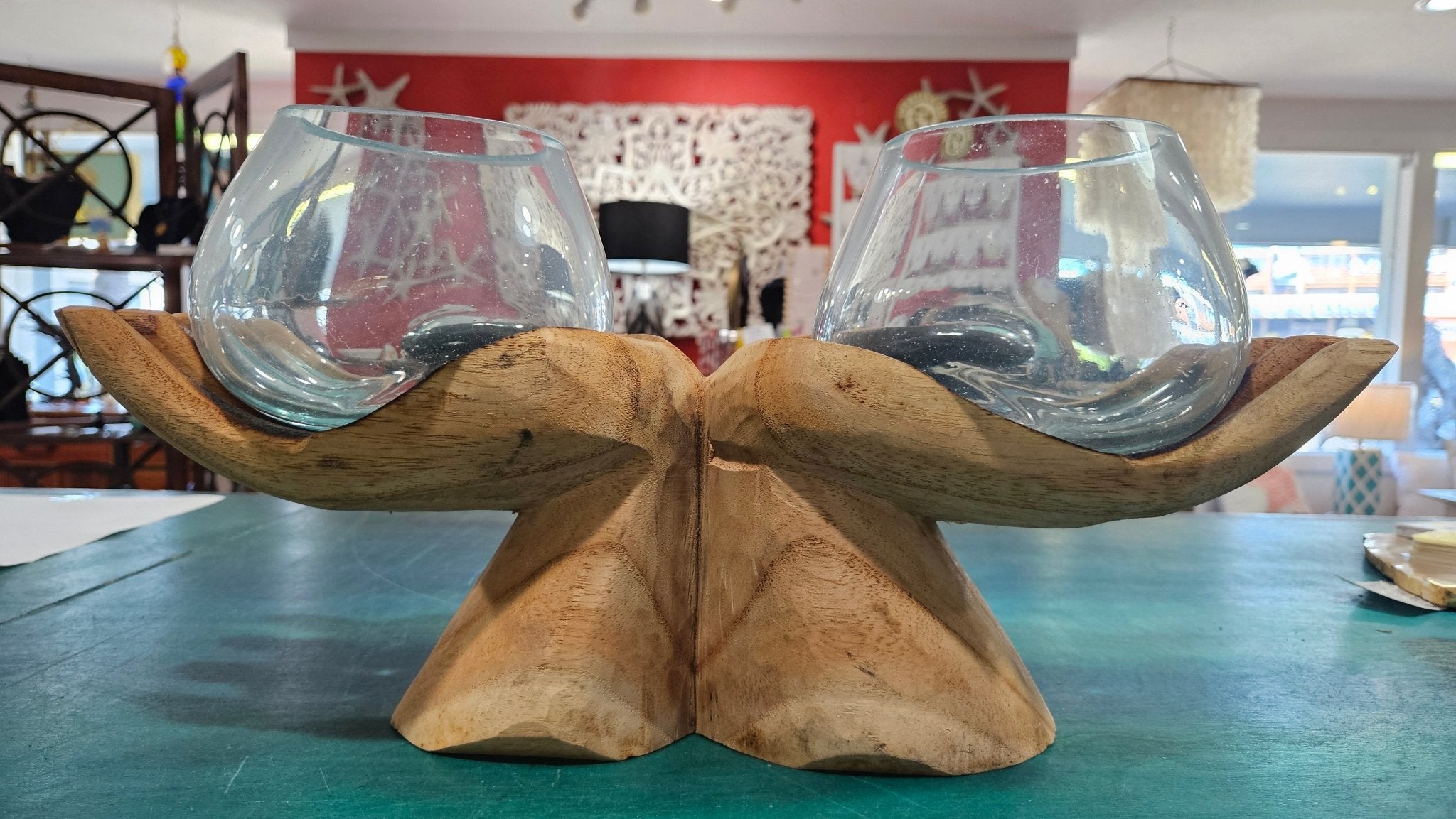 Bring warmth and artistry into your space with our Carved Wooden Hand and Molten Glass Terrarium. This handcrafted piece features a beautifully carved wooden hand base, symbolizing balance, support, and nature’s harmony. The molten glass is skillfully shaped over the wood, creating a seamless and unique design that blends organic textures with artistic elegance.