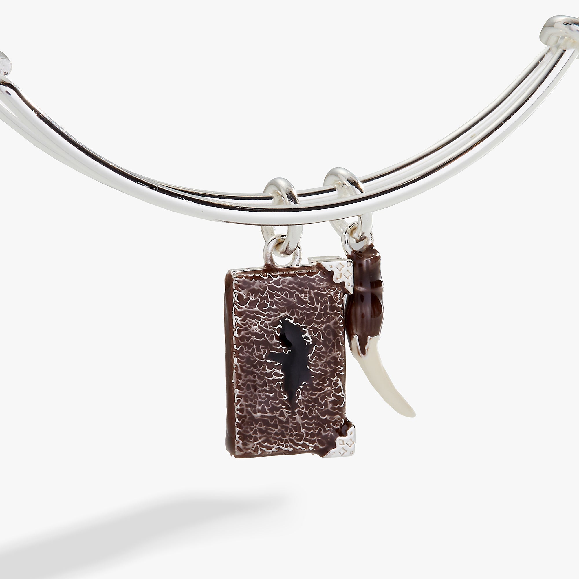 Tom Riddle’s diary isn’t just any diary — it’s one of Voldemort’s horcruxes. This HARRY POTTER™ charm bracelet features a charm of Tom Riddle’s diary, and also a charm of the basilisk fang Harry uses to destroy the diary, on an expandable wire bangle in antique silver finish. The diary is a three-dimensional charm with etched detailing and brown enamel; the fang is a three-dimensional charm made of translucent ombre enamel.