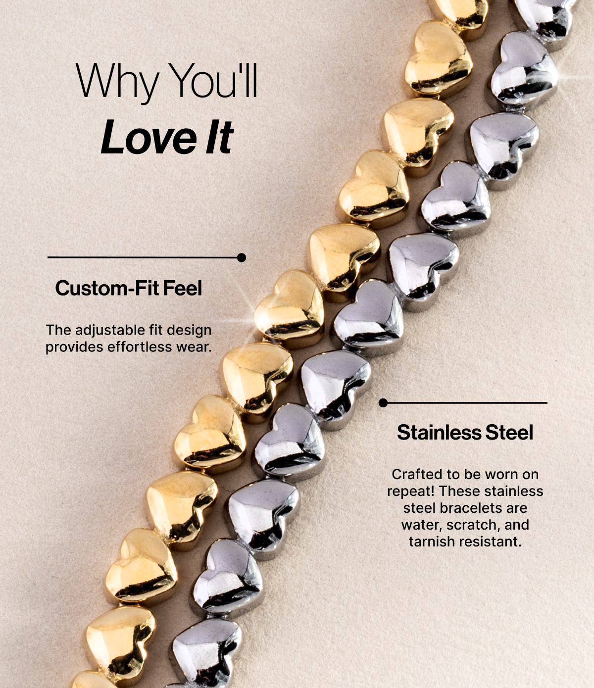 A symbol of love in all its forms, the heart isn’t just our emotional center — it’s where everything begins, and where everything returns. This Heart Charm Tennis Bracelet features heart charms inline on an adjustable-length bracelet. Because it’s silver-tone stainless steel, it’s durable and tarnish resistant for everyday wear. Layer it with other symbols of love as a reminder that with an open heart, all things are possible.