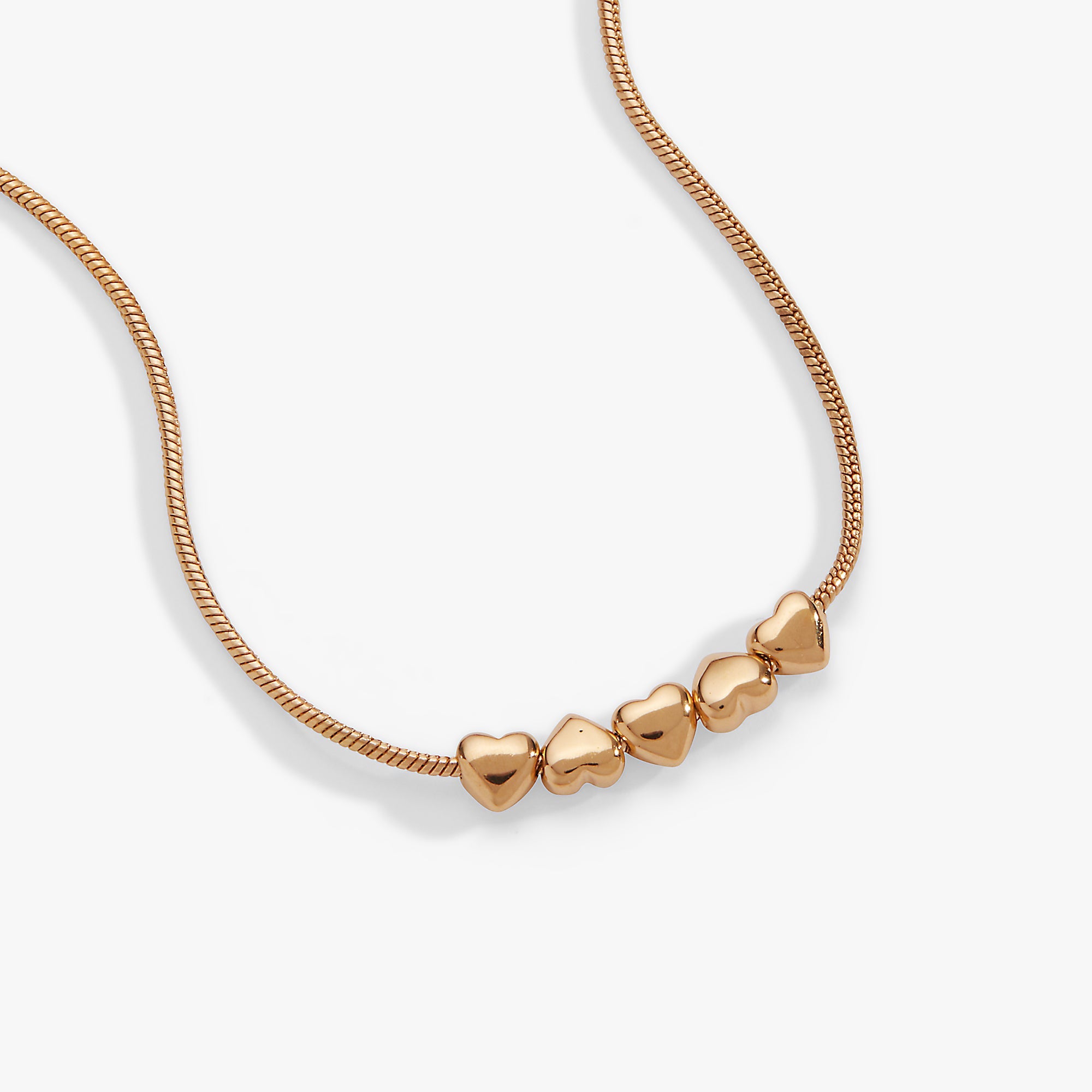 Meet your new favorite necklace—a playful mix of gold-plated brass and a silky snake chain dressed up with five adorable heart sliders. Watch them dance and drift along the chain whenever you move, creating a fun, interactive piece that's as delightful to touch as it is to wear. Perfect for adding a touch of whimsy to any day.
