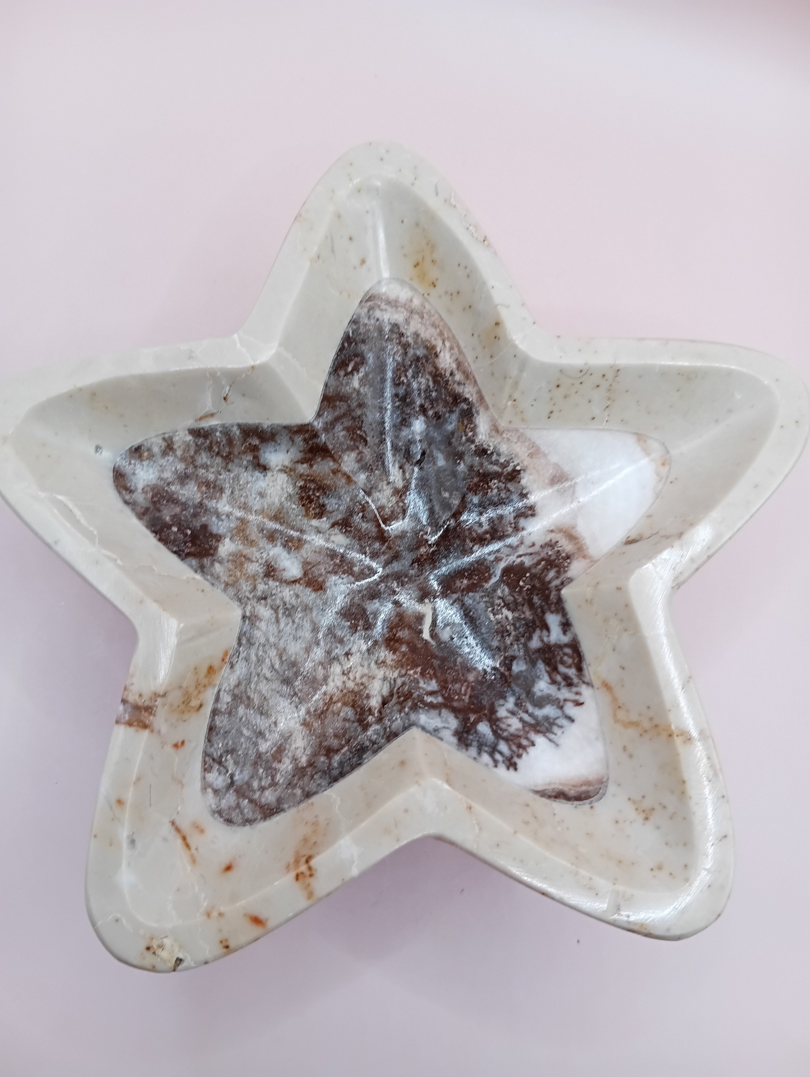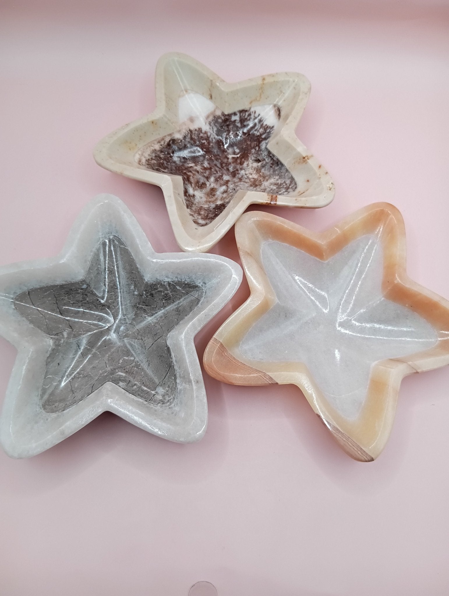 Bring a celestial charm to your space with our hand-carved Onyx Star Bowl. Each bowl is crafted from natural onyx stone and shaped into a five-point star, making it a stunning accent piece for any coastal, bohemian, or crystal-inspired decor. Use it as a trinket dish, jewelry holder, or a unique decorative piece.