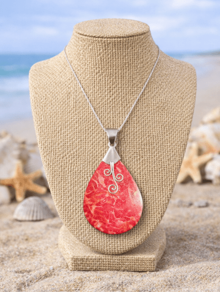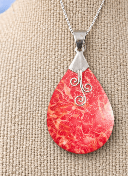This red coral teardrop pendant features vibrant natural color with beautiful organic marbling that makes every piece unique. The bold coral stone is accented with elegant sterling silver detailing, creating a striking pendant that adds warmth and color to any outfit.