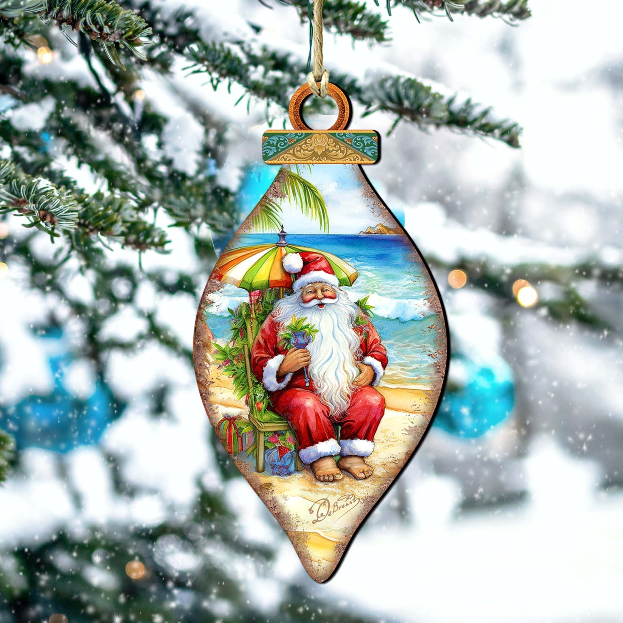 Decorate your coastal holiday with Santa on the Beach Decorations by G.Debrekht. Made from high-quality wood, these ornaments feature Santa taking a break on the beach. These expertly crafted and unique decorations bring a touch of whimsy and humor to your holiday decor.