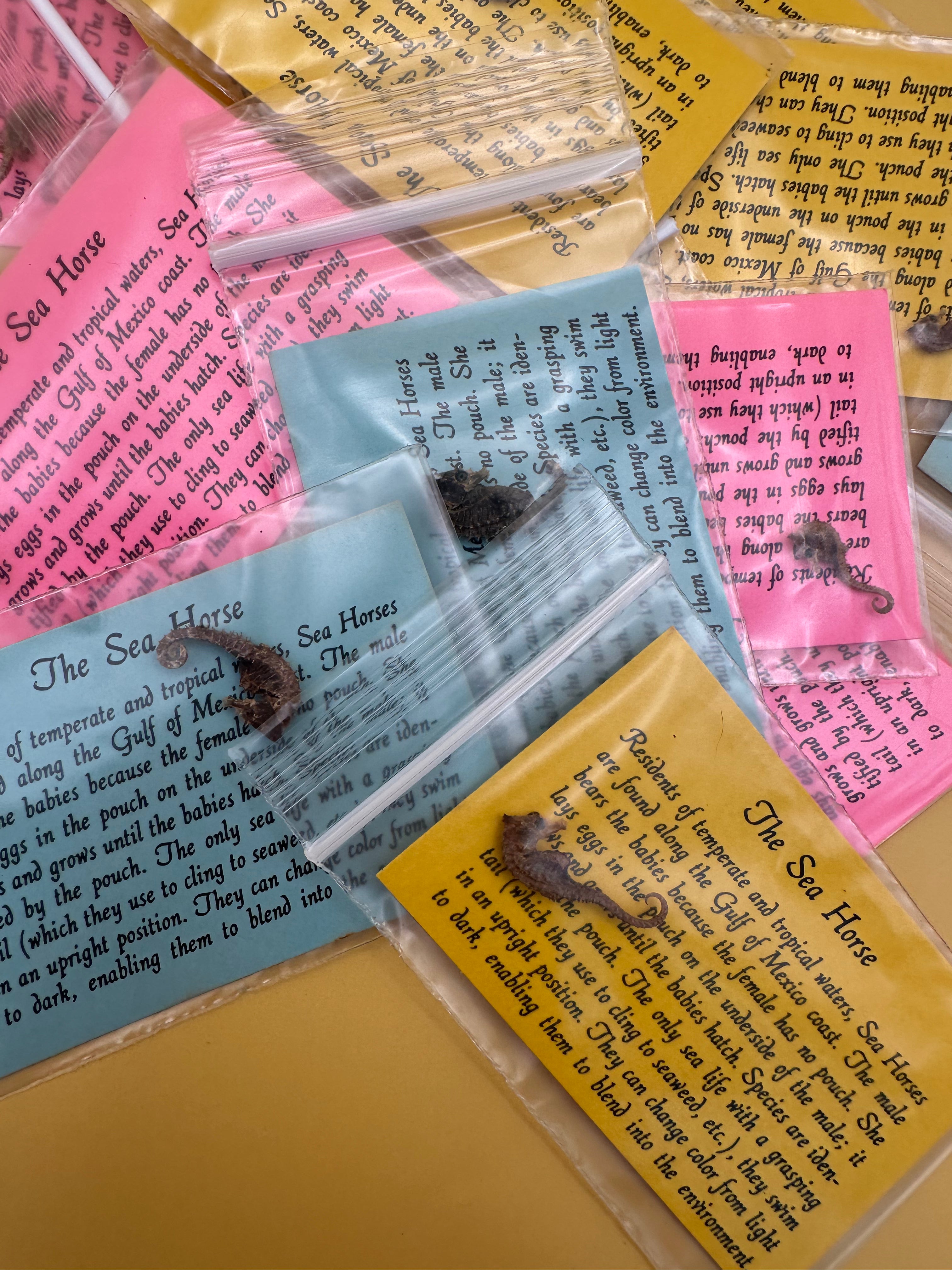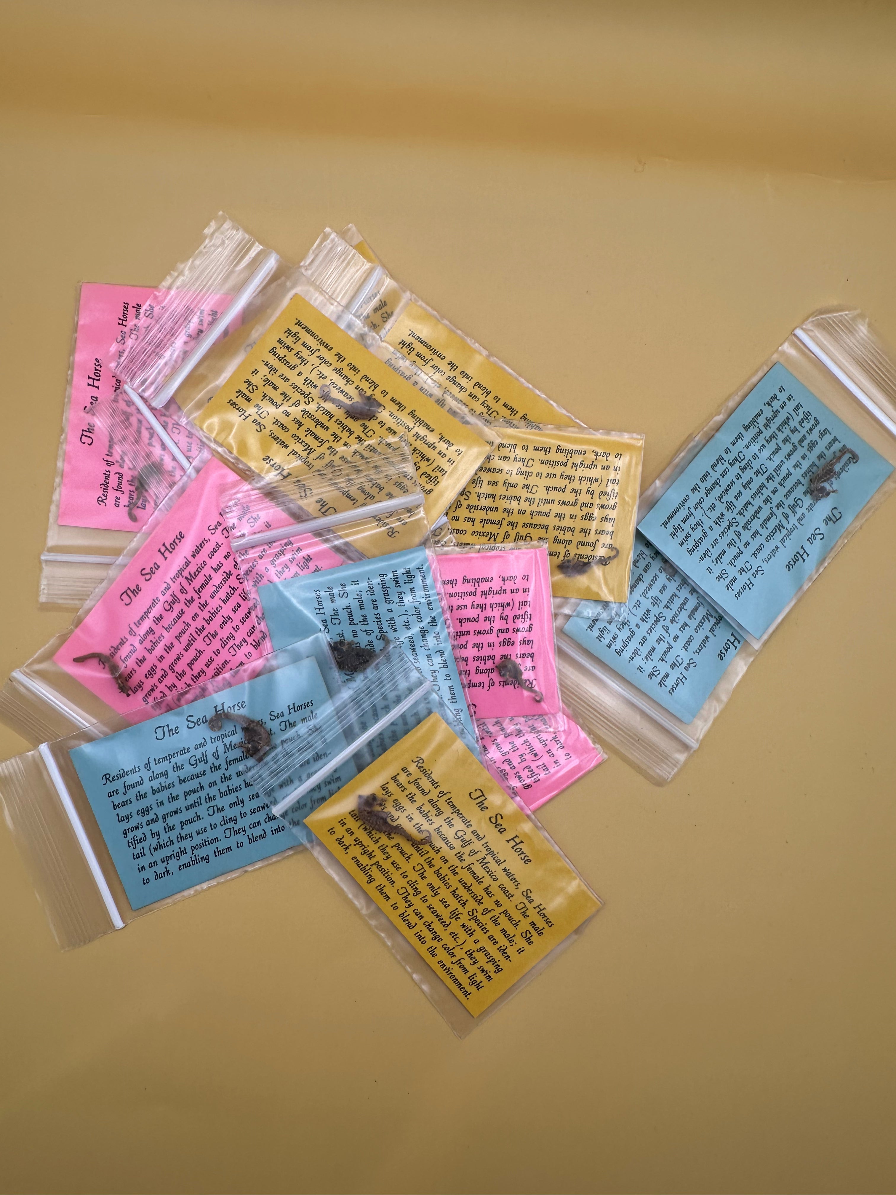 Each seahorse comes individually packaged with an educational fact card about seahorses. Card colors vary and are chosen at random. If you prefer a specific color, feel free to note it with your order; however, availability cannot be guaranteed.