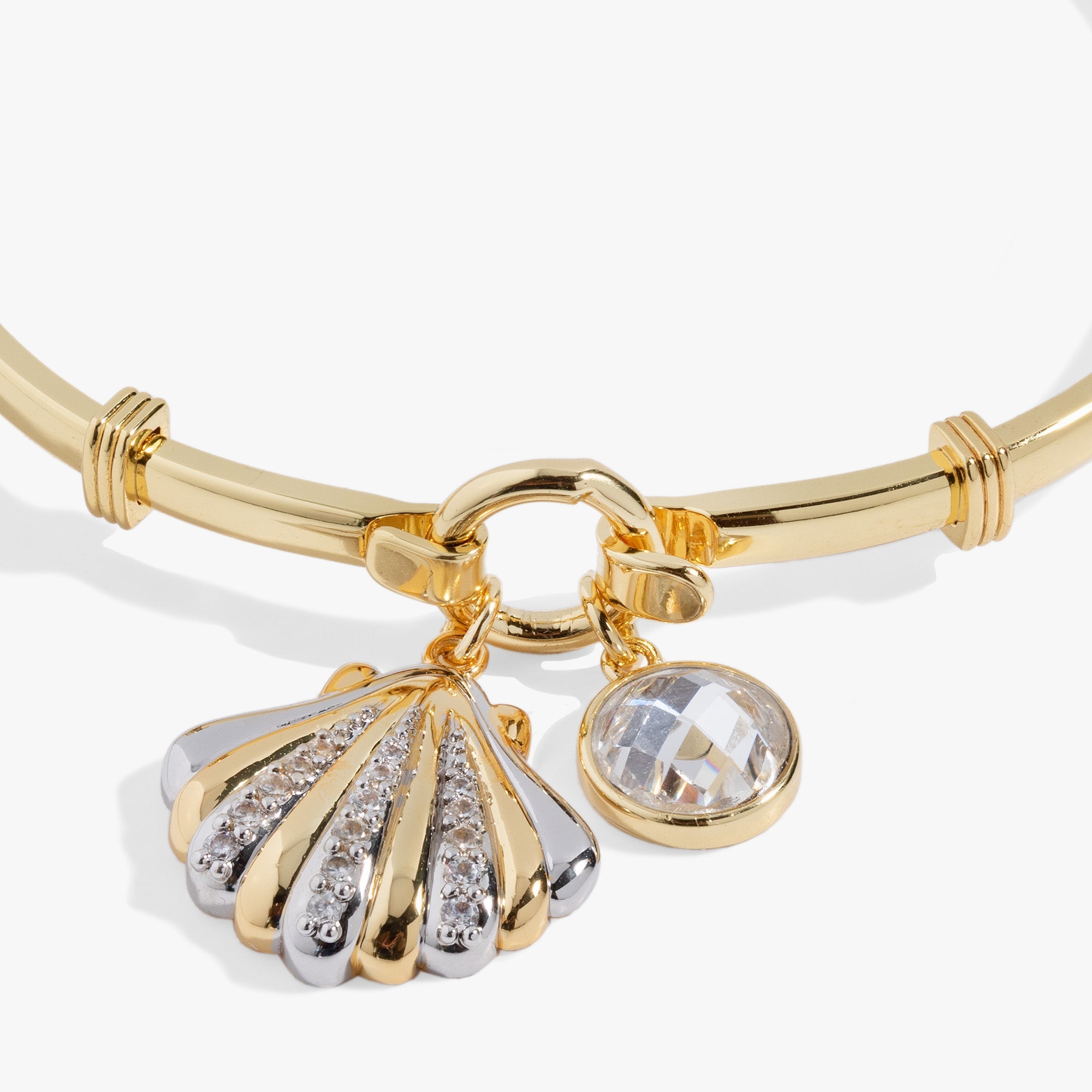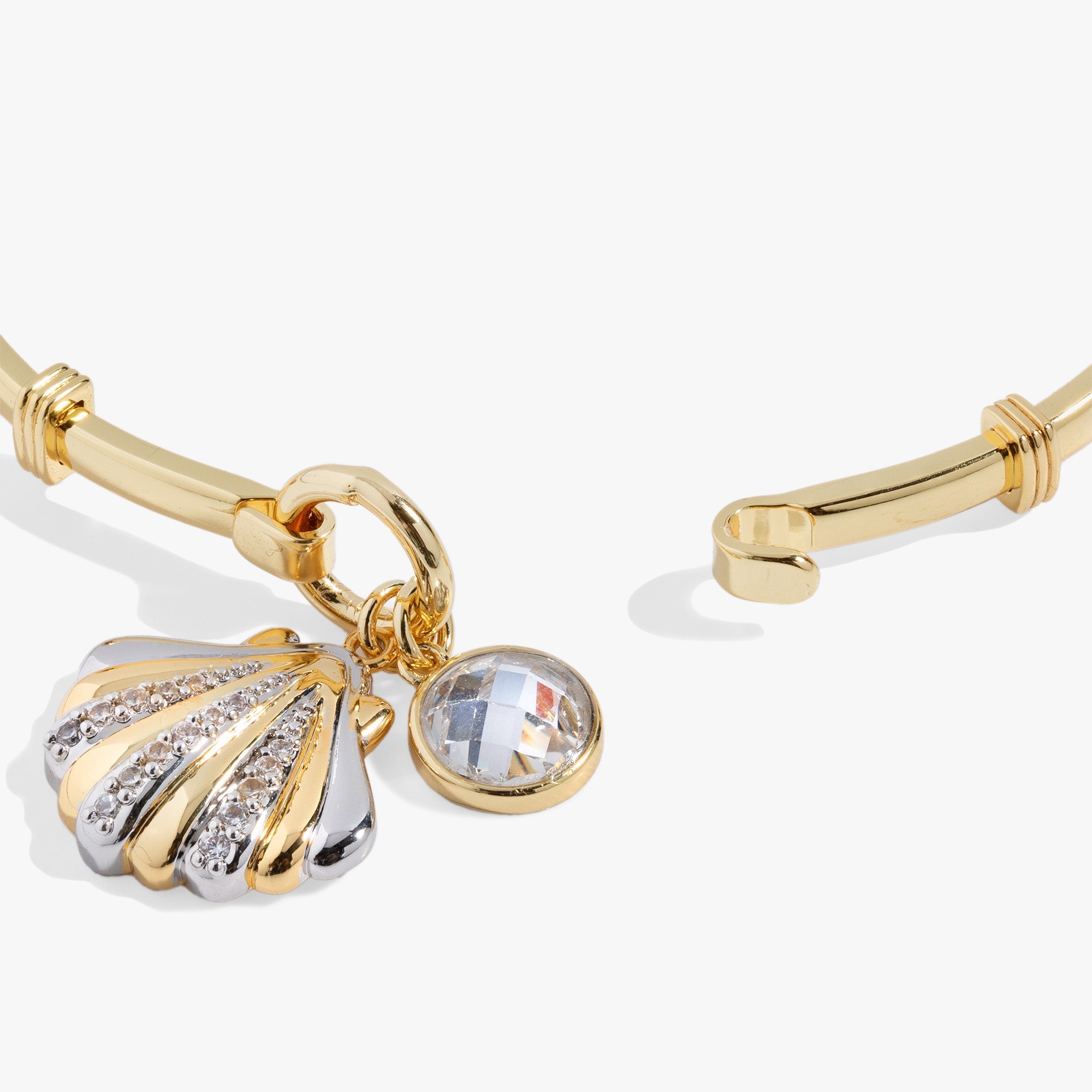 Elevate your summer stack and capture the essence of the ocean with this two-tone silver and gold Seashell Tension Bangle featuring pave crystal detailed scallop seashell charm and a faceted crystal charm on a tension clip bracelet.