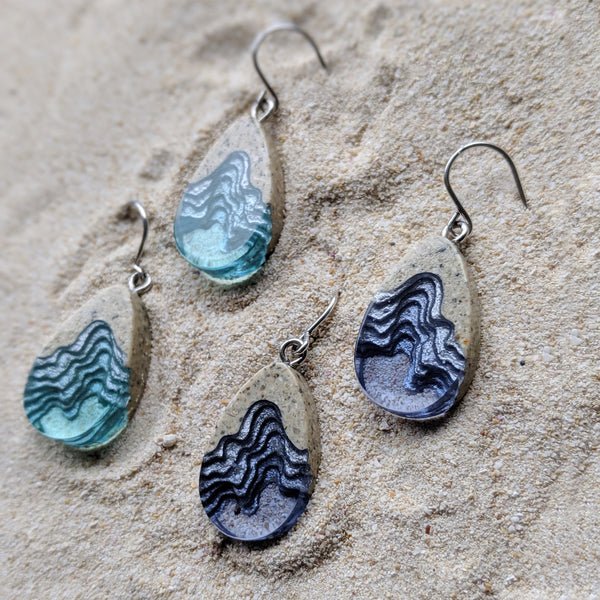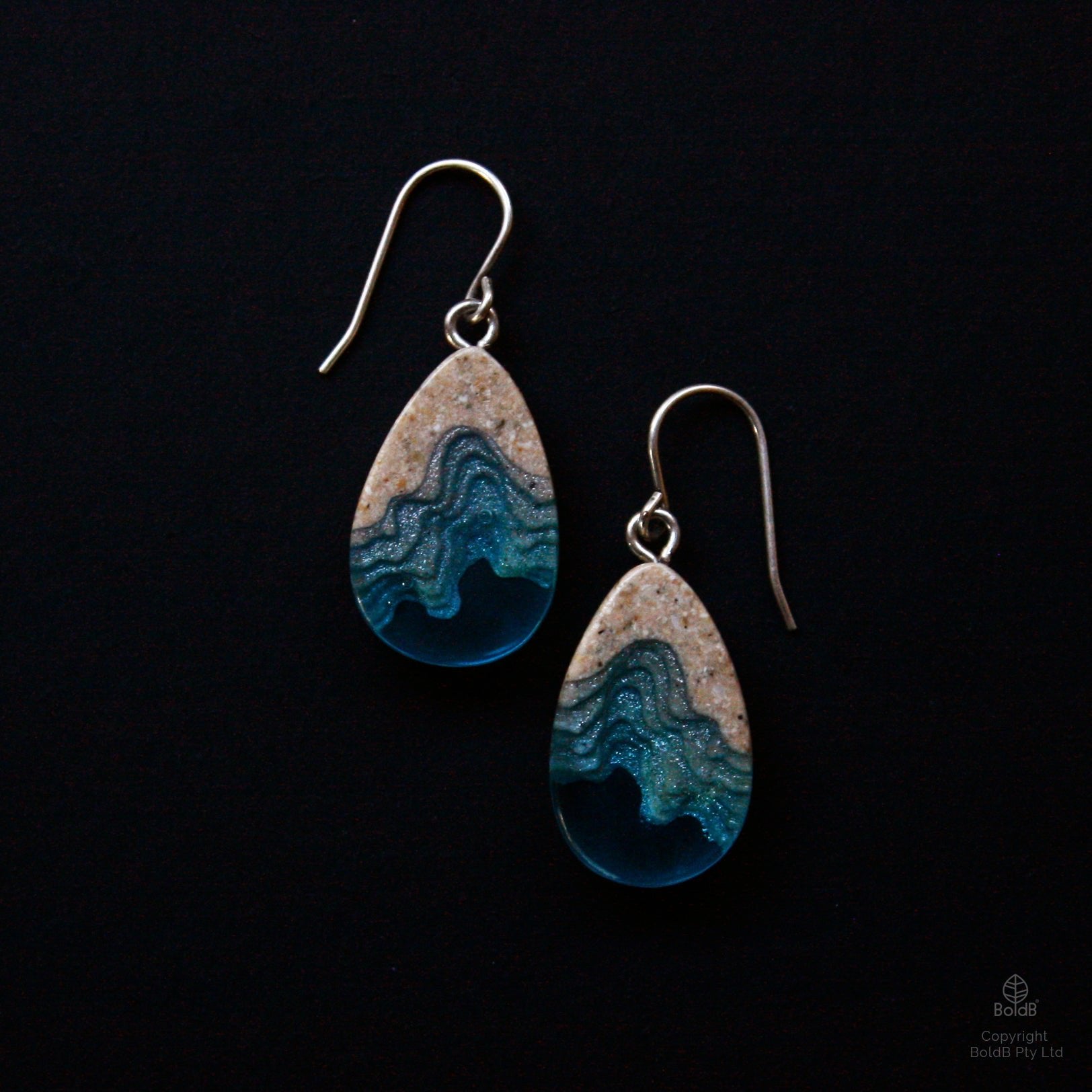 The Seashore Earrings capture the natural beauty of the coastline in a sleek, minimalist design. Each pair is handcrafted from bonded beach sand and resin in Aqua or Ultramarine hues, polished to a smooth, high-gloss finish that reflects the shimmer of the sea.