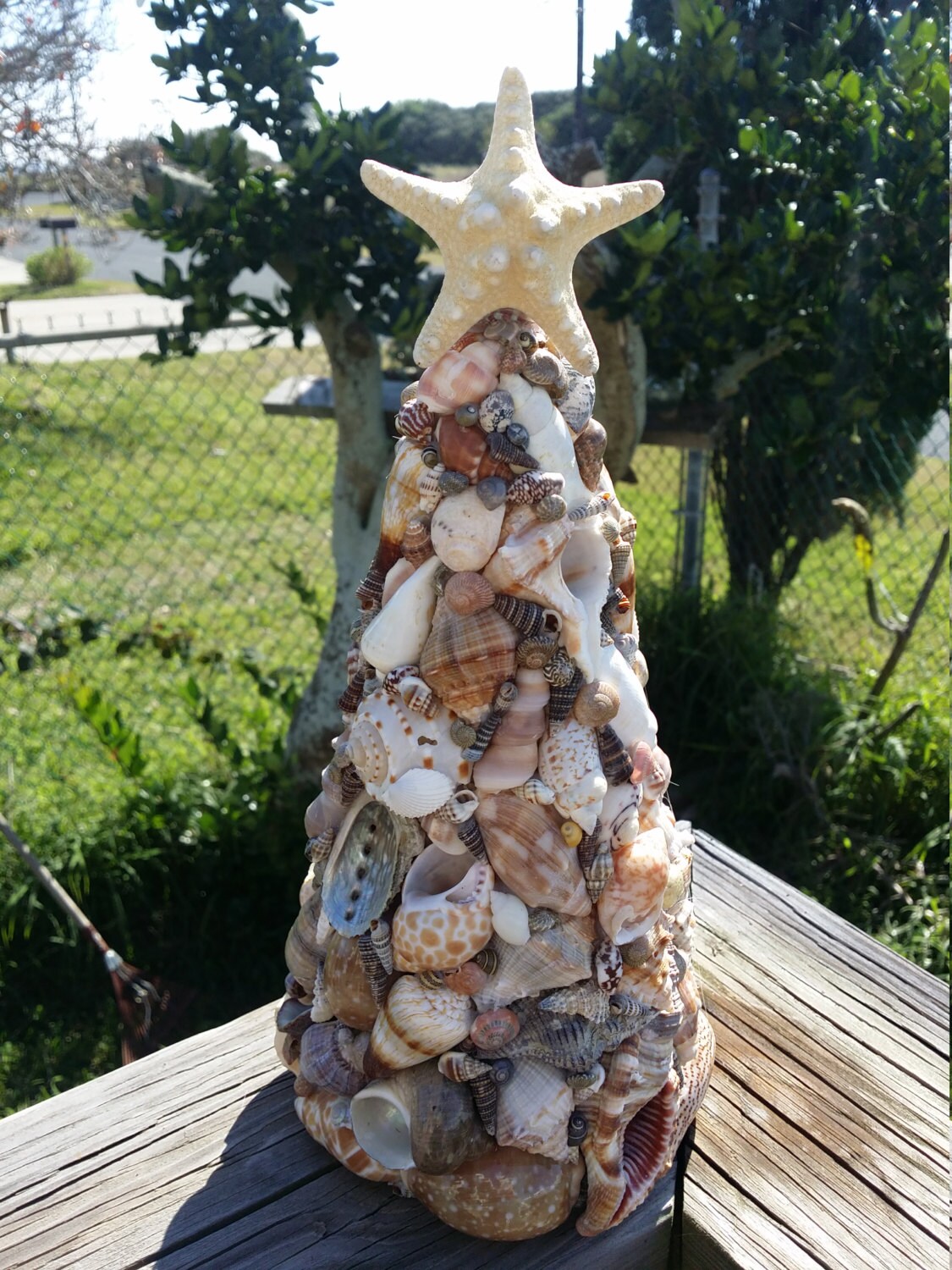 - Design: Shell tree adorned with various natural seashells and topped with a knobby starfish