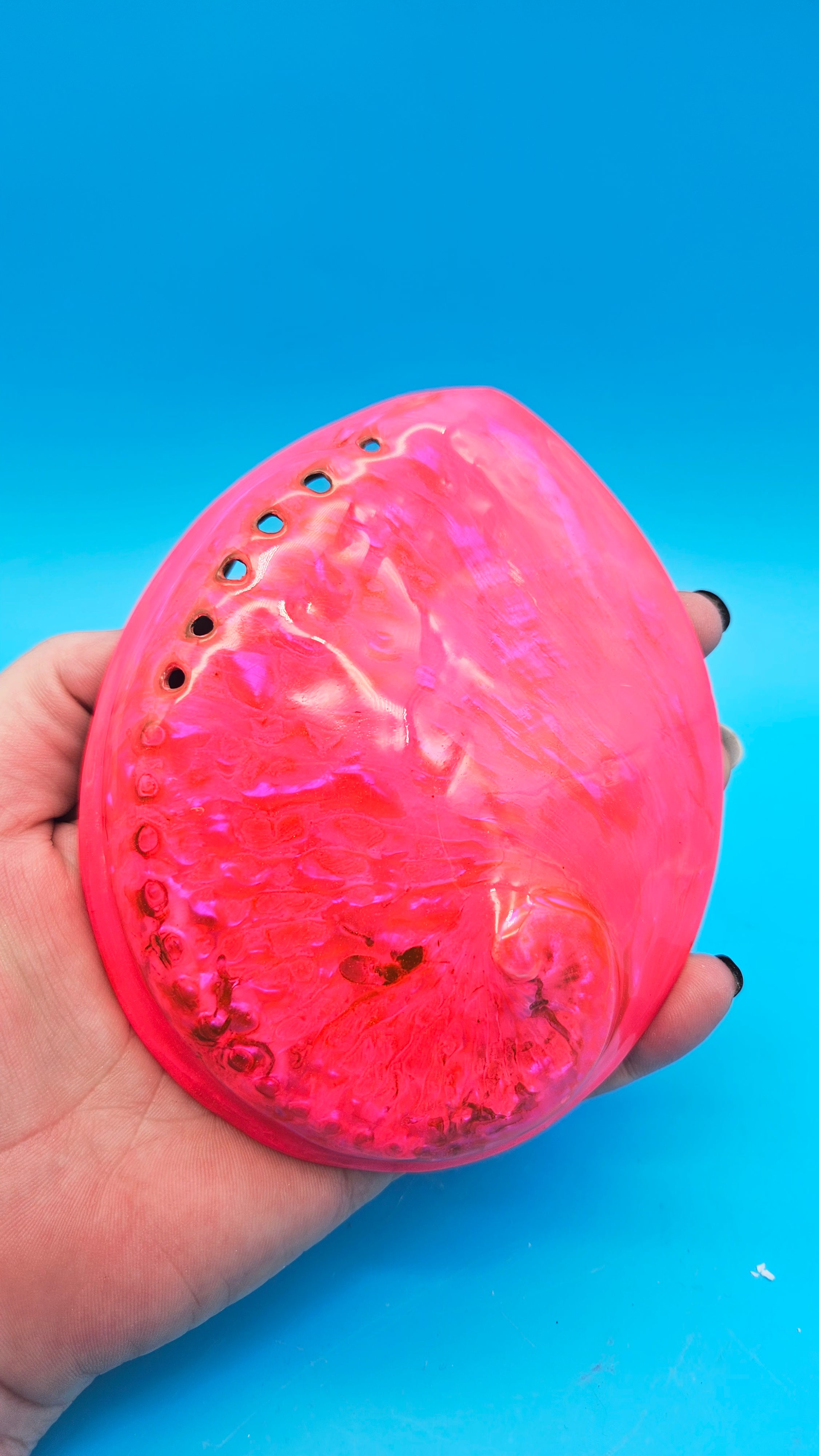 Add a burst of iridescent color to your space with this stunning Hot Pink Midas Abalone Shell. Sourced from natural abalone, the shell's exterior has been beautifully dyed and polished to a vibrant, glowing hot pink, contrasting with the natural, shimmering mother-of-pearl interior. Perfect for smudging, jewelry display, or as a unique, colorful piece of coastal decor.