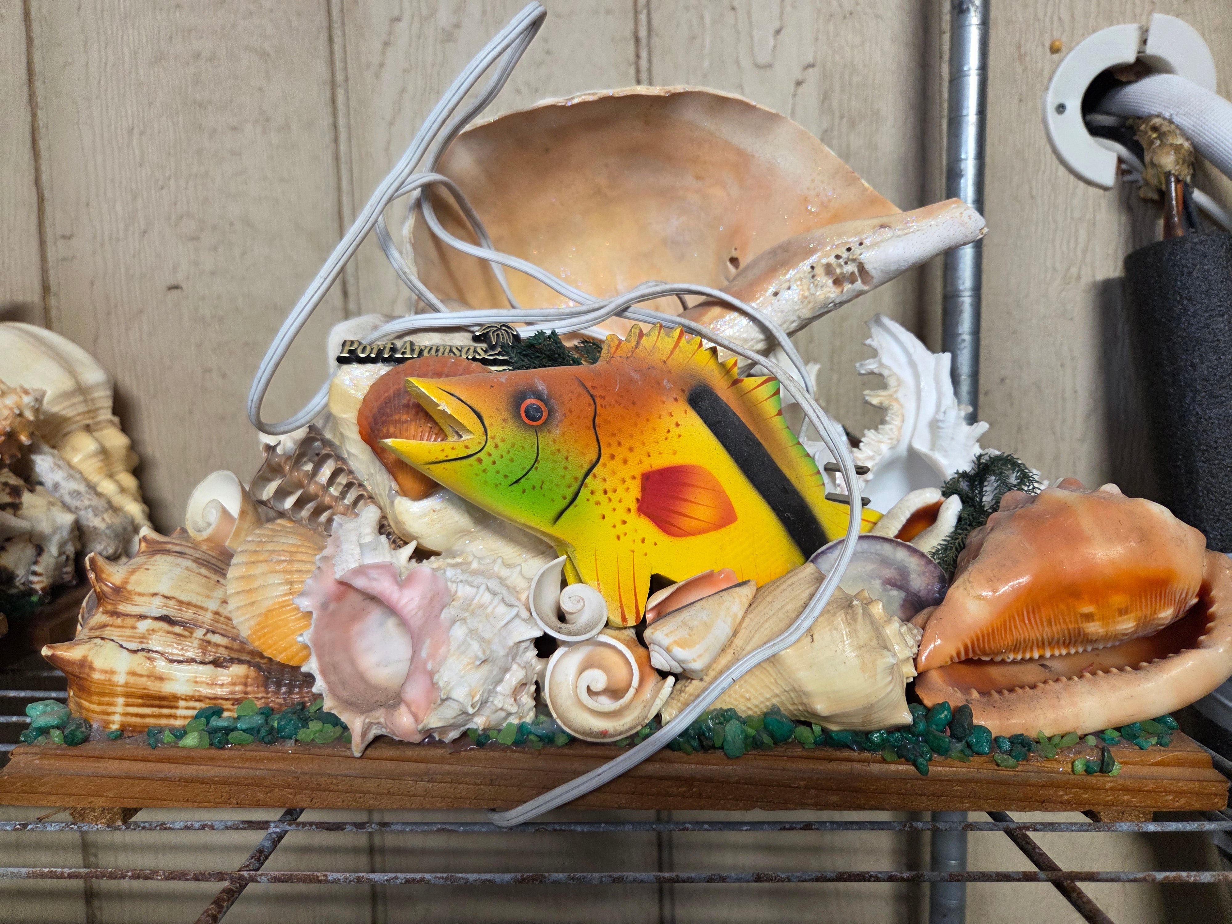 Vintage 1980's seashell light novelty. Created on a 15x5" solid wood base each features extra large 12-13" horse conch as well as a huge variety of other seashells & colorful wooden fish. Each is unique, no two alike.