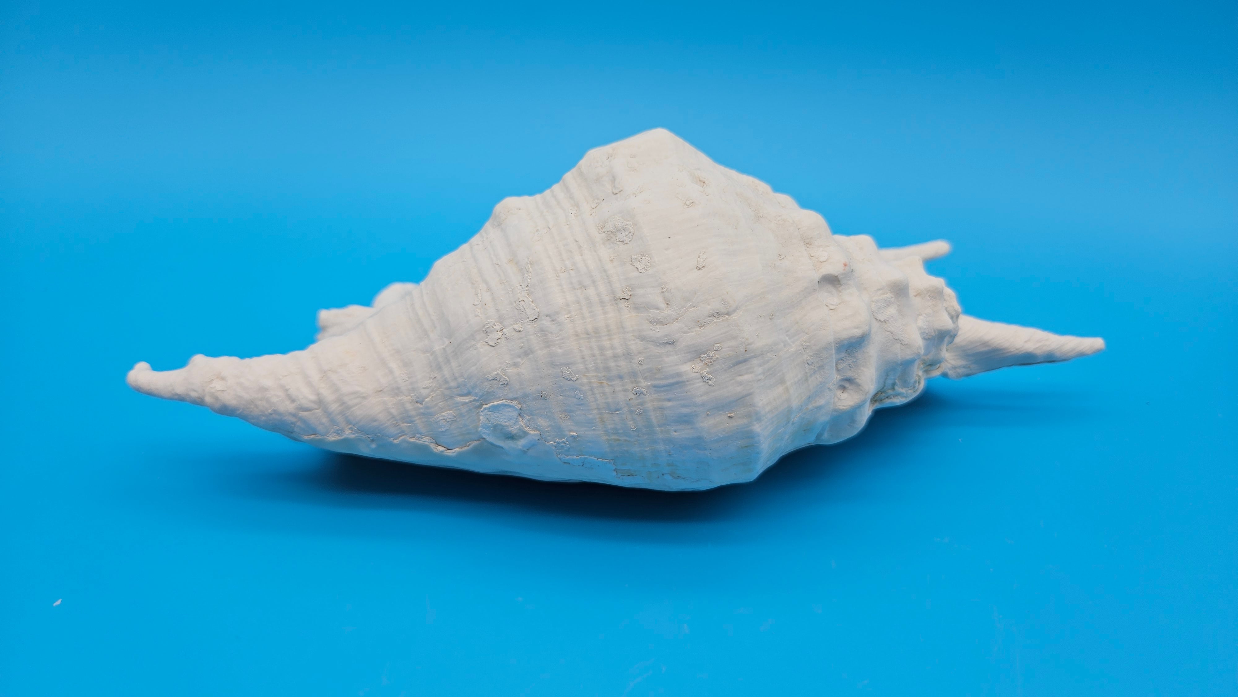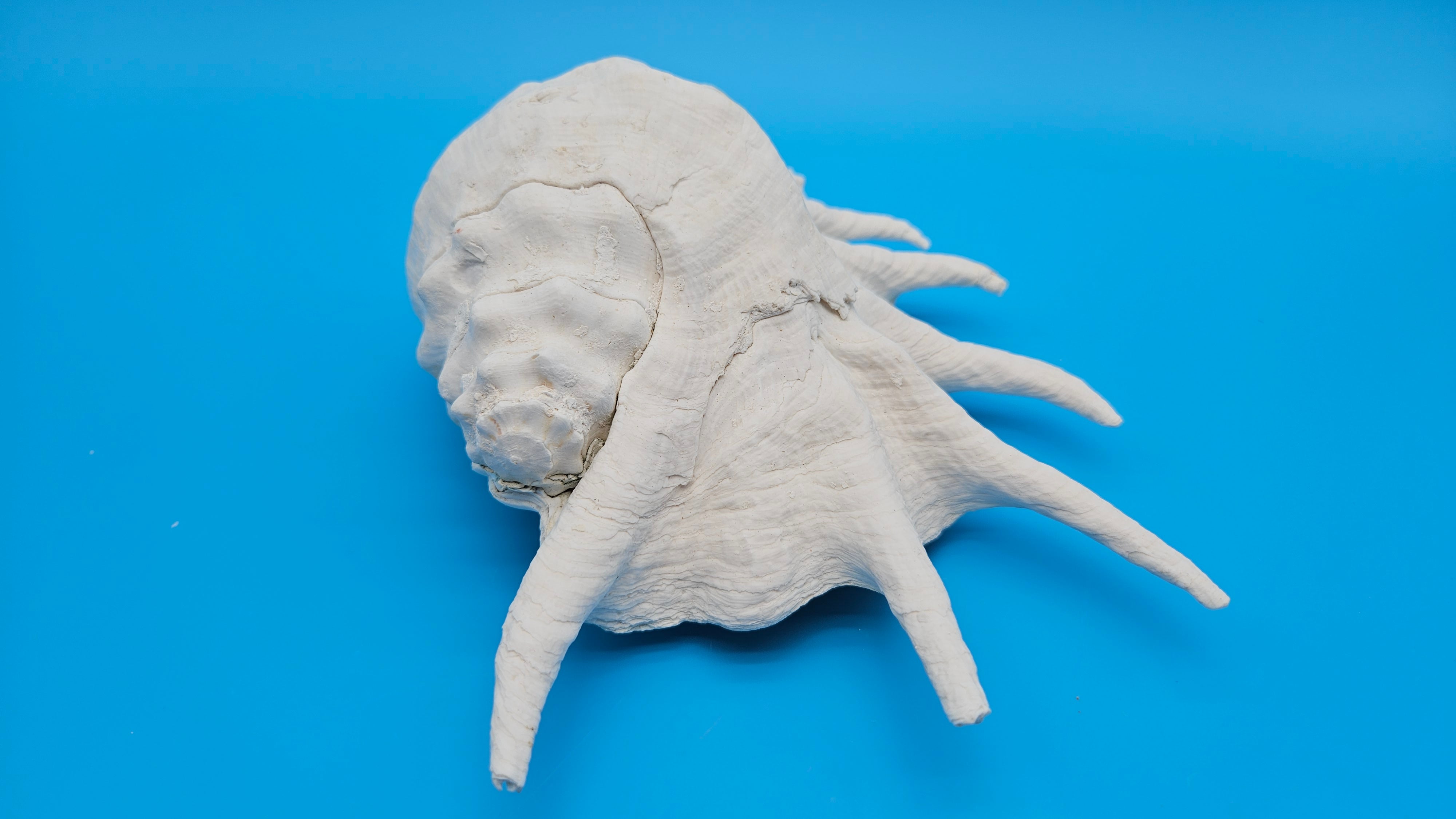 A striking Lambis truncata, or Giant Spider Conch, displaying bold flared points and creamy white hues. Its sculptural form captures the beauty of the sea, making it a standout natural piece for any shell collection.